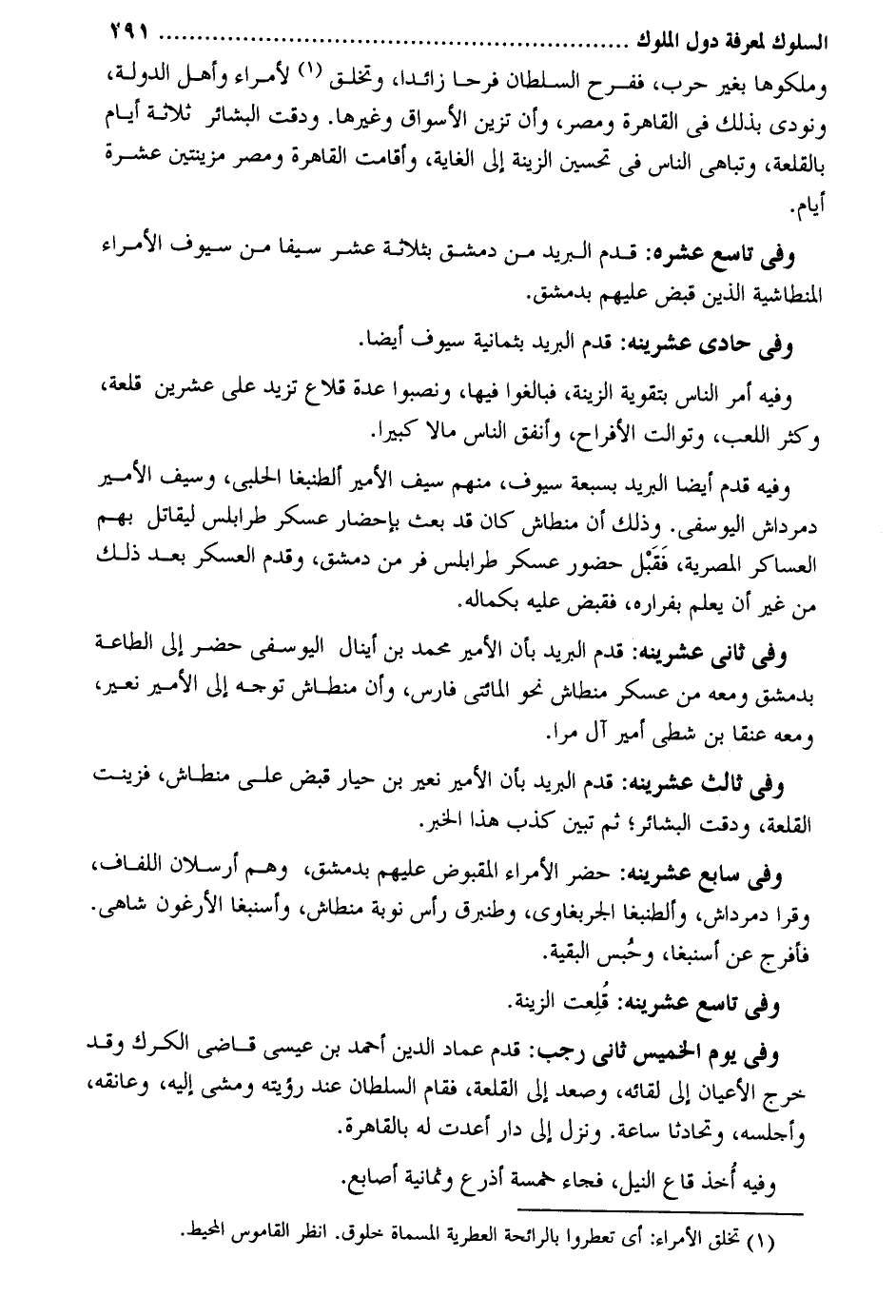 وملكوها بِغَيْر حَرْب ففرح السُّلْطَان فَرحا زَائِدا وتخلق الْأُمَرَاء وَأهل الدولة وَنُودِيَ بذلك فِي الْقَاهِرَة ومصر وَأَن تزين الْأَسْوَاق وَغَيرهَا. ودقت البشائر ثَلَاثَة أَيَّام بالقلعة وتباهى النَّاس فِي تَحْسِين الزِّينَة إِلَى الْغَايَة وأقامت الْقَاهِرَة ومصر مزينتين عشرَة أَيَّام. وَفِي تَاسِع عشره: قدم الْبَرِيد من دمشق بِثَلَاثَة عشر سَيْفا من سيوف الْأُمَرَاء المنطاشية الَّذين قبض عَلَيْهِم بِدِمَشْق. وَفِي حادي عشرينه: قدم الْبَرِيد بِثمَانِيَة سيوف أَيْضا. وَفِيه أَمر النَّاس بتقوية الزِّينَة فبالغوا فِيهَا ونصبوا عدَّة قلاع تزيد على عشْرين قلعة وَكثر اللّعب وتوالت الأفراح وَأنْفق النَّاس مَالا كَبِيرا. وَفِيه قدم أَيْضا الْبَرِيد بسبعة سيوف مِنْهُم سيف الْأَمِير ألطنبغا الْحلَبِي وَسيف الْأَمِير دمرداش اليوسفي. وَذَلِكَ أَن منطاش كَانَ قد بعث بإحضْار عَسْكَر طرابلس لِيُقَاتل بهم العساكر المصرية فَقَبْل حُضُور عَسْكَر طرابلس فر من دمشق وَقدم الْعَسْكَر بعد ذَلِك من غير أَن يعلم بفراره فَقبض عَلَيْهِ بِكَمَالِهِ. وَفِي ثَانِي عشرينه: قدم الْبَرِيد بِأَن الْأَمِير مُحَمَّد بن أينال اليوسفي حضر إِلَى الطَّاعَة بِدِمَشْق وَمَعَهُ من عَسْكَر منطاش نَحْو المائتي فَارس وَأَن منطاش توجه إِلَى الْأَمِير نعير وَمَعَهُ عنقًا بن شطى أَمِير آل مرا. وَفِي ثَالِث عشرينه: قدم الْبَرِيد بِأَن الْأَمِير نعير بن حيار قبض على منطاش فزينت القلعة ودقت البشائر ثمَّ تبين كذب هَذَا الْخَبَر. وَفِي سَابِع عشرينه: حضر الْأُمَرَاء الْمَقْبُوض عَلَيْهِم بِدِمَشْق وهم أرسلان اللفاف وقرا دمرداش وألطنبغا الجربغاوي وطنبرق رَأس نوبَة منطاش وأسنبغا الأرغون شاهي. فأفرج عَن أسنبغا وحُبس الْبَقِيَّة. وَفِي تَاسِع عشرينه: قُلِعت الزِّينَة. وَفِي يَوْم الْخَمِيس ثَانِي رَجَب: قدم عماد الدّين أَحْمد بن عِيسَى قَاضِي الكرك وَقد خرج الْأَعْيَان إِلَى لِقَائِه وَصعد إِلَى القلعة فَقَامَ السُّلْطَان عِنْد رُؤْيَته وَمَشى إِلَيْهِ وعانقه وَأَجْلسهُ وتحادثا سَاعَة. وَنزل إِلَى دَار أعدت لَهُ بِالْقَاهِرَةِ. وَفِيه أُخذ قاع النّيل فجَاء خَمْسَة أَذْرع وَثَمَانِية أَصَابِع.