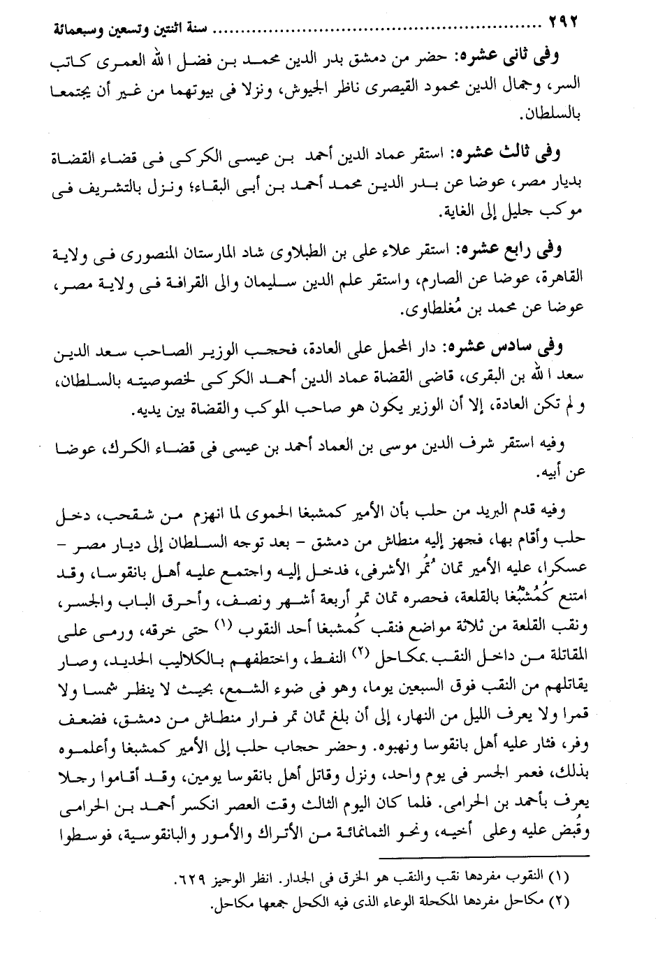 وَفِي ثَانِي عشره: حضر من دمشق بدر الدّين مُحَمَّد بن فضل الله الْعمريّ كَاتب السِّرّ وجمال الدّين مَحْمُود القيصري نَاظر الجيوش وَنزلا فِي بيوتهما من غير أَن يجتمعا بالسلطان. وَفِي ثَالِث عشره: اسْتَقر عماد الدّين أَحْمد بن عِيسَى الكركي فِي قَضَاء الْقُضَاة بديار مصر عوضا عَن بدر الدّين مُحَمَّد أَحْمد بن أبي الْبَقَاء وَنزل بالتشريف فِي موكب جليل إِلَى الْغَايَة. وَفِي رَابِع عشره: اسْتَقر عَلَاء عَليّ بن الطبلاوي شاد المارستان المنصوري فِي ولَايَة الْقَاهِرَة عوضا عَن الصارم وَاسْتقر علم الدّين سُلَيْمَان وَالِي القرافة فِي ولَايَة مصر عوضا عَن مُحَمَّد بن مُغلطاوي. وَفِي سادس عشره: دَار الْمحمل على الْعَادة فحجب الْوَزير الصاحب سعد الدّين سعد الله بن البقري قَاضِي الْقُضَاة عماد الدّين أَحْمد الكركي لخصوصيته بالسلطان وَلم تكن الْعَادة إِلَّا أَن الْوَزير يكون هُوَ صَاحب الموكب والقضْاة بَين يَدَيْهِ. وَفِيه اسْتَقر شرف الدّين مُوسَى بن الْعِمَاد أَحْمد بن عِيسَى فِي قَضَاء الكرك عوضا عَن أَبِيه. وَفِيه قدم الْبَرِيد من حلب بِأَن الْأَمِير كمشبغا الْحَمَوِيّ لما انهزم من شقحب دخل حلب وَأقَام بهَا فَجهز إِلَيْهِ منطاش من دمشق - بعد توجه السُّلْطَان إِلَى ديار مصر - عسكراً عَلَيْهِ الْأَمِير تمانُ تمُر الأشرفي فَدخل إِلَيْهِ وَاجْتمعَ عَلَيْهِ أهل بانقوسا وَقد امْتنع كُمُشبغا بالقلعة فحصره تمان تمر أَرْبَعَة أشهر وَنصف وأحرق الْبَاب والجسر ونقب القلعة من ثَلَاثَة مَوَاضِع فَنقبَ كُمشبغا أحد النقوب حَتَّى خرقه وَرمى على المقاتة من دَاخل النقب بمكاحل النفط واختطفهم بالكلاليب الْحَدِيد وَصَارَ يقاتلهم من النقب فَوق السّبْعين يَوْمًا وَهُوَ فِي ضوء الشمع بِحَيْثُ لَا ينظر شمسا وَلَا قمرا وَلَا يعرف اللَّيْل من النَّهَار إِلَى أَن بلغ تمان تمر فرار منطاش من دمشق فضعف وفر فثار عَلَيْهِ أهل بانقوسا ونهبوه. وَحضر حجاب حلب إِلَى الْأَمِير كمشبغا وأعلموه بذلك فعمر الجسر فِي يَوْم وَاحِد وَنزل وَقَاتل أهل بانقوسا يَوْمَيْنِ وَقد أَقَامُوا رجلا يعرف بِأَحْمَد بن الحرامي. فَلَمَّا كَانَ الْيَوْم الثَّالِث وَقت الْعَصْر انْكَسَرَ أَحْمد بن الحرامي وقُبض عَلَيْهِ وعَلى أَخِيه وَنَحْو الثَّمَانمِائَة من الأتراك والأمور والبانقوسية فوسطوا