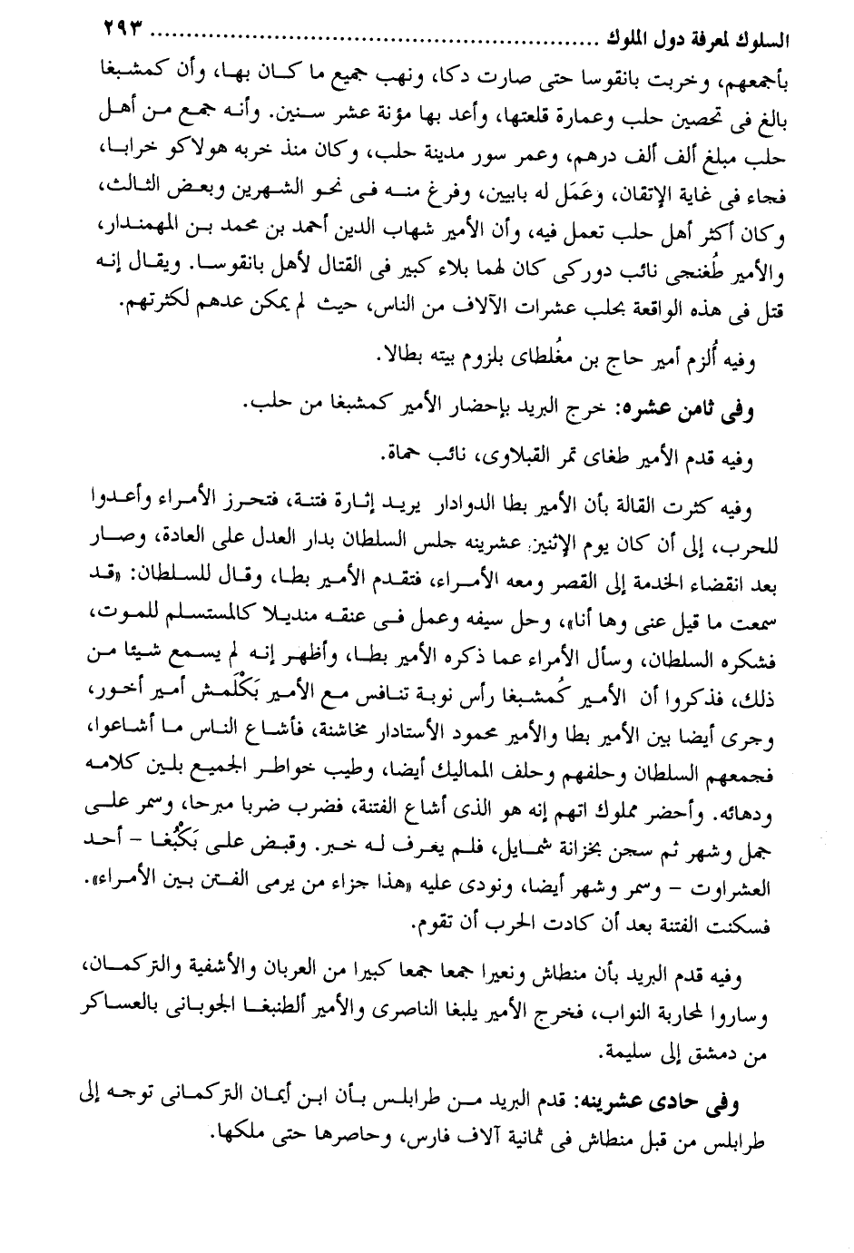 بأجمعهم وَخَربَتْ بانقوسا حَتَّى صَارَت دكا وَنهب جَمِيع مَا كَانَ بهَا وَأَن كمشبغا بَالغ فِي تحصين حلب وَعمارَة قلعتها وَأعد بهَا مُؤنَة عشر سِنِين. وَأَنه جمع من أهل حلب مبلغ ألف ألف دِرْهَم وَعمر سور مَدِينَة حلب وَكَانَ مُنْذُ خربه هولاكو خراباً فجَاء فِي غَايَة الإتقان وعَمَل لَهُ بَابَيْنِ وَفرغ مِنْهُ فِي نَحْو الشَّهْرَيْنِ وَبَعض الثَّالِث وَكَانَ أَكثر أهل حلب تعْمل فِيهِ وَا ن الْأَمِير شهَاب الدّين أَحْمد بن مُحَمَّد بن المهمندار والأمير طُغنجي نَائِب دوركي كَانَ لَهما بلَاء كَبِير فِي الْقِتَال لأهل بانقوسا. وَيُقَال إِنَّه قتل فِي هَذِه الْوَاقِعَة بحلب عشرات الآلاف من النَّاس حَيْثُ لم يُمكن عدهم لكثرتهم. وَفِيه أُلزم أَمِير حَاج بن مغُلطاي بِلُزُوم بَيته بطالاً. وَفِي ثامن عشره: خرج الْبَرِيد بإحضار الْأَمِير كمشبغا من حلب. وَفِيه قدم الْأَمِير طغاي تمر القبلاوي نَائِب حماة. وَفِيه كثرت القالة بِأَن الْأَمِير بطا الدوادار يُرِيد إثارة فتْنَة فتحرز الْأُمَرَاء وَأَعدُّوا للحرب إِلَى أَن كَانَ يَوْم الِاثْنَيْنِ: عشرينه جلس السُّلْطَان بدار الْعدْل على الْعَادة وَصَارَ بعد انْقِضَاء الْخدمَة إِلَى الْقصر وَمَعَهُ الْأُمَرَاء فَتقدم الْأَمِير بطا وَقَالَ للسُّلْطَان: قد سَمِعت مَا قيل عني وَهَا أَنا وَحل سَيْفه وَعمل فِي عُنُقه منديلا كالمستسلم للْمَوْت فشكره السُّلْطَان وَسَأَلَ الْأُمَرَاء عَمَّا ذكره الْأَمِير بطا وَأظْهر إِنَّه لم يسمع شَيْئا من ذَلِك فَذكرُوا أَن الْأَمِير كُمشبغا رَأس نوبَة تنافس مَعَ الْأَمِير بَكْلَمش أَمِير أخور وَجرى أَيْضا بَين الْأَمِير بطا والأمير مَحْمُود الأستادار مخاشنة فأشاع النَّاس مَا أشاعوا فَجَمعهُمْ السُّلْطَان وحلفهم وَحلف المماليك أَيْضا وَطيب خواطر الْجَمِيع بلين كَلَامه ودهائه. وأحضر مَمْلُوك اتهمَ أَنه هُوَ الَّذِي أشاع الْفِتْنَة فَضرب ضربا مبرحاً وَسمر على جمل وَشهر ثمَّ سجن بخزانة شمايل فَلم يعرف لَهُ خبر. وَقبض على بَكْبُغا - أحد العشراوت - وَسمر وَشهر أَيْضا وَنُودِيَ عَلَيْهِ هَذَا جَزَاء من يَرْمِي الْفِتَن بَين الْأُمَرَاء. فسكنت الْفِتْنَة بعد أَن كَادَت الْحَرْب أَن تقوم. وَفِيه قدم الْبَرِيد بِأَن منطاش ونعيرا جمعا جمعا كَبِيرا من العربان والأشفية والتركمان وَسَارُوا لمحاربة النواب فَخرج الْأَمِير يلبغا الناصري والأمير ألطبغا الجوباني بالعساكر من دمشق إِلَى سليمَة. وَفِي حادي عشرينه: قدم الْبَرِيد من طرابلس بِأَن ابْن أَيْمَان التركماني توجه إِلَى طرابلس من قبل منطاش فِي ثَمَانِيَة آلَاف فَارس، وحاصرها حَتَّى ملكهَا.