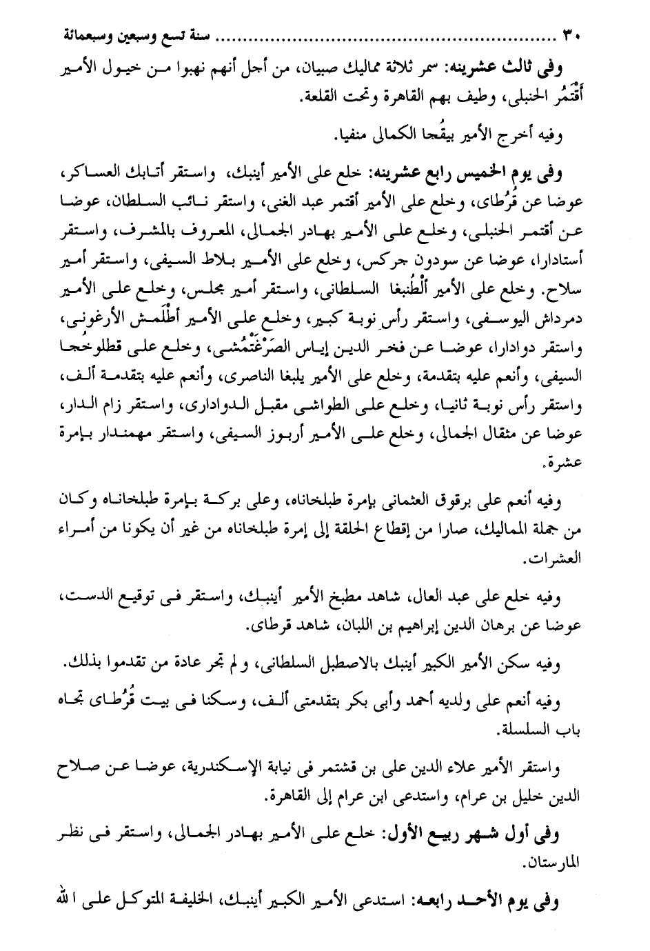 وَفِي ثَالِث عشرينه: سمر ثَلَاثَة مماليك صبيان من أجل أَنهم نهبوا من خُيُول الْأَمِير أقتمر الْحَنْبَلِيّ وطيف بهم الْقَاهِرَة وَتَحْت القلعة. وَفِيه أخرج الْأَمِير بيقجا الكمالي منفيا. وَفِي يَوْم الْخَمِيس رَابِع عشرينه: خلع على الْأَمِير أينبك وَاسْتقر أتابك العساكر عوضا عَن قرطاى وخلع على الْأَمِير أقتمر عبد الْغَنِيّ وَاسْتقر نَائِب السُّلْطَان عوضا عَن أقتمر الْحَنْبَلِيّ وخلع على الْأَمِير بهادر الجمالي الْمَعْرُوف بالمشرف وَاسْتقر أستادارا عوضا عَن سودون جركس وخلع على الْأَمِير بلاط السيفي وَاسْتقر أَمِير سلَاح. وخلع على الْأَمِير ألطنبغا السلطاني وَاسْتقر أَمِير مجْلِس وخلع على الْأَمِير دمرداش اليوسفي وَاسْتقر رَأس نوبَة كَبِير وخلع على الْأَمِير أطلمش الأرغوني وَاسْتقر دوادارا عوضا عَن فَخر الدّين إِيَاس الصرغتمشى وخلع على قطلوخجا السيفي وأنعم عَلَيْهِ بتقدمة وخلع على الْأَمِير يلبغا الناصري وأنعم عَلَيْهِ بتقدمة ألف وَاسْتقر رَأس نوبَة ثَانِيًا وخلع على الطواشي مقبل الدواداري وَاسْتقر زام الدَّار عوضا عَن مِثْقَال الجمالي وخلع على الْأَمِير أربوز السيفي وَاسْتقر مهمندار بإمرة عشرَة. وَفِيه أنعم على برقوق العثماني بإمرة طبلخاناه وعَلى بركَة بإمرة طبلخاناه وَكَانَ من جملَة المماليك صَارا من إقطاع الْحلقَة إِلَى إمرة طبلخاناه من غير أَن يَكُونَا من أُمَرَاء العشرات. وَفِيه خلع على عبد العال شَاهد مطبخ الْأَمِير أينبك وَاسْتقر فِي توقيع الدست عوضا عَن برهَان الدّين إِبْرَاهِيم بن اللبان شَاهد قرطاي. وَفِيه سكن الْأَمِير الْكَبِير أينبك بالإصطبل السلطاني وَلم تجر عَادَة من تقدمُوا بذلك. وَفِيه أنعم على ولديه أَحْمد وَأبي بكر بتقدمتي ألف وسكنا فِي بَيت قرطاي تجاه بَاب السلسلة. وَاسْتقر الْأَمِير عَلَاء الدّين عَليّ بن قشتمر فِي نِيَابَة الْإسْكَنْدَريَّة عوضا عَن صَلَاح الدّين خَلِيل بن عرام واستدعي ابْن عرام إِلَى الْقَاهِرَة. وَفِي أول شهر وَبيع الأول: خلع على الْأَمِير بهادر الجمالي وَاسْتقر فِي نظر المارستان. وَفِي يَوْم الْأَحَد رابعه: استدعى الْأَمِير الْكَبِير أينبك الْخَلِيفَة المتَوَكل على الله