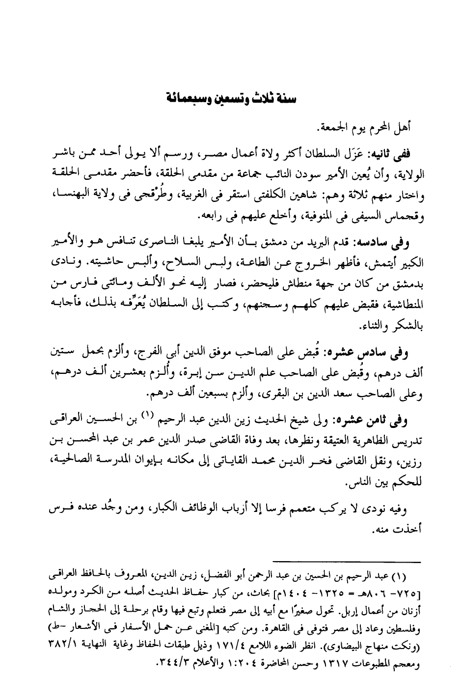 سنة ثَالِث وَتِسْعين وَسَبْعمائة أهل الْمحرم يَوْم الْجُمُعَة. فَفِي ثَانِيه: عزل السُّلْطَان أَكثر وُلَاة أَعمال مصر ورسم أَلا يولي أحد مِمَّن بَاشر الْولَايَة وَأَن يُعين الْأَمِير سودن النَّائِب جمَاعَة من مقدمي الْحلقَة فأحضر مقدمي الْحلقَة وَاخْتَارَ مِنْهُم ثَلَاثَة وهم: شاهين الكلفتي اسْتَقر فِي الغربية وطرقجى فِي ولَايَة البهنسا وقجماس السيفي فِي المنوفية وأخلع عَلَيْهِم فِي رابعه. وَفِي سادسه: قدم الْبَرِيد من دمشق بِأَن الْأَمِير يلبغا الناصري تنافس هُوَ والأمير الْكَبِير أيتمش فأظهر الْخُرُوج عَن الطَّاعَة وَلبس السِّلَاح وألبس حَاشِيَته. ونادى بِدِمَشْق من كَانَ من جِهَة منطاش فليحضر فَصَارَ إِلَيْهِ نَحْو الْألف ومائتي فَارس من المنطاشية فَقبض عَلَيْهِم كلهم وسجنهم وَكتب إِلَى السُّلْطَان يُعَرِّفه بذلك فَأَجَابَهُ بالشكر وَالثنَاء. وَفِي سادس عشره: قُبض على الصاحب موفق الدّين أبي الْفرج وألزم بِحمْل سِتِّينَ ألف دِرْهَم وقُبض على الصاحب علم الدّين سنّ إبرة وأُلزم بِعشْرين ألف دِرْهَم وعَلى الصاحب سعد الدّين بن البقري وألزم بسبعين ألف دِرْهَم. وَفِي ثامن عشره: ولي شيخ الحَدِيث زين الدّين عبد الرَّحِيم بن الْحُسَيْن الْعِرَاقِيّ تدريس الظَّاهِرِيَّة العتيقة ونظرها بعد وَفَاة القَاضِي صدر الدّين عمر بن عبد المحسن بن رزين وَنقل القَاضِي فَخر الدّين مُحَمَّد القاياتي إِلَى مَكَانَهُ بإيوان الْمدرسَة الصالحية للْحكم بَين النَّاس. وَفِيه نُودي لَا يركب متعمم فرسا إِلَّا أَرْبَاب الْوَظَائِف الْكِبَار وَمن وجد عِنْده فرس أخذت مِنْهُ.