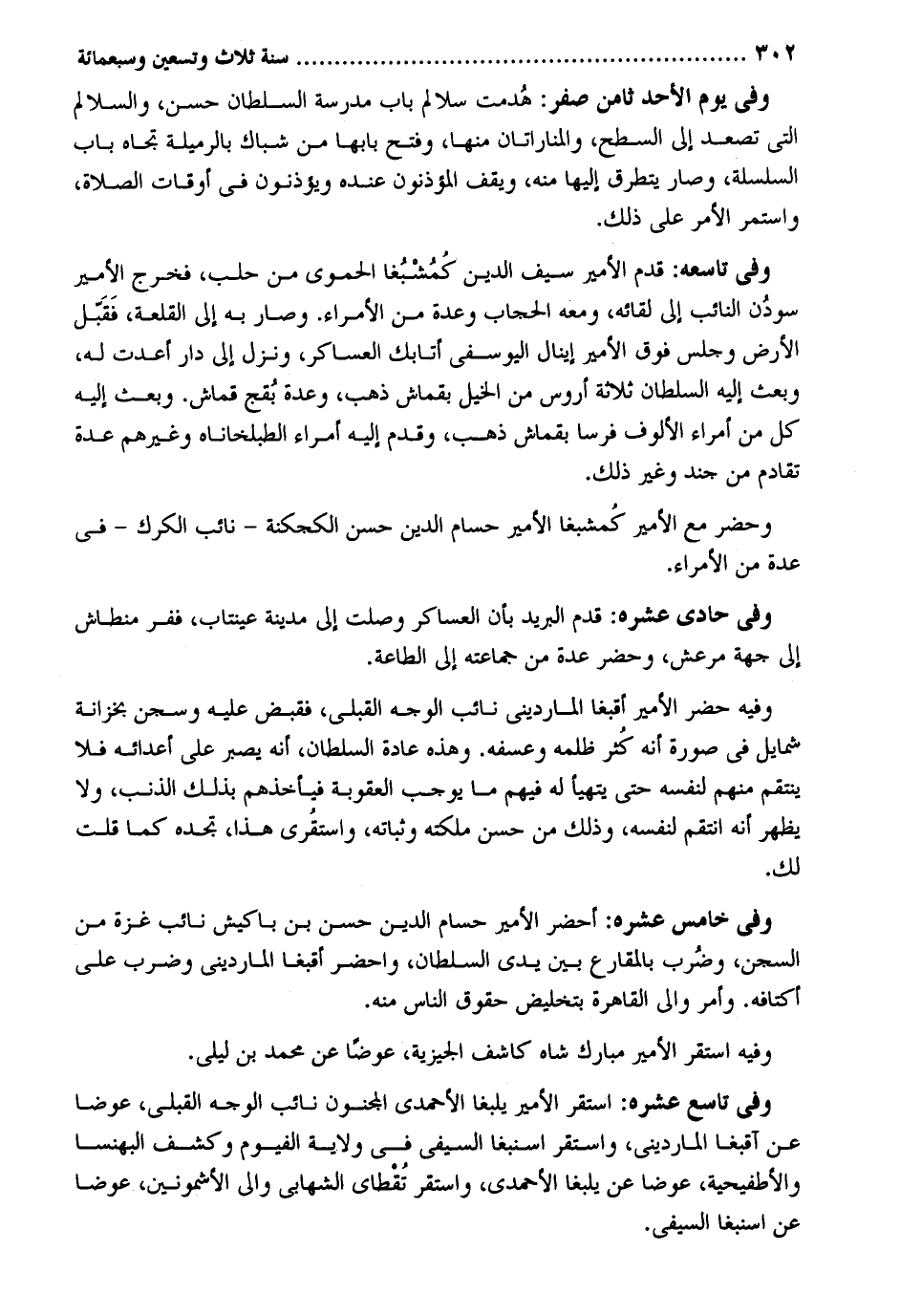 وَفِي يَوْم الْأَحَد ثامن صفر: هدمت سلالم بَاب مدرسة السُّلْطَان حسن والسلالم الَّتِي تصعد إِلَى السَّطْح والمناراتان مِنْهَا وَفتح بَابهَا من شباك بالرميلة تجاه بَاب السلسلة وَصَارَ يتَطَرَّق إِلَيْهَا مِنْهُ وَيقف المؤذنون عِنْده ويؤذنون فِي أَوْقَات الصَّلَاة وَاسْتمرّ الْأَمر على ذَلِك. وَفِي تاسعه: قدم الْأَمِير سيف الدّين كُمُشْبُغا الْحَمَوِيّ من حلب فَخرج الْأَمِير سودن النَّائِب إِلَى لِقَائِه وَمَعَهُ الْحجاب وعدة من الْأُمَرَاء. وَصَارَ بِهِ إِلَى القلعة فَقَبّل الأَرْض وَجلسَ فَوق الْأَمِير اٍ ينَال اليوسفي أتابك العساكر وَنزل إِلَى دَار أعدت لَهُ وَبعث إِلَيْهِ السُّلْطَان ثَلَاثَة أروس من الْخَيل بقماش ذهب وعدة بقج قماش. وَبعث إِلَيْهِ كل من أُمَرَاء الألوف فرسا بقماش ذهب وَقدم إِلَيْهِ أُمَرَاء الطبلخاناه وَغَيرهم عدَّة تقادم من جند وَغير ذَلِك. وَحضر مَعَ الْأَمِير كُمشبغا الْأَمِير حسام الدّين حسن الكجكنة - نَائِب الكرك - فِي عدَّة من وَفِي حادي عشره: قدم الْبَرِيد بِأَن العساكر وصلت إِلَى مَدِينَة عينتاب ففر منطاش إِلَى جِهَة مرعش وَحضر عدَّة من جماعته إِلَى الطَّاعَة. وَفِيه حضر الْأَمِير أقبغا المارديني نَائِب الْوَجْه القبلي فَقبض عَلَيْهِ وسجن بخزانة شمايل فِي صُورَة أَنه كثر ظلمه وتعسفه. وَهَذِه عَادَة السُّلْطَان أَنه يصير على أعدائه فَلَا ينْتَقم مِنْهُم لنَفسِهِ حَتَّى يتهيأ لَهُ فيهم مَا يُوجب الْعقُوبَة فيأخذهم بذلك الذَّنب وَلَا يظْهر أَنه انتقم لنَفسِهِ وَذَلِكَ من حسن ملكته وثباته واستقرى هَذَا تَجدهُ كَمَا قلت لَك. وَفِي خَامِس عشره: أحضر الْأَمِير حسام الدّين حسن بن باكيش نَائِب غَزَّة من السجْن وضُرب بالمقارع بَين يَدي السُّلْطَان وأحضر أقبغا المارديني وَضرب على أكتافه. وَأمر وَالِي الْقَاهِرَة بتخليض حُقُوق النَّاس مِنْهُ. وَفِيه اسْتَقر الْأَمِير مبارك شاه كاشف الجيزية عوضا عَن مُحَمَّد بن ليلى. وَفِي تَاسِع عشره: اسْتَقر الْأَمِير يلبغا الأسعدي الْمَجْنُون نَائِب الْوَجْه القبلي عوضا عَن أقبغا المارديني وَاسْتقر أسنبغا السيفي فِي ولَايَة الفيوم وكشف البهنسا والأطفيحية عوضا عَن يلبغا الأسعدي وَاسْتقر تقطاي الشهابي وَالِي الأشمونين عوضا عَن أسنبغا السيفي.