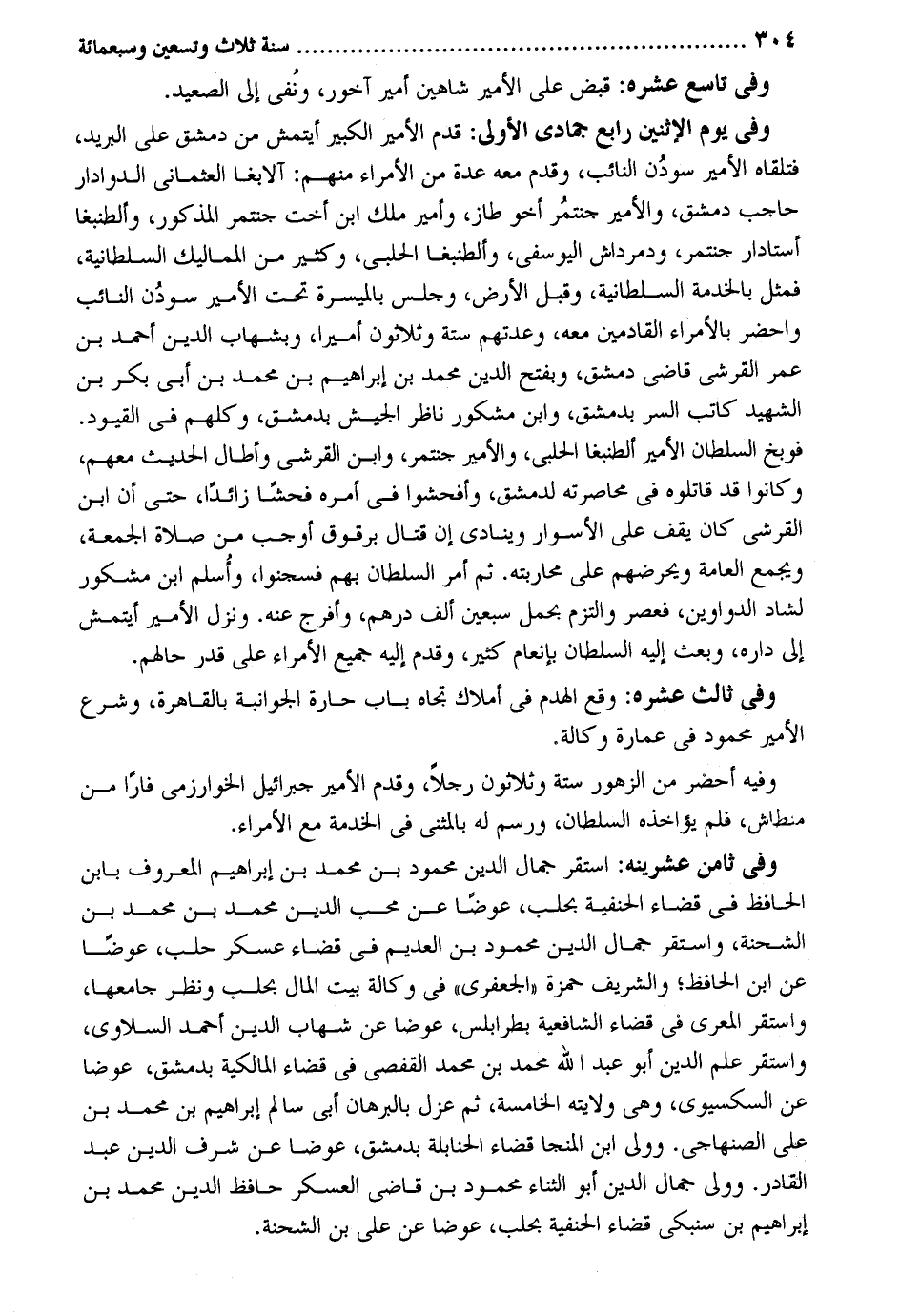 وَفِي تَاسِع عشره: قبض على الْأَمِير شاهين أَمِير آخور ونُفي إِلَى الصَّعِيد. وَفِي يَوْم الِاثْنَيْنِ رَابِع جُمَادَى الأولى: قدم الْأَمِير الْكَبِير أيتمش من دمشق على الْبَرِيد فَتَلقاهُ الْأَمِير سودُن النَّائِب وَقدم مَعَه عدَّة من الْأُمَرَاء مِنْهُم: آلابغا العثماني الدوادار حَاجِب دمشق والأمير جنتمر أَخُو طاز وأمير ملك ابْن أُخْت جنتمر الْمَذْكُور وألطبغا أستادار جنتمر ودمرداش اليوسفي وألطبغا الْحلَبِي وَكثير من المماليك السُّلْطَانِيَّة فَمثل بِالْخدمَةِ السُّلْطَانِيَّة وَقبل الأَرْض وَجلسَ بالميسرة تَحت الْأَمِير سودُن النَّائِب واحضر بالأمراء القادمين مَعَه وعدتهم سِتَّة وَثَلَاثُونَ أَمِيرا وبشهاب الدّين أَحْمد بن عمر الْقرشِي قَاضِي دمشق وبفتح الدّين مُحَمَّد بن إِبْرَاهِيم بن مُحَمَّد بن أبي بكر بن الشَّهِيد كَاتب السِّرّ بِدِمَشْق وَابْن مشكور نَاظر الْجَيْش بِدِمَشْق وَكلهمْ فِي الْقُيُود. فوبخ السُّلْطَان الْأَمِير ألطبغا الْحلَبِي والأمير جنتمر وَابْن الْقرشِي وَأطَال الحَدِيث مَعَهم وَكَانُوا قد قَاتلُوهُ فِي محاصرته لدمشق وأفحشوا فِي أمره فحشاً زَائِدا حَتَّى أَن ابْن الْقرشِي كَانَ يقف على الأسوار وينادي إِن قتال برقوق أوجب من صَلَاة الْجُمُعَة وَيجمع الْعَامَّة ويحرضهم على محاربته. ثمَّ أَمر السُّلْطَان بهم فسجنوا وأُسلم ابْن مشكور لشاد الدَّوَاوِين فعصر وَالْتزم بِحمْل سبعين ألف دِرْهَم وَأَفْرج عَنهُ. وَنزل الْأَمِير أيتمش إِلَى دَاره وَبعث إِلَيْهِ السُّلْطَان بإنعام كثير وَقدم إِلَيْهِ جَمِيع الْأُمَرَاء على قدر حَالهم. وَفِي ثَالِث عشره: وَقع الْهدم فِي أَمْلَاك تجاه بَاب حارة الجوانبة بِالْقَاهِرَةِ وَشرع الْأَمِير مَحْمُود فِي عمَارَة وكَالَة. وَفِيه أحضر من الزهور سِتَّة وَثَلَاثُونَ رجلا وَقدم الْأَمِير جِبْرَائِيل الْخَوَارِزْمِيّ فَارًّا من منطاش فَلم يؤاخذه السُّلْطَان ورسم لَهُ بالمثنى فِي الْخدمَة مَعَ الْأُمَرَاء. وَفِي ثامن عشرينه: اسْتَقر جمال الدّين مَحْمُود بن مُحَمَّد بن إِبْرَاهِيم الْمَعْرُوف بِابْن الْحَافِظ فِي قَضَاء الْحَنَفِيَّة بحلب عوضا عَن محب الدّين مُحَمَّد بن مُحَمَّد بن الشّحْنَة وَاسْتقر جمال الدّين مَحْمُود بن العديم فِي قَضَاء عَسْكَر حلب عوضا عَن ابْن الْحَافِظ والشريف حَمْزَة الْجَعْفَرِي فِي وكَالَة بَيت المَال بحلب وَنظر جَامعهَا وَاسْتقر المعري فِي قَضَاء الشَّافِعِيَّة بطرابلس عوضا عَن شهَاب الدّين أَحْمد السلاوي وَاسْتقر علم الدّين أَبُو عبد الله مُحَمَّد بن مُحَمَّد القفصي فِي قَضَاء الْمَالِكِيَّة بِدِمَشْق عوضا عَن السكسيوي وَهِي ولَايَته الْخَامِسَة ثمَّ عزل بالبرهان أبي سَالم إِبْرَاهِيم بن مُحَمَّد بن عَليّ الصنهاجي. وَولى ابْن المنجا قَضَاء الْحَنَابِلَة بِدِمَشْق عوضا عَن شرف الدّين عبد الْقَادِر. وَولى جمال الدّين أَبُو الثَّنَاء مَحْمُود بن قَاضِي الْعَسْكَر حَافظ الدّين مُحَمَّد بن إِبْرَاهِيم بن سنبكي قَضَاء الْحَنَفِيَّة بحلب عوضا عَن عَليّ بن الشّحْنَة.