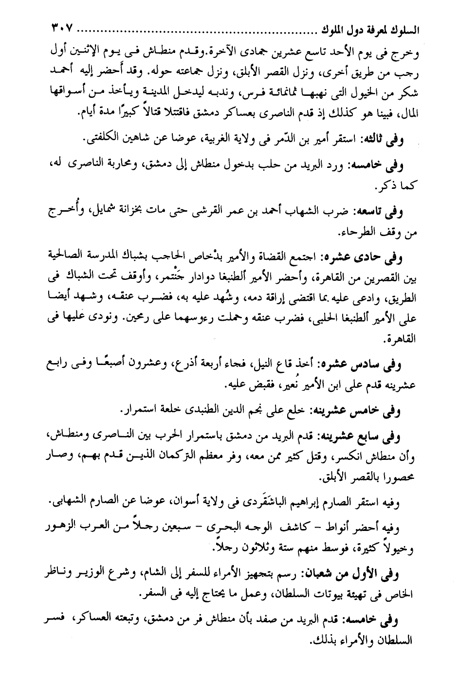 وَخرج فِي يَوْم الْأَحَد تَاسِع عشْرين جُمَادَى الْآخِرَة. وَقدم منطاش فِي يَوْم الْإِثْنَيْنِ أول رَجَب من طَرِيق أُخْرَى وَنزل الْقصر الأبلق وَنزل جماعته حوله. وَقد أَحضر إِلَيْهِ أَحْمد شكر من الْخُيُول الَّتِي نهبها ثَمَانمِائَة فرس وندبه ليدْخل الْمَدِينَة وَيَأْخُذ من أسواقها المَال فَبينا هُوَ كَذَلِك إِذْ قدم الناصري بعساكر دمشق فاقتتلا قتالاً كَبِيرا مُدَّة أَيَّام. وَفِي ثالثه: اسْتَقر أَمِير بن الدمر فِي ولَايَة الغربية عوضا عَن شاهين الكلفتي. وَفِي تاسعه: ضرب الشهَاب أَحْمد بن عمر الْقرشِي حَتَّى مَاتَ بخزانة شمايل وأُخرج من وقف الطرحاء. وَفِي حادي عشره: اجْتمع الْقُضَاة والأمير بدخاص الْحَاجِب بشباك الْمدرسَة الصالحية بَين القصرين من الْقَاهِرَة وأحضر الْأَمِير ألطبغا دوادار جَنْتمر وأوقف تَحت الشباك فِي الطَّرِيق وَادّعى عَلَيْهِ. مِمَّا اقْتضى إِرَاقَة دَمه وشُهد عَلَيْهِ بِهِ فَضرب عُنُقه وَشهد أَيْضا على الْأَمِير ألطبغا الْحلَبِي فَضرب عُنُقه وحملت رؤسهما على رُمْحَيْنِ. وَنُودِيَ عَلَيْهَا فِي الْقَاهِرَة. وَفِي سادس عشره: أَخذ قاع النّيل فجَاء أَرْبَعَة أَذْرع وَعِشْرُونَ إصبعاً وَفِي رَابِع عشرينه قدم على ابْن الْأَمِير نُعير فَقبض عَلَيْهِ. وَفِي خَامِس عشرينه: خلع على نجم الدّين الطبدى خلعة اسْتِمْرَار. وَفِي سَابِع عشرينه: قدم الْبَرِيد من دمشق باستمرار الْحَرْب بَين الناصري ومنطاش وَأَن منطاش انْكَسَرَ وَقتل كثير مِمَّن مَعَه وفر مُعظم التركمان الَّذين قدم بهم وَصَارَ محصوراً بِالْقصرِ الأبلق. وَفِيه اسْتَقر الصارم إِبْرَاهِيم الباشَقَردي فِي ولَايَة أسوان عوضا عَن الصارم الشهابي. وَفِيه أحضر أنواط - كاشف الْوَجْه البحري - سبعين رجلا من الْعَرَب الزهور وخيولاً كَثِيرَة فوسط مِنْهُم سِتَّة وَثَلَاثُونَ رجلا. وَفِي الأول من شعْبَان: رسم بتجهيز الْأُمَرَاء للسَّفر إِلَى الشَّام وَشرع الْوَزير وناظر الْخَاص فِي تهيئة بيوتات السُّلْطَان وَعمل مَا يحْتَاج إِلَيْهِ فِي السّفر. وَفِي خامسه: قدم الْبَرِيد من صفد بِأَن منطاش فر من دمشق وتبعته العساكر فسر السُّلْطَان والأمراء بذلك.