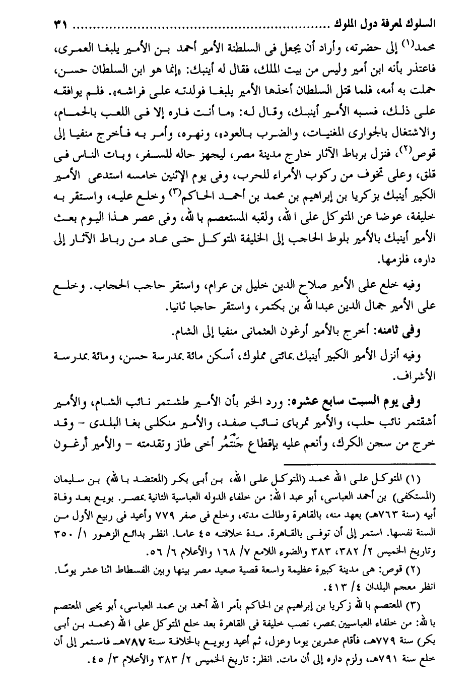 مُحَمَّد إِلَى حَضرته وَأَرَادَ أَن يَجْعَل فِي السلطة الْأَمِير أَحْمد بن الْأَمِير يلبغا الْعمريّ فَاعْتَذر بِأَنَّهُ ابْن أَمِير وَلَيْسَ من بَيت الْملك فَقَالَ لَهُ أينبك: إِنَّمَا هُوَ ابْن السُّلْطَان حسن حملت بِهِ أمه فَلَمَّا قتل السُّلْطَان أَخذهَا الْأَمِير يلبغا فولدته على فرَاشه. فَلم يُوَافقهُ على ذَلِك فَسَبهُ الْأَمِير أينبك وَقَالَ لَهُ: مَا أَنْت فاره إِلَّا فِي اللّعب بالحمام والإشتغال بالجواري الْمُغَنِّيَات وَالضَّرْب بِالْعودِ ونهره وَأمر بِهِ فَأخْرج منفياً إِلَى قوص فَنزل برباط الْآثَار خَارج مَدِينَة مصر ليجهز حَاله للسَّفر وَبَات النَّاس فِي قلق وعَلى تخوف من ركُوب الْأُمَرَاء للحرب وَفِي يَوْم الْإِثْنَيْنِ خامسه استدعى الْأَمِير الْكَبِير أينبك بزكريا بن إِبْرَاهِيم بن مُحَمَّد بن أَحْمد الْحَاكِم وخلع عَلَيْهِ وَاسْتقر بِهِ خَليفَة عوضا عَن المتَوَكل على الله ولقبه المستعصم بِاللَّه وَفِي عصر هَذَا الْيَوْم بعث الْأَمِير أينبك بالأمير بلوط الْحَاجِب إِلَى الْخَلِيفَة المتَوَكل حَتَّى عَاد من رِبَاط الْآثَار إِلَى دَاره فلزمها. وَفِيه خلع على الْأَمِير صَلَاح الدّين خَلِيل بن عرام وَاسْتقر حَاجِب الْحجاب. وخلع على الْأَمِير جمال الدّين عبد الله بن بكتمر وَاسْتقر حاجبا ثَانِيًا. وَفِي ثامنه: أخرج بالأمير أرغون العثماني منفيا إِلَى الشَّام. وَفِيه أنزل الْأَمِير الْكَبِير أينبك. بِمِائَتي مَمْلُوك أسكن مائَة بمدرسة حسن وَمِائَة. بمدرسة الْأَشْرَاف. وَفِي يَوْم السبت سَابِع عشره: ورد الْخَبَر بِأَن الْأَمِير طشتمر نَائِب الشَّام والأمير أشقتمر نَائِب حلب والأمير تمرباى نَائِب صفد والأمير منكلي بغا الْبَلَدِي - وَقد خرج من سجن الكرك وأنعم عَلَيْهِ بإقطاع جنتمر أخي طاز وتقدمته - والأمير أرغون