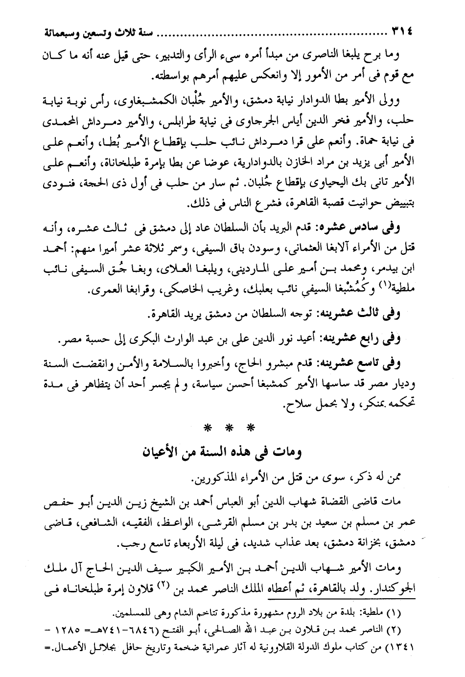 وَمَا برح يلبغا الناصري من مبدأ أمره سيئ الرَّأْي وَالتَّدْبِير حَتَّى قيل عَنهُ أَنه مَا كَانَ مَعَ قوم فِي أَمر من الْأُمُور إِلَّا وانعكس عَلَيْهِم أَمرهم بواسطته. وَولى الْأَمِير بطا الدوادار نِيَابَة دمشق والأمير جُلْبان الكمشبغاوي رَأس نوبَة نِيَابَة حلب والأمير فَخر الدّين أياس الجرجاوي فِي نِيَابَة طرابلس والأمير دمرداش المحمدي فِي نِيَابَة حماة. وأنعم على قرا دمرداش نَائِب حلب بإقطاع الْأَمِير بُطا وأنعم على الْأَمِير أبي يزِيد بن مُرَاد الخازن بالدوادارية عوضا عَن بطا بإمرة طبلخاناة وأنعم على الْأَمِير تاني بك اليحياوي بإقطاع جُلبان. ثمَّ سَار من حلب فِي أول ذِي الْحجَّة فَنُوديَ بتبييض حوانيت قَصَبَة الْقَاهِرَة فشرع النَّاس فِي ذَلِك. وَفِي سادس عشره: قدم الْبَرِيد بِأَن السُّلْطَان عَاد إِلَى دمشق فِي ثَالِث عشره وَأَنه قتل من الْأُمَرَاء آلابغا العثماني وسودن بَاقٍ السيفي وَسمر ثَلَاثَة عشر أَمِيرا مِنْهُم: أَحْمد ابْن بيدمر وَمُحَمّد بن أَمِير عَليّ المارديني ويلبغا العلاي وبغا بن السيفي نَائِب ملطية وكُمُشْبغا السيفي نَائِب بعلبك وغريب الخاصكي وقرابغا الْعمريّ. وَفِي ثَالِث عشرينه: توجه السُّلْطَان من دمشق يُرِيد الْقَاهِرَة. وَفِي رَابِع عشرينه: أُعِيد نور الدّين عَليّ بن عبد الْوَارِث الْبكْرِيّ إِلَى حسبَة مصر. وَفِي تَاسِع عشرينه: قدم مبشرو الْحَاج وأخبروا بالسلامة والأمن وَانْقَضَت السّنة وديار مصر قد ساسها الْأَمِير كمشبغا أحسن سياسة وَلم يَجْسُر أحد أَن يتظاهر فِي مُدَّة تحكمه بمنكر وَلَا بِحمْل سلَاح. وَمَات فِي هَذِه السّنة من الْأَعْيَان مِمَّن لَهُ ذكر سوى من قتل من الْأُمَرَاء الْمَذْكُورين. مَاتَ قَاضِي الْقُضَاة شهَاب الدّين أَبُو الْعَبَّاس أَحْمد بن الشَّيْخ زين الدّين أَبُو حَفْص عمر بن مُسلم بن سعيد بن بدر بن مُسلم الْقرشِي الْوَاعِظ الْفَقِيه الشَّافِعِي قَاضِي دمشق بخزانة وَمَات الْأَمِير شهَاب الدّين أَحْمد بن الْأَمِير الْكَبِير سيف الدّين الْحَاج آل ملك الجوكندار. ولد بِالْقَاهِرَةِ ثمَّ أعطَاهُ الْملك النَّاصِر مُحَمَّد بن قلاون إمرة طبلخاناه فِي