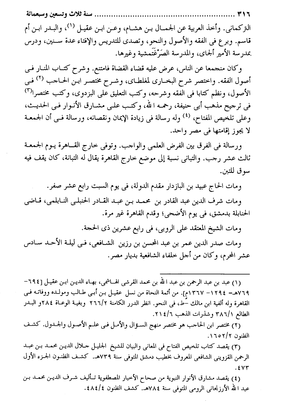 التركماني. وَأخذ الْعَرَبيَّة عَن الْجمال بن هِشَام وَعَن ابْن عقيل والبدر ابْن أم قَاسم. وبرع فِي الْفِقْه وَالْأُصُول والنحو وتصدى للتدريس والإفتاء عدَّة سِنِين ودرس بمدرسة الْأَمِير ألجاي والمدرسة الصَرْغَتَمشية وَغَيرهَا. وَكَانَ منجمعاً عَن النَّاس عرض عَلَيْهِ قَضَاء الْقُضَاة فَامْتنعَ. وَشرح كتاب الْمنَار فِي أصُول الْفِقْه. وَاخْتصرَ شرح البُخَارِيّ لمغلطاي وَشرح مُخْتَصر ابْن الْحَاجِب فِي الْأُصُول ونظم كتابا فِي الْفِقْه وَشَرحه وَكتب التَّعْلِيق على الْبَزْدَوِيّ وَكتب مُخْتَصرا فِي تَرْجِيح مَذْهَب أبي حنيفَة رَحمَه الله وَكتب على مَشَارِق الْأَنْوَار فِي الحَدِيث وعَلى تَلْخِيص المفتَاح وَله رِسَالَة فِي زِيَادَة الْإِيمَان ونقصانه ورسالة فِي أَن الْجُمُعَة لَا يجوز إِقَامَتهَا فِي مصر وَاحِد. ورسالة فِي الْفرق بَين الْفَرْض العلمي وَالْوَاجِب. وَتُوفِّي خَارج الْقَاهِرَة يَوْم الْجُمُعَة ثَالِث عشر رَجَب. والتباني نِسْبَة إِلَى مَوضِع خَارج الْقَاهِرَة يُقَال لَهُ التبانة كَانَ يقف فِيهِ سوق للتبن. وَمَات الْحَاج عبيد بن البازدار مقدم الدولة فِي يَوْم السبت رَابِع عشر صفر. وَمَات شرف الدّين عبد الْقَادِر بن مُحَمَّد بن عبد الْقَادِر الْحَنْبَلِيّ النابلسي قَاضِي الْحَنَابِلَة بِدِمَشْق فِي يَوْم الْأَضْحَى وَقدم الْقَاهِرَة غير مرّة. وَمَات الشَّيْخ المعتقد على الروبي فِي رَابِع عشْرين ذِي الْحجَّة. وَمَات صدر الدّين عمر بن عبد المحسن بن رزين الشَّافِعِي فِي لَيْلَة الْأَحَد سادس عشر الْمحرم وَكَانَ من أجل خلفاء الشَّافِعِيَّة بديار مصر.
