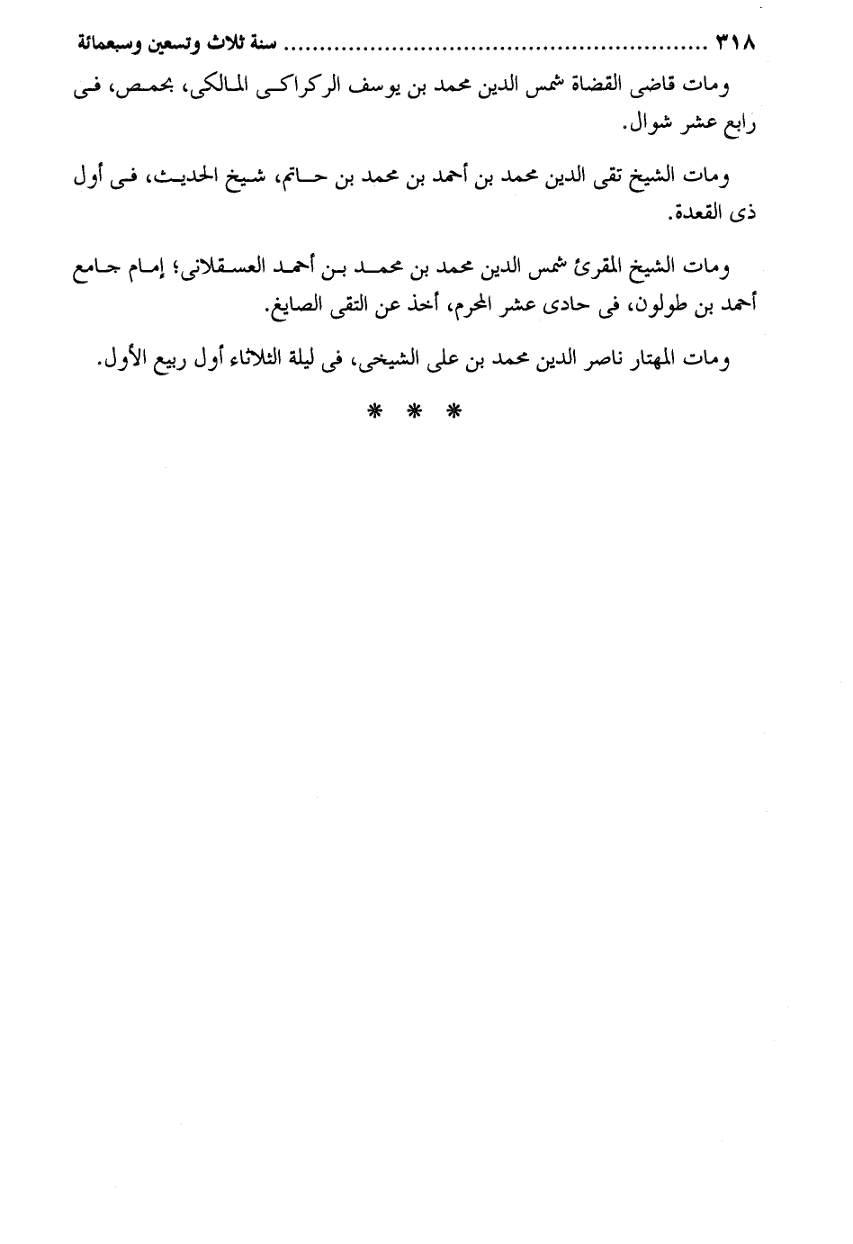 وَمَات قَاضِي الْقُضَاة شمس الدّين مُحَمَّد بن يُوسُف الركراكي الْمَالِكِي بحمص فِي رَابِع عشر شَوَّال. وَمَات الشَّيْخ تَقِيّ الدّين مُحَمَّد بن أَحْمد بن مُحَمَّد بن حَاتِم شيخ الحَدِيث فِي أول ذِي الْقعدَة. وَمَات الشَّيْخ الْمُقْرِئ شمس الدّين مُحَمَّد بن مُحَمَّد بن أَحمد الْعَسْقَلَانِي إِمَام جَامع أَحْمد بن طولون فِي حادي عشر الْمحرم أَخذ عَن التقى الصايغ. وَمَات المهتار نَاصِر الدّين مُحَمَّد بن على الشيخي فِي لَيْلَة الثُّلَاثَاء أول ربيع الأول.