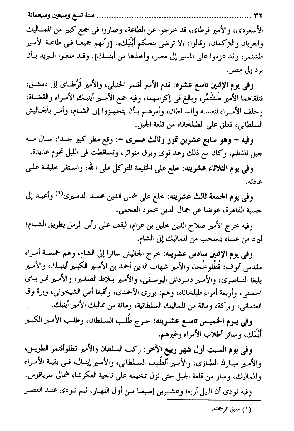 الأسعردي والأمير قرطاي قد خَرجُوا عَن الطَّاعَة وصاروا فِي جمع كَبِير من المماليك والعربان والتركمان وَقَالُوا: لَا ترْضى بتحكم أبنبك. وَأَنَّهُمْ جَمِيعًا فِي طَاعَة الْأَمِير طشتمر وَقد عزموا على الْمسير إِلَى مصر وَفِي يَوْم الْإِثْنَيْنِ تَاسِع عشره: قدم الْأَمِير أقتمر الْحَنْبَلِيّ والأمير قرطاي إِلَى دمشق فتلقاهما الْأَمِير طشتمر وَبَالغ فِي إكرامهما وَفِيه جمع الْأَمِير أينبك الْأُمَرَاء والقضاة وَحلف الْأُمَرَاء لنَفسِهِ وللسلطان وَأمرهمْ بِأَن يتجهزوا إِلَى الشَّام وَأمر بالجاليش السلطاني فعلق على الطبلخاناه من قلعة الْجَبَل. وَفِيه - وَهُوَ سَابِع عشْرين تموز وثالث مسرى -: وَقع مطر كَبِير جدا سَالَ مِنْهُ جبل المقطم وَكَانَ مَعَ ذَلِك رعد قوي وبرق متواتر وتساقطت فِي اللَّيْل نُجُوم عديدة. وَفِي يَوْم الثُّلَاثَاء عشرينه: خلع على الْخَلِيفَة المتَوَكل على الله وَاسْتقر خَليفَة على عَادَته. وَفِي يَوْم الْجُمُعَة ثَالِث عشرينه: خلع على شمس الدّين مُحَمَّد الدَّمِيرِيّ وأعيد إِلَى حسبَة الْقَاهِرَة عوضا عَن جمال الدّين مَحْمُود العجمي. وَفِيه خرج الْأَمِير صَلَاح الدّين خَلِيل بن عرام ليقف على رَأس الرمل بطرِيق الشَّام ليرد من عساه يتسحب من المماليك إِلَى الشَّام. وَفِي يَوْم الْإِثْنَيْنِ سادس عشرينه: خرج الجاليش سائرا إِلَى الشَّام وهم خَمْسَة أُمَرَاء مقدمي أُلُوف: قطلوخجا والأمير شهَاب الدّين أَحْمد بن الْأَمِير الْكَبِير أينبك والأمير يلبغا الناصري والأمير دمرداش اليوسفي والأمير بلاط الصَّغِير والأمير تمر باي الحسني وَأَرْبَعَة أُمَرَاء طبلخاناه وهم: بورى الأحمدي وآقبغا آص الشيخوني وبرقوق العثماني وبركة وَمِائَة من المماليك وَفِي يَوْم الْخَمِيس تَاسِع عشرينه: خرج طلب السُّلْطَان وَطلب الْأَمِير الْكَبِير أينبك وَسَائِر أطلاب الْأُمَرَاء وَغَيرهم. وَفِي يَوْم السبت أول شهر ربيع الآخر: ركب السُّلْطَان والأمير قطلوأقتمر الطَّوِيل والأمير مبارك الطازي والأمير ألطنبغا السلطاني والأمير إينال فِي بَقِيَّة الْأُمَرَاء والمماليك وَسَار من قلعة الْجَبَل حَتَّى نزل. بمخيمه على نَاجِية العكرشا شمَالي سرياقوس. وَفِيه نُودي أَن النّيل أَرْبعا وَعشْرين إصبعا من أول النَّهَار ثمَّ نُودي عِنْد الْعَصْر