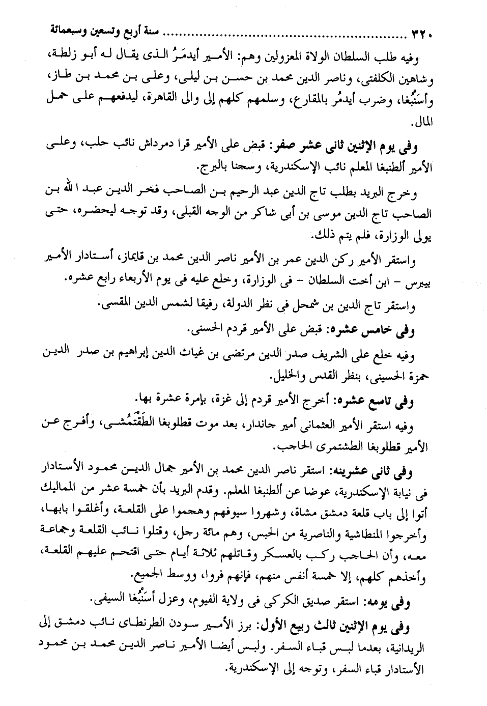 وَفِيه طلب السُّلْطَان الْوُلَاة المعزولين وهم: الْأَمِير أيدمَرُ الَّذِي يُقَال لَهُ أَبُو زلطة وشاهين الكلفتي وناصر الدّين مُحَمَّد بن حسن بن ليلى وعَلى بن مُحَمَّد بن طاز وأسَنبغا وَضرب أيدمُر بالمقارع وسلمهم كلهم إِلَى وَالِي الْقَاهِرَة ليدفعهم على حمل المَال. وَفِي يَوْم الِاثْنَيْنِ ثَانِي عشر صفر: قبض على الْأَمِير قرا دمرداش نَائِب حلب وعَلى الْأَمِير ألطبغا الْمعلم نَائِب الْإسْكَنْدَريَّة وسجنا بالبرج. وَخرج الْبَرِيد بِطَلَب تَاج الدّين عبد الرَّحِيم بن الصاحب فَخر الدّين عبد الله بن الصاحب تَاج الدّين مُوسَى بن أبي شَاكر من الْوَجْه القبلي وَقد توجه ليحضره حَتَّى يُولى الوزارة فَلم يتم ذَلِك. وَاسْتقر الْأَمِير ركن الدّين عمر بن الْأَمِير نَاصِر الدّين مُحَمَّد بن قايماز أستادار الْأَمِير بيبرس - ابْن أُخْت السُّلْطَان - فِي الوزارة وخلع عَلَيْهِ فِي يَوْم الْأَرْبَعَاء رَابِع عشره. وَاسْتقر تَاج الدّين بن كحل فِي نظر الدولة رفيقاًُ لشمس الدّين المقسي. وَفِي خَامِس عشره: قبض على الْأَمِير قردم الحسني. وَفِيه خلع على الشريف صدر الدّين مرتضى بن غياث الدّين إِبْرَاهِيم بن صدر الدّين حَمْزَة الْحُسَيْنِي بِنَظَر الْقُدس والخليل. وَفِي تَاسِع عشره: أخرج الْأَمِير قردم إِلَى غَزَّة بإمرة عشرَة بهَا. وَفِيه اسْتَقر الْأَمِير العثماني أَمِير جاندار بعد موت قطلوبغا الطَقتمُشي وَأَفْرج عَن الْأَمِير قطلوبغا الطشتمري الْحَاجِب. وَفِي ثَمَانِي عشرينه: اسْتَقر نَاصِر الدّين مُحَمَّد بن الْأَمِير جمال الدّين مَحْمُود الأستادار فِي نِيَابَة الْإسْكَنْدَريَّة عوضا عَن ألطنبغا الْمعلم. وَقدم الْبَرِيد بِأَن خَمْسَة عشر من المماليك أَتَوا إِلَى بَاب قلعة دمشق مشَاة وشهروا سيوفهم وهجموا على القلعة وَأَغْلقُوا بَابهَا وأخرجوا المنطاشية والناصرية من الْحَبْس وهم مائَة رجل وَقتلُوا نَائِب القلعة وَجَمَاعَة مَعَه وَأَن الْحَاجِب ركب بالعسكر وَقَاتلهمْ ثَلَاثَة أَيَّام حَتَّى اقتحم عَلَيْهِم القلعة وَأَخذهم كلهم إِلَّا خَمْسَة أنفس مِنْهُم فَإِنَّهُم فروا ووسط الْجَمِيع. وَفِي يَوْمه: اسْتَقر صديق الكركي فِي ولَايَة الفيوم وعزل أسَنْبُغا السيفي. وَفِي يَوْم الِاثْنَيْنِ ثَالِث ربيع الأول: برز الْأَمِير سودن الطرنطاي نَائِب دمشق إِلَى الريحانية بَعْدَمَا لبس قبَاء السّفر. وَلبس أَيْضا الْأَمِير نَاصِر الدّين مُحَمَّد بن مَحْمُود الأستادار قبَاء السّفر وَتوجه إِلَى الْإسْكَنْدَريَّة.