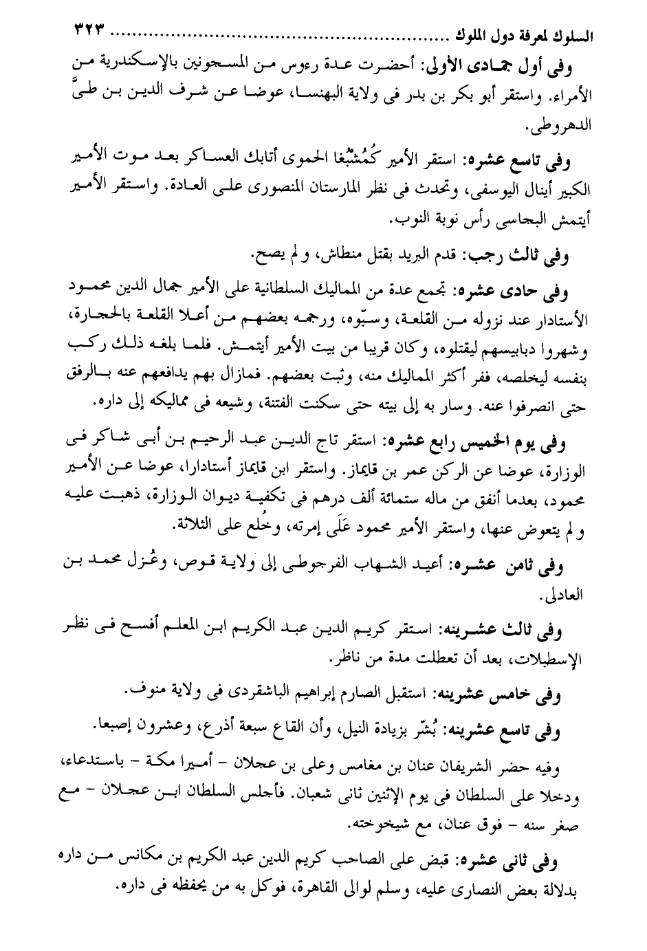 وَفِي أول جُمَادَى الأولى: أحضرت عدَّة رُؤُوس من المسجونين بالإسكندرية من الْأُمَرَاء. وَاسْتقر أَبُو بكر بن بدر فِي ولَايَة البهنسا عوضا عَن شرف الدّين بن طي الدهروطي. وَفِي تَاسِع عشره: اسْتَقر الْأَمِير كُمُشبغا الْحَمَوِيّ أتابك العساكر بعد موت الْأَمِير الْكَبِير أينال اليوسفي وتحدث فِي نظر المارستان المنصوري على الْعَادة. وَاسْتقر الْأَمِير أيتمش البجاسي رَئِيس نوبَة النوب. وَفِي ثَالِث رَجَب: قدم الْبَرِيد بقتل منطاش وَلم يَصح. وَفِي حادي عشره: تجمع عدَّة من المماليك السُّلْطَانِيَّة على الْأَمِير جمال الدّين مَحْمُود الأستادار عِنْد نُزُوله من القلعة وسبّوه ورجمه بَعضهم من أَعلَى القلعة بِالْحِجَارَةِ وشهروا دبابيسهم ليقتلوه وَكَانَ قَرِيبا من بَيت الْأَمِير أيتمش. فَلَمَّا بلغه ذَلِك ركب بِنَفسِهِ ليخلصه ففر أَكثر المماليك مِنْهُ وَثَبت بَعضهم. فَمَا زَالَ بهم يدافعهم عَنهُ بالرفق حَتَّى انصرفوا عَنهُ. وَسَار بِهِ إِلَى بيتَه حَتَّى سكنت الْفِتْنَة وشيعه فِي مماليكه إِلَى دَاره. وَفِي يَوْم الْخَمِيس رَابِع عشره: اسْتَقر تَاج الدّين عبد الرَّحِيم بن أبي شَاكر فِي الوزارة عوضا عَن الرُّكْن عمر بن قايماز. وَاسْتقر ابْن قايماز أستاداراً عوضا عَن الْأَمِير مَحْمُود بَعْدَمَا أنْفق من مَاله سِتّمائَة ألف دِرْهَم فِي تكفية ديوَان الوزارة ذهبت عَلَيْهِ وَلم يتعوض عَنْهَا وَاسْتقر الْأَمِير وَفِي ثامن عشره: أُعِيد الشهَاب الفرجوطي إِلَى ولَايَة قوص وعُزل مُحَمَّد بن العادلي. وَفِي ثَالِث عشرينه: اسْتَقر كريم الدّين عبد الْكَرِيم ابْن الْمعلم أفسح فِي نظر الإسطبلات بعد أَن تعطلت مُدَّة من نَاظر. وَفِي خَامِس عشرينه: اسْتقْبل الصارم إِبْرَاهِيم الباشقردي فِي ولَايَة منوف. وَفِي تَاسِع عشرينه: بُشّر بِزِيَادَة النّيل وَأَن القاع سَبْعَة أَذْرع وَعِشْرُونَ إصبعاً. وَفِيه حضر الشريفان عنان بن مغامس وَعلي بن جلان - أَمِيرا مَكَّة - باستدعاء ودخلا على السُّلْطَان فِي يَوْم الِاثْنَيْنِ ثَالِث شعْبَان. فأجلس السُّلْطَان ابْن عجلَان - مَعَ صغر سنه - فَوق عنان مَعَ شيخوخته. وَفِي ثَانِي عشره: قبض على الصاحب كريم الدّين عبد الْكَرِيم بن مكانس من دَاره بِدلَالَة بعض النَّصَارَى عَلَيْهِ وَسلم لوالي الْقَاهِرَة فَوكل بِهِ من يحفظه فِي دَاره.