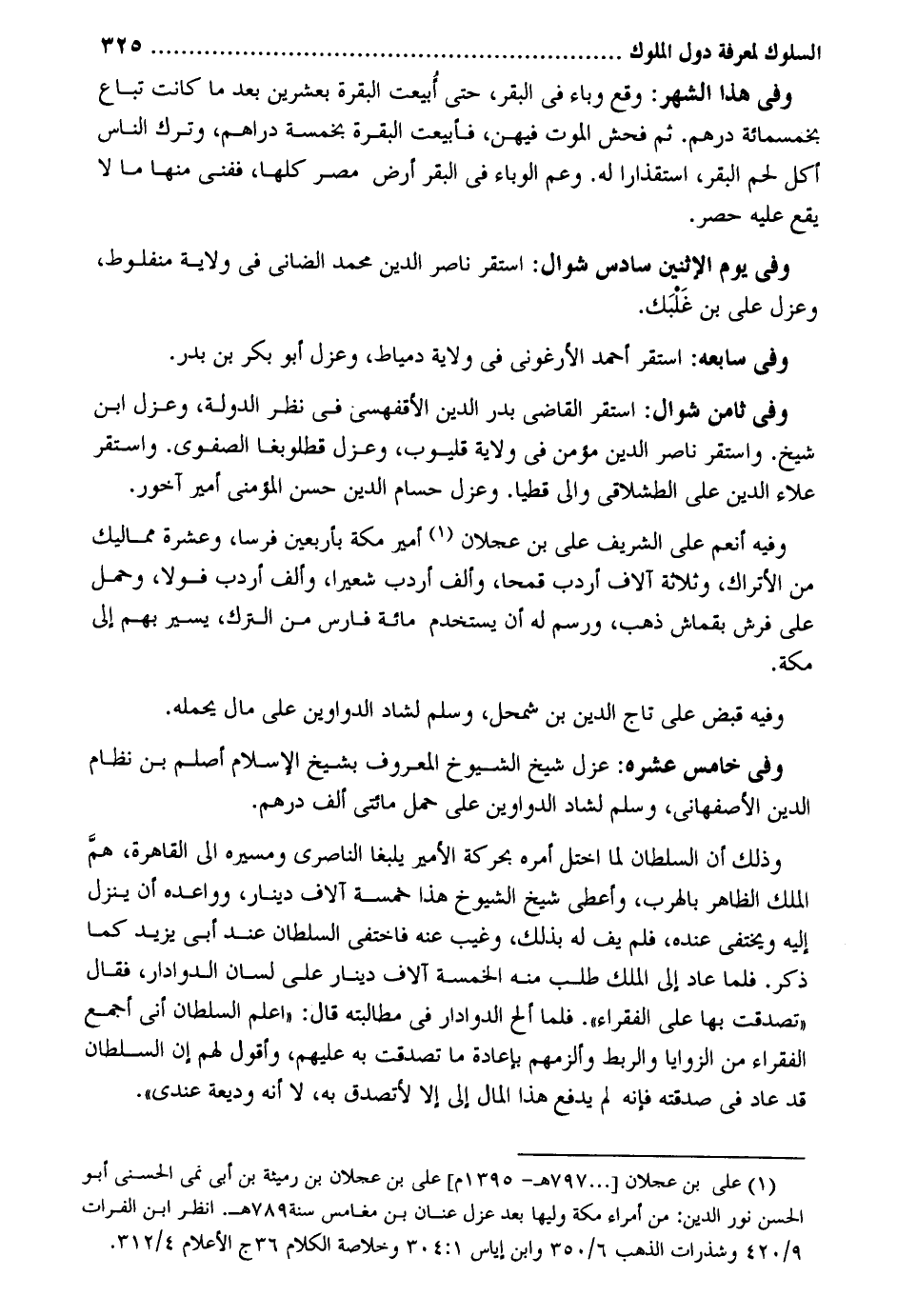 وَفي هَذَا الشَّهْر: وَقع وباء فِي الْبَقر حَتَّى أبيعت الْبَقَرَة بِعشْرين بعد مَا كَانَت تبَاع بِخَمْسِمِائَة دِرْهَم. ثمَّ فحش الْمَوْت فِيهِنَّ فأبيعت الْبَقَرَة بِخَمْسَة دَرَاهِم وَترك النَّاس أكل لحم الْبَقر استقذاراً لَهُ. وَعم الوباء فِي الْبَقر أَرض مصر كلهَا ففنى مِنْهَا مَا لَا يَقع عَلَيْهِ حصر. وَفِي يَوْم الِاثْنَيْنِ سادس شَوَّال: اسْتَقر نَاصِر الدّين مُحَمَّد الضاني فِي ولَايَة منفلوط وعزل على بن غَلْبَك. وَفِي سابعه: اسْتَقر أَحْمد الأرغوني فِي ولَايَة دمياط وعزل أَبُو بكر بن بدر. وَفِي ثامن شَوَّال: اسْتَقر القَاضِي بدر الدّين الأقفهسي فِي نظر الدولة وعزل ابْن شيخ. وَاسْتقر نَاصِر الدّين مُؤمن فِي ولَايَة قليوب وعزل قطلوبغا الصفوي. وَاسْتقر عَلَاء الدّين على الطشملاقي وَالِي قطيا. وعزل حسام الدّين حسن المؤمني أَمِير آخور. وَفِيه أنعم على الشريف عَليّ بن عجلَان أَمِير مَكَّة بِأَرْبَعِينَ فرسا وَعشرَة مماليك من الأتراك وَثَلَاثَة آلَاف أردب قمحاً وَألف أردب شَعِيرًا وَألف أردب فولاً وَحمل على فرش بقماش ذهب ورسم لَهُ أَن يستخدم مائَة فَارس من التّرْك يسير بهم إِلَى مَكَّة. وَفِيه قبض على تَاج الدّين بن كحل وَسلم لشاد الدواويِن على مَال يحملهُ. وَفِي خَامِس عاشره: عزل شيخ الشُّيُوخ الْمَعْرُوف بشيخ الْإِسْلَام أصلم بن نظام الدّين الْأَصْفَهَانِي وَسلم لشاد الدَّوَاوِين على حمل مِائَتي ألف دِرْهَم. وَذَلِكَ أَن السُّلْطَان لما اخْتَلَّ أمره بحركة الْأَمِير يلبغا الناصري ومسيره إِلَى الْقَاهِرَة همَّ الْملك الظَّاهِر بالهرب وَأعْطى شيخ الشُّيُوخ هَذَا خَمْسَة آلَاف دِينَار وواعده أَن ينزل إِلَيْهِ ويختفي عِنْده فَلم يِف لَهُ بذلك وغيب عَنهُ فاختفي السُّلْطَان عِنْد أبي يزِيد كَمَا ذكر. فَلَمَّا عَاد إِلَى الْملك طلب مِنْهُ الْخَمْسَة آلَاف دِينَار على لِسَان الدوادار فَقَالَ تَصَدَّقت بهَا على الْفُقَرَاء. فَلَمَّا ألح الدوادار فِي مُطَالبَته قَالَ: أعلم السُّلْطَان أَنِّي أجمع الْفُقَرَاء من الزوايا والربط وألزمهم بِإِعَادَة مَا تَصَدَّقت بِهِ عَلَيْهِم وَأَقُول لَهُم إِن لسلطان قد عَاد فِي صدقته فَإِنَّهُ لم يدْفع هَذَا المالل إِلَيّ إِلَّا لأتصدق بِهِ لَا أَنه وَدِيعَة عِنْدِي.