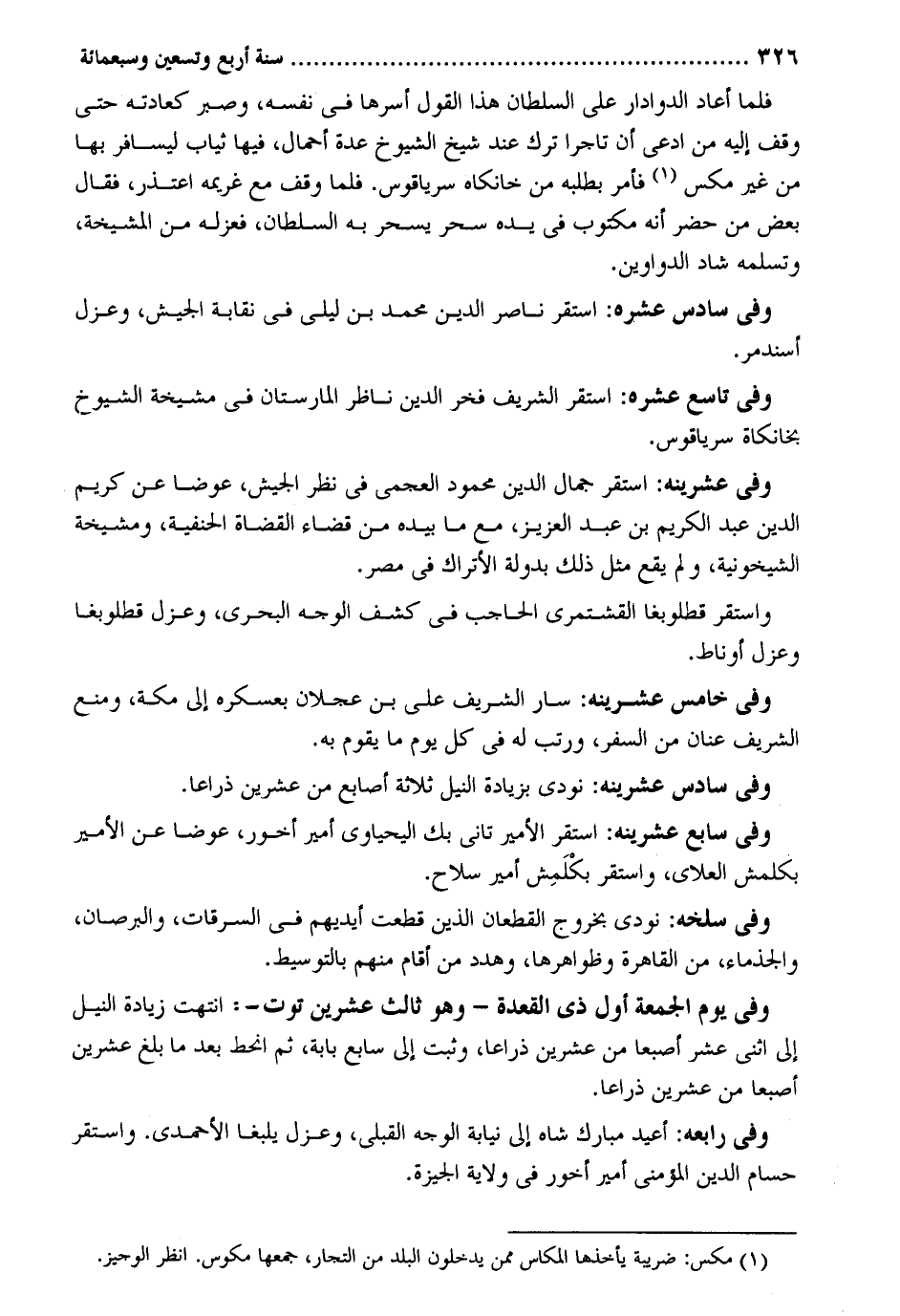 فَلَمَّا أعَاد الدوادار على السُّلْطَان هَذَا القَوْل أسرها فِي نَفسه وَصبر كعادته حَتَّى وقف إِلَيْهِ من ادّعى أَن تَاجِرًا ترك عِنْد شيخ الشُّيُوخ عدَّة أحمال فِيهَا ثِيَاب ليسافر بهَا من غير مكر فَأمر بِطَلَبِهِ من خانكاه سرياقوس. فَلَمَّا وقف مَعَ غَرِيمه اعتذر فَقَالَ بعض من حضر أَنه مَكْتُوب فِي يَده سحر يسحر بِهِ السُّلْطَان فَعَزله من المشيخة وتسلمه شاد الدَّوَاوِين. وَفِي سادس عشره: اسْتَقر نَاصِر الدّين مُحَمَّد بن ليلى فِي نقابة الْجَيْش وعزل أسندمر. وَفِي تَاسِع عشره: اسْتَقر الشريف فَخر الدّين نَاظر المارستان فِي مشيخة الشيويخ بخانكاة سرياقوس. وَفِي عشرينه: اسْتَقر جمال الدّين مَحْمُود العجمي فِي نظر الجيمش عوضا عَن كريم الدّين عبد الْكَرِيم بن عبد الْعَزِيز مَعَ مَا بِيَدِهِ من قَضَاء الْقُضَاة الْحَنَفِيَّة ومشيخة الشيخونية وَلم يَقع مثل ذَلِك بدولة الأتراك فِي مصر. وَاسْتقر قطلوبغا القشتمري الْحَاجِب فِي كشف الْوَجْه البحري وعزل قطلوبغا وعزل أوناط. وَفِي خَامِس عشرينه: سَار الشريف عَليّ بن عجلَان بعسكره إِلَى مَكَّة وَمنع الشريف عنان من السّفر ورتب لَهُ فِي كل يَوْم مَا يقوم بِهِ. وَفِي سادس عشرينه: نُودي بِزِيَادَة النّيل ثَلَاثَة أَصَابِع من عشْرين ذِرَاعا. وَفِي سَابِع عشرينه: اسْتَقر الْأَمِير تاني بك اليحياوي أَمِير أخور عوضا عَن الْأَمِير بكلمش وَفِي سلخه: نُودي بِخُرُوج القطعان الَّذين قطعت أَيْديهم فِي السرقات والبرصان والجذماء من الْقَاهِرَة وظواهرها وهمد من أَقَامَ مِنْهُم بالتوسيط. وَفِي يَوْم الْجُمُعَة أول ذِي الْقعدَة - وَهُوَ ثَالِث عشْرين توت -: انْتَهَت زِيَادَة النّيل إِلَى اثْنَي عشر إصبعاً من عشْرين ذِرَاعا وَثَبت إِلَى سَابِع بَابه ثمَّ انحط بعد مَا بلغ عشْرين إصبعاً من عشْرين ذِرَاعا. وَفِي رابعه: أُعِيد مبارك شاه إِلَى نِيَابَة الْوَجْه القبلي وعزل يلبغا الأسعدي. وَاسْتقر حسام الدّين المؤمني أَمِير أخور فِي ولَايَة الجيزة.