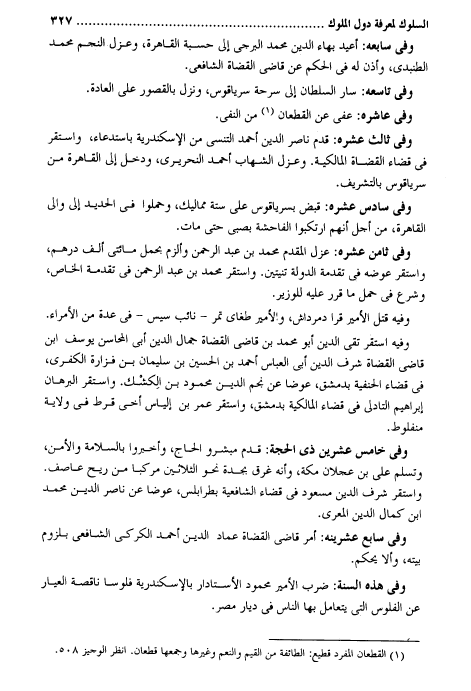 وَفِي سابعه: أُعِيد بهاء الدّين مُحَمَّد الْبُرْجِي إِلَى حسبَة الْقَاهِرَة وعزل النَّجْم مُحَمَّد الطنبدي وَأذن لَهُ فِي الحكم عَن قَاضِي الْقُضَاة الشَّافِعِي. وَفِي تاسعه: سَار السُّلْطَان إِلَى سرحة سرياقوس وَنزل بالقصور على الْعَادة. وَفِي عاشره: عُفيَ عَن القطعان من النَّفْي. وَفِي ثَالِث عشره: قدم نَاصِر الدّين أَحْمد التنسي من الْإسْكَنْدَريَّة باستدعاء وَاسْتقر فِي قَضَاء الْقُضَاة الْمَالِكِيَّة. وعزل الشهَاب أَحْمد النحريري وَدخل إِلَى الْقَاهِرَة من سرياقوس بالتشريف. وَفِي سادس عشره: قبض بسرياقوس على سِتَّة مماليك وحملوا فِي الْحَدِيد إِلَى وَالِي الْقَاهِرَة من وَفِي ثامن عشره: عزل الْمُقدم مُحَمَّد بن عبد الرَّحْمَن وألزم بِحمْل مِائَتي ألف دِرْهَم وَاسْتقر عوضه فِي تقدمة الدولة تنيتين. وَاسْتقر مُحَمَّد بن عبد الرَّحْمَن فِي تقدمة الْخَاص وَشرع فِي حمل مَا قرر عَلَيْهِ للوزير. وَفِيه قتل الْأَمِير قرا دمرداش والأمير طغاي تمر - نَائِب سيس - فِي عدَّة من الْأُمَرَاء. وَفِيه اسْتَقر تَقِيّ الدّين أَبُو مُحَمَّد بن قَاضِي الْقُضَاة جمال الدّين أَبى المحاسن يُوسُف ابْن قَاضِي الْقُضَاة شرف الدّين أبي الْعَبَّاس أَحْمد بن الْحُسَيْن بن سُلَيْمَان بن فَزَارَة الكفري فِي قَضَاء الْحَنَفِيَّة بِدِمَشْق عوضا عَن نجم الدّين مَحْمُود بن الِكشْك. وَاسْتقر الْبُرْهَان إِبْرَاهِيم التادلي فِي قَضَاء الْمَالِكِيَّة بِدِمَشْق وَاسْتقر عمر بن إلْيَاس أخي قرط فِي ولَايَة منفلوط. وَفِي خَامِس عشْرين ذِي الْحجَّة: قدم مبشرو الْحَاج وأخبروا بالسلامة والأمن وتسلم على بن عجلَان مَكَّة وَأَنه غرق بجدة نَحْو الثَّلَاثِينَ مركبا من ريح عاصف. وَاسْتقر شرف الدّين مَسْعُود فِي قَضَاء الشَّافِعِيَّة بطرابلس عوضا عَن نَاصِر الدّين مُحَمَّد ابْن كَمَال الدّين المعري. وَفِي سَابِع عشرينه: أَمر قَاضِي الْقُضَاة عماد الدّين أَحْمد الكركي الشَّافِعِي بِلُزُوم بَيته وَألا يحكم. وَفِي هده السّنة: ضرب الْأَمِير مَحْمُود الأستادار بالإسكندرية فُلُوسًا نَاقِصَة الْعيار عَن الْفُلُوس الَّتِي يتعامل بهَا النَّاس فِي ديار مصر.