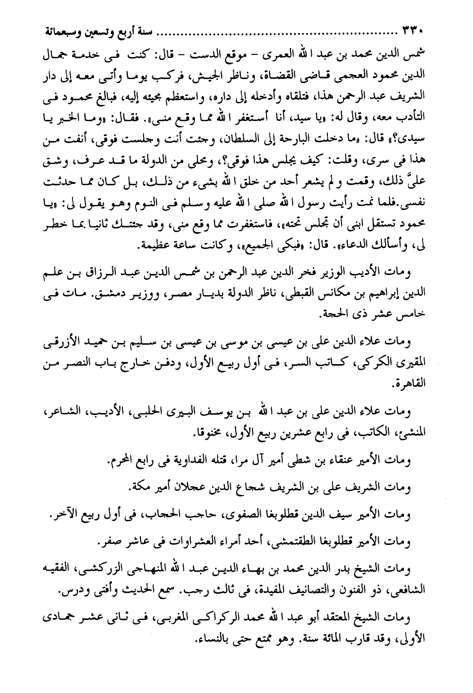 شمس الدّين مُحَمَّد بن عبد الله الْعمريّ - موقع الدست - قَالَ: كنت فِي خدمَة جمال الدّين مَحْمُود العجمي قَاضِي الْقُضَاة وناظر الْجَيْش فَركب يَوْمًا وأتى مَعَه إِلَى دَار الشريف عبد الرَّحْمَن هَذَا فَتَلقاهُ وَأدْخلهُ إِلَى دَاره واستعظم مَجِيئه إِلَيْهِ فَبَالغ مَحْمُود فِي التأدب مَعَه وَقَالَ لَهُ: يَا سيد أَنا أسْتَغْفر الله مِمَّا وَقع مني. فَقَالَ: وَمَا الْخَبَر يَا سَيِّدي قَالَ: مَا دخلت البارحة إِلَى السُّلْطَان وَجئْت أَنْت وَجَلَست فَوقِي أنفت من هَذَا فِي سري وَقلت: كَيفَ يجلس هَذَا فَوقِي ومحلي من الدولةَ مَا قد عرف وشق عليَّ ذَلِك وَقمت وَلم يشْعر أحد من خلق الله بِشَيْء من ذَلِك بل كَانَ مِمَّا حدثت نَفسِي. فَلَمَّا نمت رَأَيْت رَسُول الله صلى الله عَلَيْهِ وَسلم فِي النّوم وَهُوَ يَقُول لي: يَا مَحْمُود تستقل ابْني أَن تجْلِس تَحْتَهُ فاستغفرت مِمَّا وَقع مني وَقد جئْتُك ثَانِيًا بِمَا خطر لي وَمَات الأديب الْوَزير فَخر الدّين عبد الرَّحْمَن بن شمس الدّين عبد الرَّزَّاق بن علم الدّين إِبْرَاهِيم بن مكانس القبطي نَاظر الدولة بديار مصر ووزير دمشق. مَاتَ فِي خَامِس عشر ذِي الْحجَّة. وَمَات عَلَاء الدّين عَليّ بن عِيسَى بن مُوسَى بن عِيسَى بن سليم بن حميد الْأَزْرَقِيّ المقيري الكركي كَاتب السِّرّ فِي أول ربيع الأول وَدفن خَارج بَاب النَّصْر من الْقَاهِرَة. وَمَات عَلَاء الدّين عَليّ بن عبد الله بن يُوسُف البيري الْحلَبِي الأديب الشَّاعِر المنشئ الْكَاتِب فِي رَابِع عشْرين ربيع الأول مخنوقاً. وَمَات الْأَمِير عنقاء بن شطي أَمِير آل مرا قَتله الفداوية فِي رَابِع الْمحرم. وَمَات الشريف عَليّ بن الشريف شُجَاع الدّين عجلَان أَمِير مَكَّة. وَمَات الْأَمِير سيف الدّين قطلوبغا الصفوي حَاجِب الْحَاجِب فِي أول ربيع الآخر. وَمَات الْأَمِير قطلوبغا الطقتمشي أحد أُمَرَاء العشراوات فِي عَاشر صفر. وَمَات الشَّيْخ بدر الدّين مُحَمَّد بن بهاء الدّين عبد الله المنهاجي الزَّرْكَشِيّ الْفَقِيه الشَّافِعِي ذُو الْفُنُون والتصانيف المفيدة فِي ثَالِث رَجَب. سمع الحَدِيث وَأفْتى ودرس. وَمَات الشَّيْخ المعتقد أَبُو عبد الله مُحَمَّد الركراكي المغربي فِي ثَانِي عشر جُمَادَى الأولى وَقد قَارب الْمِائَة سنة. وَهُوَ ممتع حَتَّى بِالنسَاء.