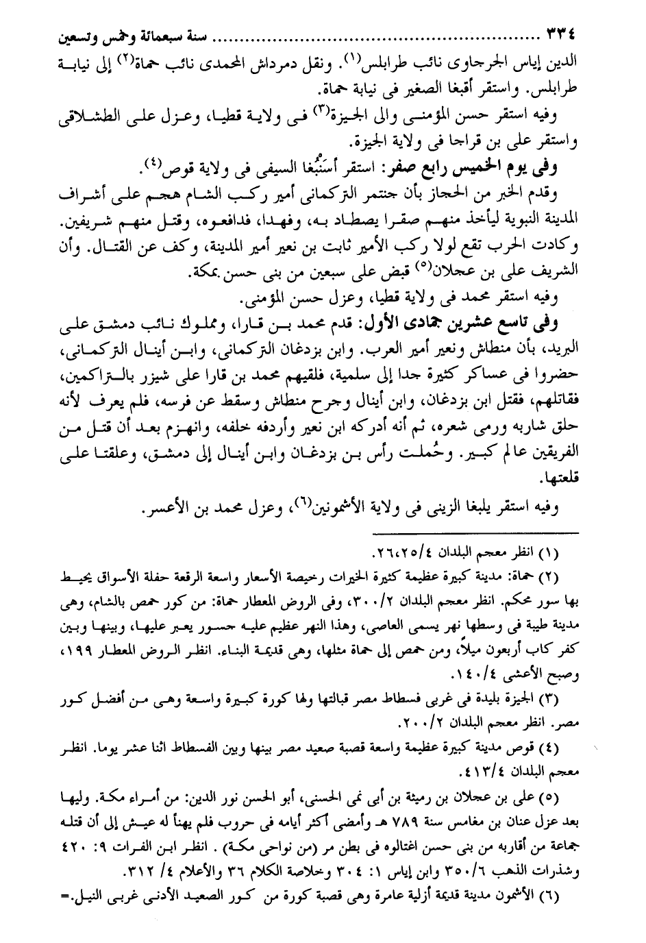 الدّين إِيَاس الجرجاوي نَائِب طرابلس. وَنقل دمرداش المحمدي نَائِب حماة إِلَى نِيَابَة طرابلس. وَاسْتقر أقبغا الصَّغِير فِي وَفِيه اسْتَقر حسن المؤمني وَالِي الجيزة فِي ولَايَة قطا وعزل على الطشلاقي وَاسْتقر على بن قراجا فِي ولَايَة الجيزة. وَفِي يَوْم الْخَمِيس رَابِع صفر: اسْتَقر أسَنْبُغا السيفي فِي ولَايَة قوص. وَقدم الْخَبَر من الْحجاز بِأَن جنتمر التركماني أَمِير ركب الشَّام هجم على أَشْرَاف الْمَدِينَة النَّبَوِيَّة ليَأْخُذ مِنْهُم صقراً يصطاد بِهِ وفهداً فدافعوه وَقتل مِنْهُم شريفين. وكادت الْحَرْب تقع لَوْلَا ركب الْأَمِير ثَابت بن نعير أَمِير المدينةَ وكف عَن الْقِتَال. وَأَن الشريف عَليّ بن عجلَان قبض على سبعين من بني حسن بِمَكَّة. وَفِيه اسْتَقر مُحَمَّد فِي ولَايَة قطيا وعزل حسن المؤمني. وَفِي تَاسِع عشْرين جُمَادَى الأول: قدم مُحَمَّد بن قارا ومملوك نَائِب دمشق على الْبَرِيد بِأَن منطاش ونعر أَمِير الْعَرَب. وَابْن بزدغان التركماني وَابْن أينال التركماني حَضَرُوا فِي عَسَاكِر كَثِيرَة جحا إِلَى سلمية فَلَقِيَهُمْ مُحَمَّد بن قارا على شيزر بالتراكمين فَقَاتلهُمْ فَقتل ابْن بزدغان وَابْن أينال وجرح منطاش وَسقط عَن فرسه فَلم يعرف لِأَنَّهُ حلق شَاربه وَرمى شعره ثمَّ أَنه أدْركهُ ابْن نعير وأردفه خَلفه وَانْهَزَمَ بعد أَن قتل من الْفَرِيقَيْنِ عَالم كَبِير. وحُملت رَأس بن بزدغان وَابْن أينال إِلَى دمشق وعلفتا على قلعتها. وَفِيه اسْتَقر يلبغا الزيني فِي ولَايَة الأشمونين، وعزل مُحَمَّد بن الأعسر.