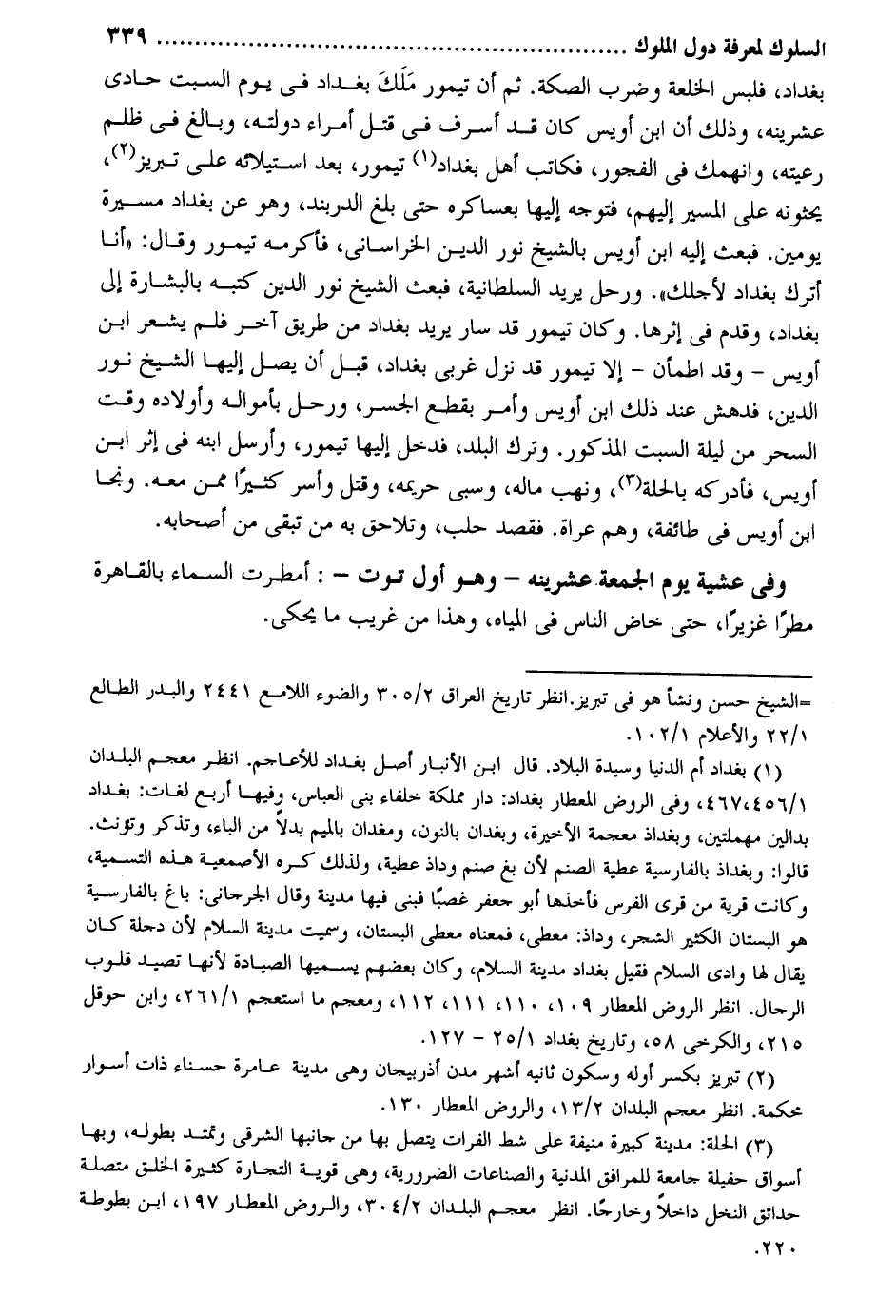 بَغْدَاد فَلبس الخلعة وَضرب الصكة. ثمَّ أَن تيمور مَلَكَ بَغْدَاد فِي يَوْم السبت حادي عشرينه وَذَلِكَ أَن ابْن أويس كَانَ قد أسرف فِي قتل أُمَرَاء دولته وَبَالغ فِي ظلم رَعيته وانهمك فِي الْفُجُور فكاتب أهل بَغْدَاد تيمور بعد استيلائه على تبريز يحثونه على الْمسير إِلَيْهِم فَتوجه إِلَيْهَا بعساكره حَتَّى بلغ الدربند وَهُوَ عَن بَغْدَاد مسيرَة يَوْمَيْنِ. فَبعث إِلَيْهِ ابْن أويس بالشيخ نور الدّين الْخُرَاسَانِي فَأكْرمه تيمور وَقَالَ: أَنا أترك بَغْدَاد لِأَجلِك. ورحل يُرِيد السُّلْطَانِيَّة فَبعث الشَّيْخ نور الدّين كتبه بالبشارة إِلَى بَغْدَاد وَقدم فِي إثْرهَا. وَكَانَ تيمور قد سَار يُرِيد بَغْدَاد من طَرِيق أخر فَلم يشْعر ابْن أويس - وَقد اطْمَأَن - إِلَّا تيمور قد نزل غربي بَغْدَاد قبل أَن يصل إِلَيْهَا الشَّيْخ نور الدّين فدهش عِنْد ذَلِك ابْن أويس وَأمر بِقطع الجسر ورحل بأمواله وَأَوْلَاده وَقت السحر من لَيْلَة السبت الْمَذْكُور. وَترك الْبِلَاد فَدخل إِلَيْهَا تيمور وَأرْسل ابْنه فِي إِثْر ابْن أويس فأدركه بالحلة وَنهب مَاله وسبى حريمه وَقتل وَأسر كثيرا مِمَّن مَعَه. وَنَجَا ابْن أويس فِي طَائِفَة وهم عُرَاة. فقصد حلب وتلاحق بِهِ من تبقى من أَصْحَابه. وَفِي عَشِيَّة يَوْم الْجُمُعَة. عشرينه - وَهُوَ أول توت -: أمْطرت السَّمَاء بِالْقَاهِرَةِ مَطَرا غزيراً حَتَّى خَاضَ النَّاس فِي الْمِيَاه وَهَذَا من غَرِيب مَا يحْكى.