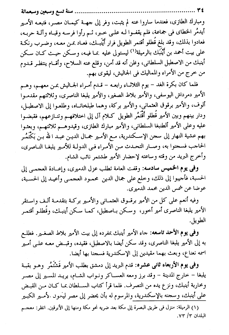 ومبارك الطازي فعندما سَارُوا عَنهُ لم يثبت وفر إِلَى جِهَة كيمان مصر فَتَبِعَهُ الْأَمِير أيدمر الخطاي فِي جمَاعَة فَلم يقفوا لَهُ على خبر ثمَّ رَأَوْا فرسه وقباه وَآلَة حربه فعادوا بذلك وَقد بلغ قطلو أقتمر الطَّوِيل فرار أينبك فَعَاد بِمن مَعَه وَضرب رنكة على بَيت أَحْمد بن أينبك بالرميلة ليستولي عَلَيْهِ. بِمَا فِيهِ وَسكن حَيْثُ كَانَ سكن أينبك من الإصطبل السلطاني وَظن أَنه قد أَمن وَقلع عَنهُ السِّلَاح وَأقَام ينْتَظر قدوم من خرج من الْأُمَرَاء والمماليك فِي الجاليش ليقوى بهم. فَلَمَّا كَانَ بكرَة الْغَد - يَوْم الثُّلَاثَاء رابعه - قدم أُمَرَاء الجاليش. بِمن مَعَهم وهم الْأَمِير دمرداش اليوسفي والأمير بلاط الصَّغِير والأمير يلبغا الناصري وثلاثتهم مقدموا أُلُوف والأمير برقوق العثماني والأمير بركَة وهما طبلخاناه وطلعوا إِلَى الإصطبل وَدَار بَينهم وَبَين الْأَمِير قطلو أقتمر الطَّوِيل كَلَام آل إِلَى اخْتلَافهمْ وتنازعهم فقبضوا عَلَيْهِ وعَلى الْأَمِير ألطنبغا السلطاني والأمير مبارك الطازي وقيدوهم ثَلَاثَتهمْ وبعثوا بهم عَشِيَّة النَّهَار إِلَى سجن الْإسْكَنْدَريَّة مَعَ الْأَمِير جمال الدّين عبد الله بن بكتمر الْحَاجِب فسجنوا بِهِ وَصَارَ التحدث من الْأُمَرَاء فِي الدولة للأمير يلبغا الناصري وَأخرج الْبَرِيد من وقته وساعته لإحضار الْأَمِير طشتمر نَائِب الشَّام. وَفِي يَوْم الْخَمِيس سادسه: وقفت الْعَامَّة تطلب عزل الدَّمِيرِيّ وإعادة العجمي إِلَى الْحِسْبَة فأجيبوا إِلَى ذَلِك وخلع على جمال الدّين مَحْمُود العجمي وأعيد إِلَى الْحِسْبَة عوضا عَن شمس الدّين مُحَمَّد الدَّمِيرِيّ. وَفِيه أنعم على كل من الْأَمِير برقوق العثماني والأمير بركَة بتقدمة ألف وَاسْتقر الْأَمِير يلبغا الناصري أَمِير أخور وَسكن بإصطبل كَمَا سكن أينبك وقطلو أقتمر وَفِي يَوْم الْأَحَد تاسعه: جَاءَ الْأَمِير أينبك. بمفرده إِلَى بَيت الْأَمِير بلاط الصَّغِير. فطلع بِهِ إِلَى الْأَمِير يلبغا الناصري وَقد سكن أَيْضا بالإصطبل فقيده وَقبض مَعَه على أَمِير اسْمه نعناع وَبعث بهما مقيدين إِلَى الْإسْكَنْدَريَّة فسجنا بهَا أَيْضا. وَفِي يَوْم الْأَرْبَعَاء ثَانِي عشره: قدم الْبَرِيد إِلَى دمشق بِطَلَب الْأَمِير قشتمر وَهُوَ بقبة يلبغا - خَارج الْمَدِينَة - وَقد برز وَمَعَهُ العساكر ونواب الشَّام يُرِيد الْمسير إِلَى مصر ومحاربة أينبك وَنزع يَده من التَّصَرُّف. فَلَمَّا قَرَأَ كتاب السُّلْطَان. بِمَا كَانَ من الْقَبْض على أينبك وسجنه بالإسكندرية والمرسوم لَهُ بِأَن يحضر إِلَى مصر ليَكُون الْأَمِير الْكَبِير