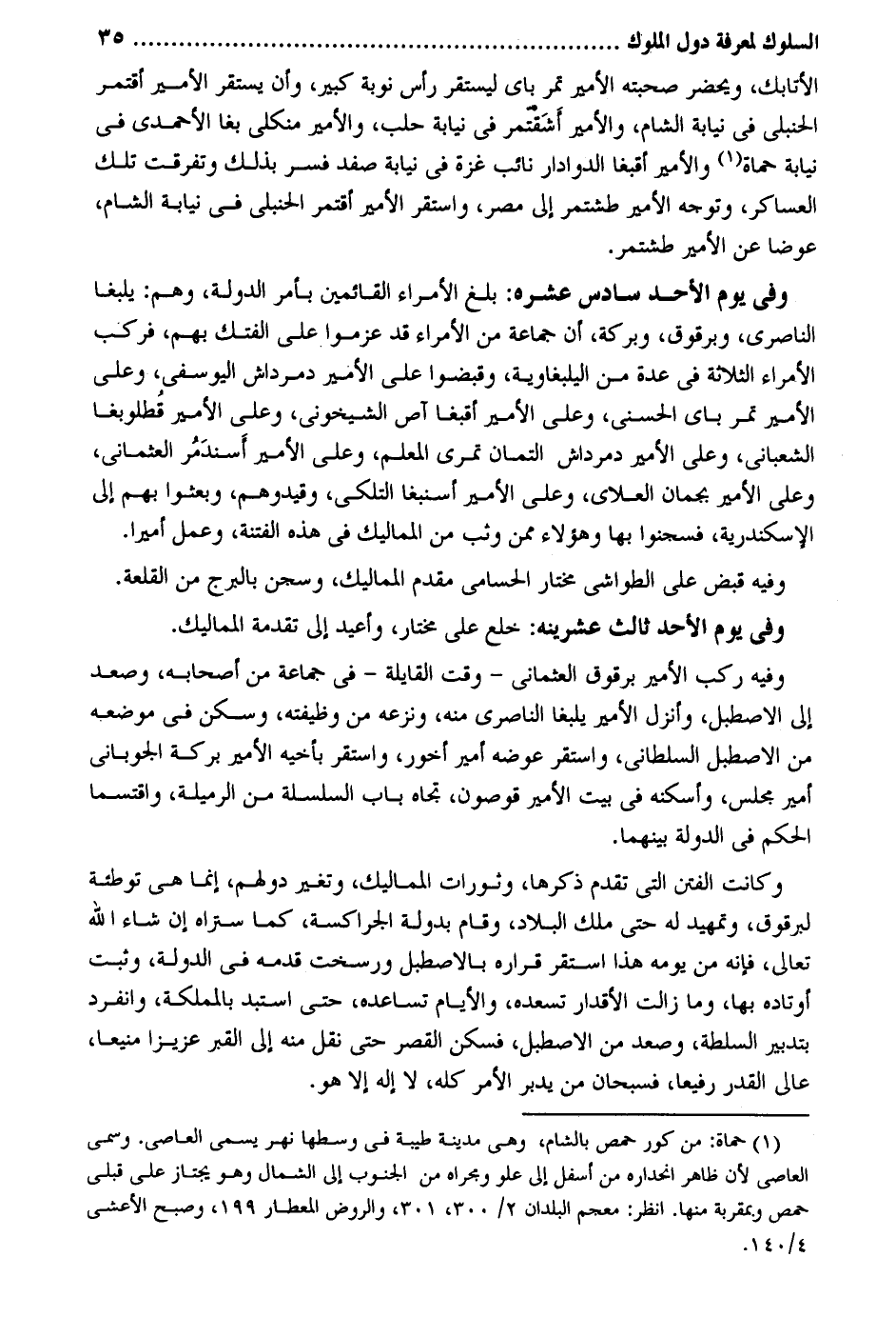 الأتابك ويحضر صحبته الْأَمِير تمرباى ليستقر رَأس نوبَة كَبِير وَأَن يسْتَقرّ الْأَمِير أقتمر الْحَنْبَلِيّ فِي نِيَابَة الشَّام والأمير أشقتمر فِي نِيَابَة حلب والأميرمنكلي بغا الأحمدي فِي نِيَابَة حماة والأمير أقبغا الدوادار نَائِب غَزَّة فِي نِيَابَة صفد فسر بذلك وَتَفَرَّقَتْ تِلْكَ العساكر وَتوجه الْأَمِير طشتمر إِلَى مصر وَاسْتقر الْأَمِير أقتمر الْحَنْبَلِيّ فِي نِيَابَة الشَّام عوضا عَن الْأَمِير طشتمر. وَفِي يَوْم الْأَحَد سادس عشره: بلغ الْأُمَرَاء القائمين بِأَمْر الدولة وهم: يلبغا الناصري وبرقوق وبركة أَن جمَاعَة من الْأُمَرَاء قد عزموا على الفتك بهم فَركب الْأُمَرَاء الثَّلَاثَة فِي عدَّة من اليلبغاوية وقبضوا على الْأَمِير دمرداش اليوسفي وعَلى الْأَمِير تمر باى الحسني وعَلى الْأَمِير آقبغا آص الشيخوني وعَلى الْأَمِير قطلوبغا الشَّعْبَانِي وعَلى الْأَمِير دمرداش التمان تمرى الْمعلم وعَلى الْأَمِير أسندمر العثماني وعَلى الْأَمِير بجمان العلاي وعَلى الْأَمِير أسنبغا التلكي وقيدوهم وبعثوا بهم إِلَى الْإسْكَنْدَريَّة فسجنوا بهَا وَهَؤُلَاء مِمَّن وثب من المماليك فِي هَذِه الْفِتْنَة وَعمل أَمِيرا. وَفِيه قبض على الطواشي مُخْتَار الحسامي مقدم المماليك وسجن بالبرج من القلعة. وَفِي يَوْم الْأَحَد ثَالِث عشرينه: خلع على مُخْتَار وأعيد إِلَى تقدمة المماليك. وَفِيه ركب الْأَمِير برقوق العثماني - وَقت القايلة - فِي جمَاعَة من أَصْحَابه وَصعد إِلَى الإصطبل وَأنزل الْأَمِير يلبغا الناصري مِنْهُ ونزعه من وظيفته وَسكن فِي مَوْضِعه من الأصطبل السلطاني وَاسْتقر عوضه أَمِير أخور وَاسْتقر بأَخيه الْأَمِير بركَة الجوباني أَمِير مجْلِس وَأَسْكَنَهُ فِي بَيت الْأَمِير قوصون تجاه بَاب السلسلة من الرميلة واقتسما الحكم فِي الدولة بَينهمَا. وَكَانَت الْفِتَن الَّتِي تقدم ذكرهَا وثورات المماليك وَتغَير دولهم إِنَّمَا هِيَ تَوْطِئَة لبرقوق وتمهيد لَهُ حَتَّى ملك الْبِلَاد وَقَامَ بدولة الجراكسة كَمَا ستراه إِن شَاءَ الله تَعَالَى فَإِنَّهُ من يَوْمه هَذَا اسْتَقر قراره بالإصطبل ورسخت قدمه فِي الدولة وَثَبت أوتاده بهَا وَمَا زَالَت الأقدار تساعده وَالْأَيَّام تساعده حَتَّى استبد بالمملكة وَانْفَرَدَ بتدبير السلطة وَصعد من الإصطبل فسكن الْقصر حَتَّى نقل مِنْهُ إِلَى الْقَبْر عَزِيزًا منيعا عالي الْقدر رفيعا فسبحان من يدبر الْأَمر كُله، لَا إِلَه إِلَّا هُوَ.