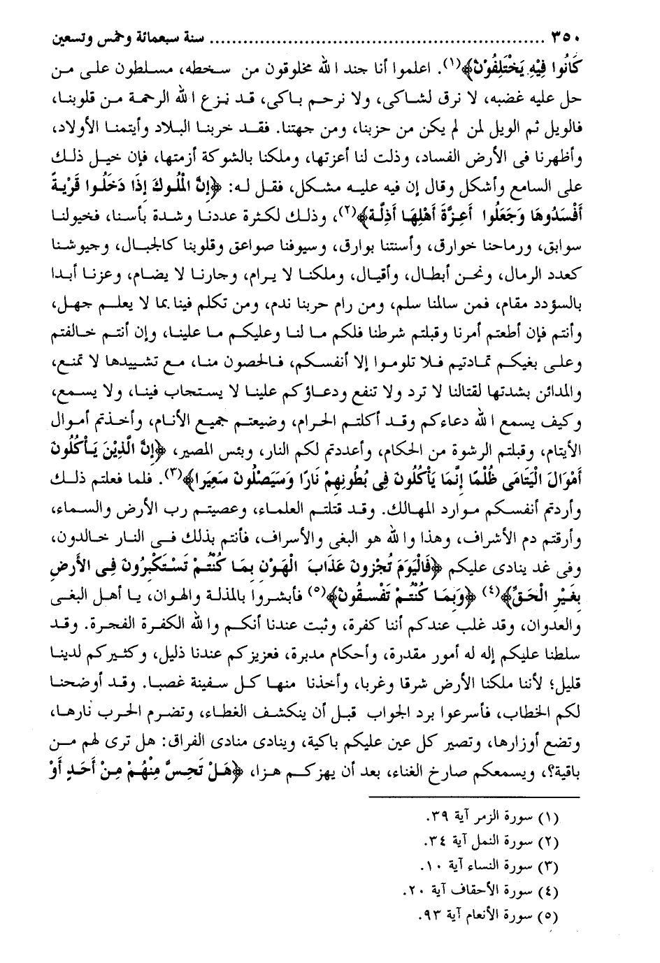 . اعلموا أَنا جند الله مخلوقون من سخطه مسلطون على من حل عَلَيْهِ غَضَبه لَا نرق لشاكي وَلَا نرحم باكي قد نزع الله الرَّحْمَة من قُلُوبنَا فالويل ثمَّ الويل لمن لم يكن من حزبنا وَمن جهتنا. فقد خربنا الْبِلَاد وأيتمنا الْأَوْلَاد وأظهرنا فِي الأَرْض الْفساد وذلت لنا أعزتها وملكنا بِالشَّوْكَةِ أزمتها فَإِن خيل ذَلِك على السَّامع وأشكل وَقَالَ إِن فِيهِ عَلَيْهِ مُشكل فَقل لَهُ: إِن الملُوكَ إِذَا دَخَلُوا قَرْيةً أَفْسَدُوهَا وَجَعَلُوا أَعِزةَ أَهْلِهَا أَذِلة وَذَلِكَ لِكَثْرَة عددنا وَشدَّة بأسنا فخيولنا سوابق ورماحنا خوارق وأسنتنا بوارق وسيوفنا صواعق وقلوبنا كالجبال وجيوشنا كعمد الرمال وَنحن أبطال وأقيال وملكنا لَا يرام وجارنا لَا يضام وعزنا أبدا بالسؤدد مقَام فَمن سالمنا سلم وَمن رام حربنا نَدم وَمن تكلم فِينَا بِمَا لَا يعلم جهل وَأَنْتُم فَإِن أطعتم أمرنَا وقبلتم شرطنا فلكم مَا لنا وَعَلَيْكُم مَا علينا وَإِن أَنْتُم خالفتم وعَلى بَغْيكُمْ تماديتم فَلَا تلوموا إِلَّا أَنفسكُم فالحصون منا مَعَ تشييدها لَا تمنع والمدائن بشدتها لقتالنا لَا ترد وَلَا تَنْفَع ودعاؤكم علينا لَا يُسْتَجَاب فِينَا وَلَا يسمع وَكَيف يسمع الله دعاءكم وَقد أكلْتُم الْحَرَام وضيعتم جَمِيع الْأَنَام وأخذتم أَمْوَال الْأَيْتَام وقبلتم الرِّشْوَة من الْحُكَّام وأعددتم لكم النَّار وَبئسَ الْمصير إِن الذِيْنَ يَأْكُلُون أَمْوَالَ الْيَتَامَى ظُلماً إِنمَا يَأْكُلُون فِي بُطُونِهِمْ نَاراً وَسيصلون سعِيَراً. فَلَمَّا فَعلْتُمْ ذَلِك وأردتم أَنفسكُم موارد المهالك. وَقد قتلتم الْعلمَاء وعصيتم رب الأَرْض وَالسَّمَاء وأرقتم دم الْأَشْرَاف وَهَذَا وَالله هُوَ الْبَغي والإسراف فَأنْتم بذلك فِي النَّار خَالدُونَ وَفِي غَد يُنَادي عَلَيْكُم الْيوَمَ تُجزون عَذَابَ الهَون بمَا كُنْتُم تستَكْبِرُون فِي الأَرضِ بغَيْرِ الْحَق وَبمَا كُنتم تَفْسقُون فأبشروا بالمذلة والهوان يَا أهل الْبَغي وَالعدوان وَقد غلب عنْدكُمْ أننا كفرة وَثَبت عندنَا أَنكُمْ وَالله الْكَفَرَة الفجرة. وَقد سلطنا عَلَيْكُم إِلَه لَهُ أُمُور مقدرَة وَأَحْكَام مُدبرَة فعزيزكم عندنَا ذليل وكثيركم لدينا قَلِيل لأننا ملكنا الأَرْض شرقاً وغرباً وأخذنا مِنْهَا كل سفينة غصبا. وَقد أوضحنا لكم الْخطاب فَأَسْرعُوا برد الْجَواب قبل أَن ينْكَشف الغطاء وتضرم الْحَرْب نارها وتضع أَوزَارهَا وَتصير كل عين عَلَيْكُم باكية وينادي مُنَادِي الْفِرَاق: هَل ترى لَهُم من بَاقِيَة ويسمعكم صارخ الْغناء بعد أَن يهزكم هزاً هلْ تَحِس مِنْهُمْ مِنْ أَحَدٍ أَوْ