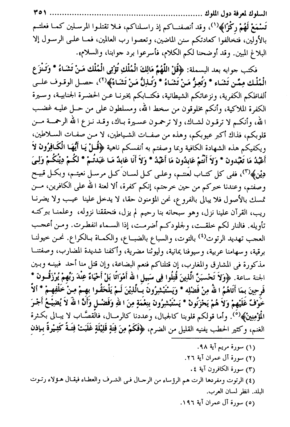 تسمع لَهُم رِكزاً وَقد أنصفناكم إِذْ راسلناكم فَلَا تقتلُوا الْمُرْسلين كَمَا فَعلْتُمْ بالأولين فتخالفوا كعادتكم سنَن الماضين وتعصوا رب الْعَالمين فَمَا على الرَّسُول إِلَّا الْبَلَاغ الْمُبين. وَقد أوضحنا لكم الْكَلَام فَأَسْرعُوا برد جَوَابنَا وَالسَّلَام. فكنب جَوَابه بعد الْبَسْمَلَة: قُل اللْهُم مَالِكَ المُلْكِ تؤتي الْملك مَنْ تَشَاءُ وَتَنْزَع الْمُلْك مِمَّن تَشَاء وتُعِز مَنْ تَشَاءُ وَتُذل مَن تَشَاء حصل الْوُقُوف على ألفاظكم الكفرية ونزعاتكم الشيطانية فكتابكم يخبرنا عَن الحضرة الجنابية وسيرة الْكَفَرَة الملاكية وأنكم مخلوقون من سخط الله ومسلطون على من حل عَلَيْهِ غضب الله وأنكم لَا ترقون لشاك وَلَا ترحمون عسيرة باك وَقد نزع الله الرَّحْمَة من قُلُوبكُمْ فَذَاك أكبر عيوبكم وَهَذِه من صِفَات الشَّيَاطِين لَا من صِفَات السلاطين ويكفيكمِ هَذِه الشَّهَادَة الكافية وَبِمَا وصفتم بِهِ أَنفسكُم ناهية قُل يَا أيهَا الْكَافِرُونَ لاَ أَعبدُ مَا تَعْبدُونَ وَلاَ أَنْتُم عَابدون مَا أَعبد وَلاَ أَنَا عَابد مَا عَبَدتُمْ لكُمْ دِيْنُكُمْ وَليَ دِيْن فَفِي كل كتاب لعَنتم وعَلى كل لِسَان كل مُرْسل نعيتم وَبِكُل قَبِيح وصفتم وَعِنْدنَا خبركم من حِين خَرجْتُمْ إِنَّكُم كفرة أَلا لعنة الله على الْكَافرين من تمسك بالأصول فَلَا يُبَالِي بالفروع نَحن الْمُؤْمِنُونَ حَقًا لَا يدْخل علينا عيب وَلَا يضرنا ريب الْقُرْآن علينا نزل وَهُوَ سُبْحَانَهُ بِنَا رَحِيم لم يزل فتحققنا نُزُوله وَعلمنَا ببركته تَأْوِيله. فَالنَّار لكم خلقت ولجلودكم أضرمت إِذا السَّمَاء انفطرت. وَمن أعجب الْعجب تهديِد الرتوت بالتوت وَالسِّبَاع بالضباع والكماة بِالْكُرَاعِ. نَحن خيولنا برقية وسهامنا عَرَبِيَّة وسيوفنا يَمَانِية وليوثنا مضرية وأكفنا شَدِيدَة الْمضَارب وصفتنا مَذْكُورَة فِي الْمَشَارِق والمغارب إِن قتلناكم فَنعم البضاعة وَإِن قتل منا أحد فبينه وَبَين الْجنَّة سَاعَة. َلاَ تَحْسبَن الذِينَ قُتِلُوا فِي سبيلِ الله أَموَاتاً بَل أَحياء عِندَ رَبهم يرْزقُونَ فَرحِينَ بمَا أتَاهُمُ الله مِنْ فَضله ويستبشرونَ بِالذِينَ لَمْ يَلحقُوا بِهم مِنْ خَلفِهِم أَلا خوْفٌ عَلَيْهم وَلاَ هُم يَحزَنُون يستبشرون بنعمَةٍ مِنَ اللهِ وَفَضْلٍ وَأَن الله لاَ يُضِيعُ أَجْرَ المْؤْمِنِين. وَأما قَوْلكُم قُلُوبنَا كالجبال وَعمدنا كالرمال فالقصَّاب لَا يُبَالِي بِكَثْرَة الْغنم وَكثير الْحَطب يفنيه الْقَلِيل من الضرم كم مِنَ فِئَةٍ قَلِيْلَةٍ غَلَبَت فِئَةً كَثِيْرة بِإذنِ