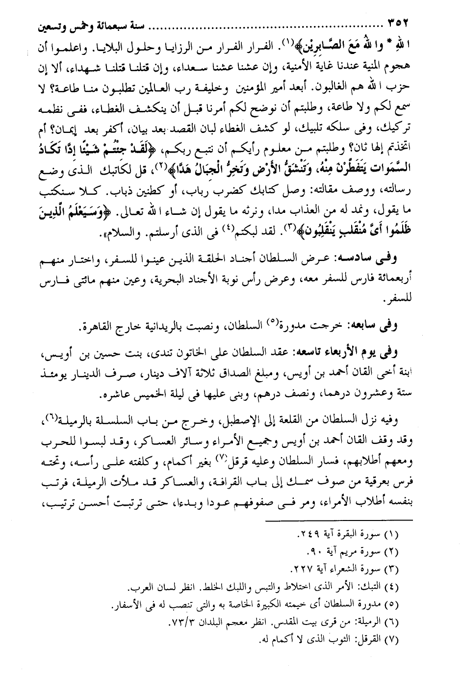اللهِ وَالله مَعَ الصابِرِين. الْفِرَار الْفِرَار من الرزايا وحلول البلايا. وَاعْلَمُوا أَن هجوم الْمنية عندنَا غَايَة الأمنية وَإِن عِشْنَا عِشْنَا سعداء وَإِن قتلنَا قتلنَا شُهَدَاء أَلا إِن حزب الله هم الغالبون. أبعد أَمِير الْمُؤمنِينَ وَخَلِيفَة رب الْعَالمين تطلبون منا طَاعَة. لَا سمع لكم وَلَا طَاعَة وطلبتم أَن نوضح لكم أمرنَا قبل أَن ينْكَشف الغطاء فَفِي نظمه تركيك وَفِي سلكه تلبيك لَو كشف الغطاء لبان الْقَصْد بعد بَيَان أكفر بعد إِيمَان. أم اتخذتم إِلَهًا ثَان. وطلبتم من مَعْلُوم رَأْيكُمْ أَن نتبع ربكُم لَقَدْ جئتمْ شَيئاً إِدا تكادُ السمَوات يَتَفَطرْن مِنْهُ وَتَنْشَقُّ الأَرْض وَتَخِرُّ الجبالُ هَدا قل لكَاتبك الَّذِي وضع رسَالَته وَوصف مقَالَته: وصل كتابك كضرب ربَاب أَو كطنين ذُبَاب. كلا سنكتب مَا يَقُول ونمد لَهُ من الْعَذَاب مدا ونرثه مَا يَقُول إِن شَاءَ الله تَعَالَى. وسيَعْلَمُ الذِينَ ظَلَمُوا أَيَّ مُنْقَلبٍ يَنْقَلِبُون. لقد لبكتم فِي الَّذِي أرسلتم. وَالسَّلَام. وَفِي سادسه: عرض السُّلْطَان أجناد الْحلقَة الَّذين عينوا للسَّفر وَاخْتَارَ مِنْهُم أَرْبَعمِائَة فَارس للسَّفر مَعَه وَعرض رَأس نوبَة الأجناد البحرية وَعين مِنْهُم مِائَتي فَارس للسَّفر. وَفِي سابعه: خرجت مُدَوَّرَة السُّلْطَان ونصبت بالريدانية خَارج الْقَاهِرَة. وَفِي يَوْم الْأَرْبَعَاء تاسعه عقد السُّلْطَان على الخاتون تندي بنت حُسَيْن بن أويس ابْنة أخي القان أَحْمد بن أويس ومبلغ الصَدَاق ثَلَاثَة آلَاف دِينَار صرف الدِّينَار يَوْمئِذٍ سِتَّة وَعِشْرُونَ درهما وَنصف دِرْهَم وَبنى عَلَيْهَا فِي لَيْلَة الْخَمِيس عاشره. وَفِيه نزل السُّلْطَان من القلعة إِلَى الإصطبل وَخرج من بَاب السلسلة بالرميِلة وَقد وقف القان أَحْمد بن أويس وَجَمِيع الْأُمَرَاء وَسَائِر العساكر وَقد لبسوا للحرب وَمَعَهُمْ أطلابهم فَسَار السُّلْطَان وَعَلِيهِ قرقل بِغَيْر أكمام وكلفته على رَأسه وَتَحْته فرس بعرقية من صوف سمك إِلَى بَاب القرافة والعساكر قد مَلَأت الرميلة فرتَب بِنَفسِهِ أطلاب الْأُمَرَاء وَمر فِي صفوفهم عوداً وبدءاً حَتَّى ترتبت أحسن تَرْتِيب