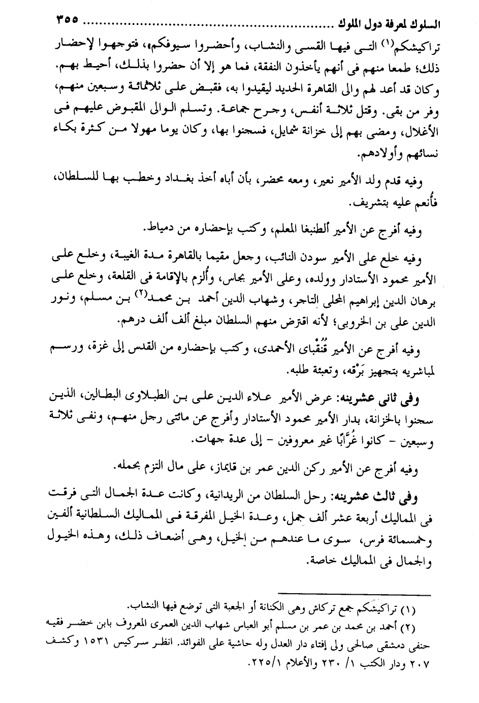 تراكيشكم الَّتِي فِيهَا القسي والنشاب وأحضروا سُيُوفكُمْ فتوجهوا لإحضار بذلك طَمَعا مِنْهُم فِي أَنهم يَأْخُذُونَ النَّفَقَة فَمَا هُوَ إِلَّا أَن حَضَرُوا بذلك أحيط بهم. وَكَانَ قد أعد لَهُم وَالِي الْقَاهِرَة الْحَدِيد ليقيدوا بِهِ فَقبض على ثَلَاثَة وَسبعين مِنْهُم وفر من بَقِي. وَقتل ثَلَاثَة أنفس وجرح جمَاعَة. وتسلم الْوَالِي الْمَقْبُوض عَلَيْهِم فِي الأغلال وَمضى بهم إِلَى خزانَة شمايل فسجنوا بهَا وَكَانَ يَوْمًا مهولاً من كَثْرَة بكاء نِسَائِهِم وَأَوْلَادهمْ. وَفِيه قدم ولد الْأَمِير نعير وَمَعَهُ محْضر بِأَن أَبَاهُ أَخذ بَغْدَاد وخطب بهَا للسُّلْطَان فأنعم عَلَيْهِ بتشريف. وَفِيه أفرج عَن الْأَمِير ألطبغا الْمعلم وَكتب بإحضاره من دمياط. وَفِيه خلع على الْأَمِير سودن النَّائِب وَجعل مُقيما بِالْقَاهِرَةِ مُدَّة الْغَيْبَة وخلع على الْأَمِير مَحْمُود الأستَادار وَولده وعَلى الْأَمِير بجاس وأُلزم بِالْإِقَامَةِ فِي القلعة وخلع على برهَان الدّين إِبْرَاهِيم الْمحلى التَّاجِر وشهاب الدّين أَحْمد بن مُحَمَّد بن مُسلم وَنور الدّين عَليّ بن الخروبي لِأَنَّهُ اقْترض مِنْهُم السُّلْطَان مبلغ ألف ألف دِرْهَم. وَفِيه أفرج عَن الْأَمِير قُنُقْباي الأسعدي وَكتب بإحضاره من الْقُدس إِلَى غَزَّة ورسم لمباشريه بتجهيز بَرقه وتعبئة طلبه. وَفِي ثَانِي عشرينه: عرض الْأَمِير عَلَاء الدّين على بن الطلاوي البطالين الَّذين سجنوا بالخزانة بدار الْأَمِير مَحْمُود الأستادار وَأَفْرج عَن مِائَتي رجل مِنْهُم وَنفي ثَلَاثَة وَسبعين - كَانُوا غُرَّاباً غير معروفين - إِلَى عدَّة جِهَات. وَفِيه أفرج عَن الْأَمِير ركن الدّين عمر بن قايماز على مَال الْتزم بِحمْلِهِ. وَفِي ثَالِث عشرينه: رَحل السُّلْطَان من الريدانية وَكَانَت عدَّة الْجمال الَّتِي فرقت فِي المماليك أَرْبَعَة عشر ألف جمل وعدة الْخَيل المفرقة فِي المماليك السُّلْطَانِيَّة أَلفَيْنِ وَخَمْسمِائة فرس سوى مَا عِنْدهم من الْخَيل وَهِي أَضْعَاف ذَلِك وَهَذِه الْخُيُول وَالْجمال فِي المماليك خَاصَّة.