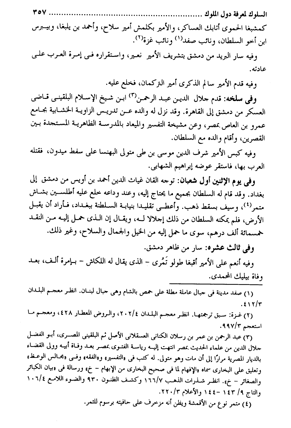 كمشبغا الْحَمَوِيّ أتابك العساكر والأمير بكلمش أَمِير سلَاح وَأحمد بن يلبغا وبيبرس ابْن أَخُو السُّلْطَان ونائب صفد ونائب غَزَّة. وَفِيه سَار الْبَرِيد من دمشق بتشريف الْأَمِير نعير واستقراره فِي إمرة الْعَرَب على عَادَته. وَفِيه قدم الْأَمِير سَالم الذكرى أَمِير التركمان فَخلع عَلَيْهِ. وَفِي سلخه: قدم جلال الدّين عبد الرَّحْمَن ابْن شيخ الْإِسْلَام البُلْقِينِيّ قَاضِي الْعَسْكَر من دمشق إِلَى الْقَاهِرَة. وَقد نزل لَهُ وَالِده عَن تدريس الزاوية الخشابية بِجَامِع عَمْرو بن الْعَاصِ بِمصْر وَعَن مشيخة التَّفْسِير والميعاد بِالْمَدْرَسَةِ الظَّاهِرِيَّة المستجدة بَين القصرين وَأقَام وَالِده مَعَ السُّلْطَان. وَفِيه كبس الْأَمِير شرف الدّين مُوسَى بن طي مُتَوَلِّي البهنسا على سفط ميدون فَقتله الْعَرَب بهَا فاستقر عوضه إِبْرَاهِيم الشهابي. وَفِي يَوْم الِاثْنَيْنِ أول شعْبَان: توجه القان غياث الدّين أَحْمد بن أويس من دمشق إِلَى بَغْدَاد. وَقد قَامَ لَهُ السُّلْطَان بِجَمِيعِ مَا يحْتَاج إِلَيْهِ وَعند وداعه خلع عَلَيْهِ أطلسين بشاش متمر وَسيف بسقط ذهب. وَأعْطى تقليداً بنيابة السلطنة بِبَغْدَاد فَأَرَادَ أَن يقبل الأَرْض فَلم يُمكنهُ السُّلْطَان من ذَلِك إجلالاً لَهُ وَيُقَال إِن الَّذِي حمل إِلَيْهِ من النَّقْد خَمْسمِائَة ألف دِرْهَم سوى مَا حمل إِلَيْهِ من الْخَيل وَالْجمال وَالسِّلَاح وَغير ذَلِك. وَفِي ثَالِث عشره: سَار من ظَاهر دمشق. وَفِيه أنعم على الْأَمِير أقبغا طولو تَمُري - الَّذِي يُقَال لَهُ اللكاش - بإمرة ألف بعد وَفَاة بيليك المحمدي.