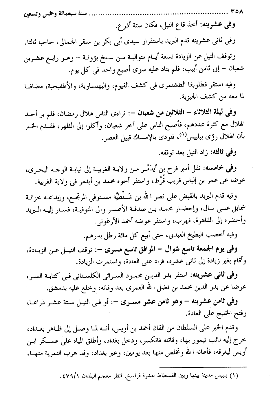 وَفِي عشرينه: أَخذ قاع النّيل فَكَانَ سِتَّة أَذْرع. وَتوقف النّيل عَن الزِّيَادَة تِسْعَة أَيَّام مُتَوَالِيَة من سلخ بؤونة - وَهُوَ رَابِع عشْرين شعْبَان - إِلَى ثامن أبيب فَلم يناد عَلَيْهِ سوى إِصْبَع وَاحِد فِي كل يَوْم. وَفِيه اسْتَقر قطلوبغا الطشتمري فِي كشف الفيوم والبهنساوية والأطفيحية مُضَافا لما مَعَه من كشف الجيزية. وَفِي لَيْلَة الثُّلَاثَاء - الثَّلَاثِينَ من شعْبَان -: ترَاءى النَّاس هِلَال رَمَضَان فَلم ير أحد الْهلَال مَعَ كَثْرَة عمرهم فَأصْبح النَّاس على أخر شعْبَان وأكلوا إِلَى الظّهْر فَقدم الْخَبَر بِأَن الْهلَال رؤى ببلبيس فَنُوديَ بالإمساك قبيل الْعَصْر. وَفِي ثالثه: زَاد النّيل بعد توقفه. وَفِي خامسه: نقل أَمِير فرج بن أيدمر من ولَايَة الغربية إِلَى نِيَابَة الْوَجْه البحري عوضا عَن عمر بن إلْيَاس قريب قُرُط وَاسْتقر أَخُوهُ مُحَمَّد بن أيدمر فِي ولَايَة الغربية. وَفِيه قدم الْبَرِيد بِالْقَبْضِ على نصر الله بن شَنْطيَّة مُسْتَوْفِي المرتجع وإيداعه خزانَة شمايل على مَال وإحضار مُحَمَّد بن صَدَقَة الأعسر وَالِي المنوفية فَسَار إِلَيْهِ الْبَرِيد وأحضره إِلَى القاهرةَ فهرب وَاسْتقر عوضه أَحْمد الأرغوني. وَفِيه أخصب الْبِطِّيخ العبدلي حَتَّى أبيع كل مائَة رَطْل بدرهم. وَفِي يَوْم الْجُمُعَة تَاسِع شَوَّال - الْمُوَافق تَاسِع مسري -: توقف النّيل عَن الزِّيَادَة وَأقَام بِغَيْر زِيَادَة إِلَى ثَانِي عشره فَزَاد على الْعَادة واستمرت الزِّيَادَة. وَفِي ثَانِي عشرينه: اسْتَقر بدر الدّين مَحْمُود السرائي الكلستاني فِي كِتَابَة السِّرّ عوضا عَن بدر الدّين مُحَمَّد بن فضل الله الْعمريّ بعد وَفَاته وخلع عَلَيْهِ بِدِمَشْق. وَفِي ثامن عشرينه - وَهُوَ ثامن عشر مسري -: أَو فِي النّيل سِتَّة عشر ذِرَاعا وَفتح الخليج على الْعَادة. وَقدم الْخَبَر على السُّلْطَان من القان أَحْمد بن أويس أَنه لما وصل إِلَى ظَاهر بَغْدَاد خرج إِلَيْهِ نَائِب تيمور بهَا وقاتله فانكسر وَدخل بَغْدَاد وَأطلق الْمِيَاه على عَسْكَر ابْن أويس ليغرقه فأعانه الله وتخلص مِنْهَا بعد يَوْمَيْنِ وَعبر بَغْدَاد وَقد هرب التمرية مِنْهَا