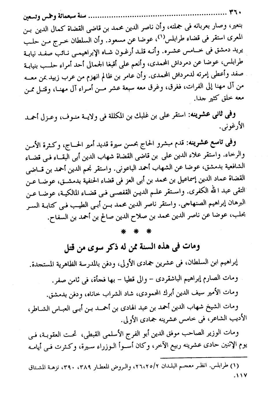 بنعير وَصَارَ بعربانه فِي جملَته وَأَن نَاصِر الدّين مُحَمَّد بن قَاضِي الْقُضَاة كَمَال الدّين بن المعري اسْتَقر فِي قَضَاء طرابلس عوضا عَن مَسْعُود. وَأَن السُّلْطَان خرج من حلب يُرِيد دمشق فِي خَامِس عشره. وَأَنه قلد أرغون شاه الإبراهيمي نَائِب صفد نِيَابَة طرابلس عوضا عَن دمرداش المحمدي وأنعم على أقبغا الجمالي أحد أُمَرَاء حلب بنيابة صفد وَأَعْلَى إمرته لدمرداش المحمدي. وَأَن عَامر بن ظَالِم انهزم من عرب زبيد بِمن مَعَه من آل مهنا إِلَى الْفُرَات فغرق وغرق مَعَه سَبْعَة عشر من أُمَرَاء آل مهنا وَقتل مِمَّن مَعَه خلق كثير جدا. وَفِي ثَانِي عشرينه: اسْتَقر عَليّ بن غلبك بن المكللة فِي ولَايَة منوف وعزل أَحْمد الأرغوني. وَفِي تَاسِع عشرينه: قدم مبشرو الْحَاج بِحسن سيرة قديد أَمِير الْحَاج وَكَثْرَة الْأَمْن والرخاء. وَاسْتقر عَلَاء الدّين عَليّ بن قَاضِي الْقُضَاة شهَاب الدّين أبي الْبَقَاء فِي قَضَاء الشَّافِعِيَّة بِدِمَشْق عوضا عَن الشهَاب أَحْمد الباعوني. وَاسْتقر نجم الدّين أَحْمد بن قَاضِي الْقُضَاة عماد الدّين إِسْمَاعِيل بن مُحَمَّد بن أبي الْعِزّ فِي قَضَاء الْحَنَفِيَّة بِدِمَشْق عوضا عَن التقي عبد الله الكفري. وَاسْتقر علم الدّين القفصي فِي قَضَاء الْمَالِكِيَّة عوضا عَن الْبُرْهَان إِبْرَاهِيم الصنهاجي. وَاسْتقر نَاصِر الدّين مُحَمَّد بن أبي الطّيب فِي كِتَابَة السِّرّ بحلب عوضا عَن نَاصِر الدّين مُحَمَّد بن صَلَاح الدّين صَالح بن أَحْمد بن السفاح. وَمَات فِي هَذِه السّنة مِمَّن لَهُ ذكر سوى من قتل إِبْرَاهِيم ابْن السُّلْطَان فِي عشْرين جُمَادَى الأولى وَدفن بِالْمَدْرَسَةِ الظَّاهِرِيَّة المستجدة. وَمَات الصارم إِبْرَاهِيم الباشقردي - وَالِي قطيا - بهَا فَجْأَة فِي ثامن صفر. وَمَات الْأَمِير سيف الدّين أبرك المحمودي شاد الشَّرَاب خاناه وَدفن بِدِمَشْق. وَمَات الشَّيْخ شهَاب الدّين أَحْمد بن عبد الْهَادِي بن أَحْمد بن أبي الْعَبَّاس الشاطر الأديب الشَّاعِر فِي خَامِس عشرينه جُمَادَى الأولى. وَمَات الْوَزير الصاحب موفق الدّين أَبُو الْفرج الْأَسْلَمِيّ القبطي تَحت الْعقُوبَة فِي يَوْم الِاثْنَيْنِ حادي عشرينه ربيع الآخر وَكَانَ أَسْوَأ الوزراء سيرة وَكَثُرت فِي أَيَّامه