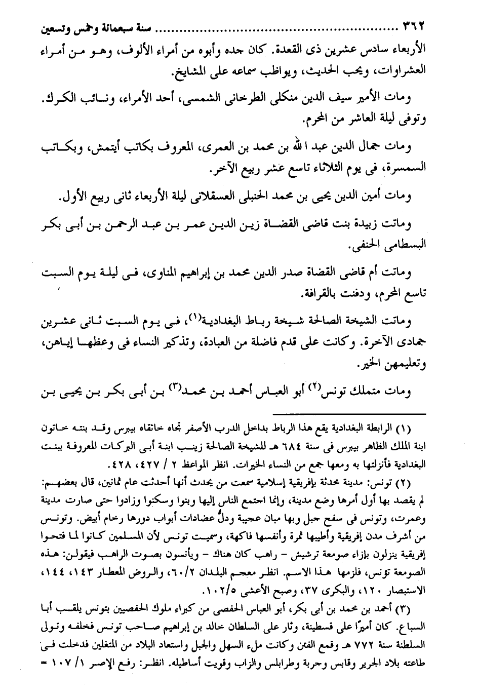 الْأَرْبَعَاء سادس عشْرين ذِي الْقعدَة. كَانَ جده وَأَبوهُ من أُمَرَاء الألوف وَهُوَ من أُمَرَاء العشراوات وَيُحب الحَدِيث ويواظب سَمَاعه على الْمَشَايِخ. وَمَات الْأَمِير سيف الدّين منكلي الطرخاني الشمسي أحد الْأُمَرَاء ونائب الكرك. وَتُوفِّي لَيْلَة الْعَاشِر من الْمحرم. وَمَات جمال الدّين عبد الله بن مُحَمَّد بن الْعمريّ الْمَعْرُوف بكاتب أيتمش وبكاتب السمسرة وَمَات أَمِين الدّين يحيى بن مُحَمَّد الْحَنْبَلِيّ الْعَسْقَلَانِي لَيْلَة الْأَرْبَعَاء ثَانِي ربيع الأول. وَمَاتَتْ زبيدة بنت قَاضِي الْقُضَاة زين الدّين عمر بن عبد الرَّحْمَن بن أَبى بكر البسطامي الْحَنَفِيّ. وَمَاتَتْ أم قَاضِي الْقُضَاة صدر الدّين مُحَمَّد بن إِبْرَاهِيم الْمَنَاوِيّ فِي لَيْلَة يَوْم السبت تَاسِع الْمحرم ودفنت بالقرافة. وَمَاتَتْ الشيخة الصَّالِحَة شيخة رِبَاط البغدادية فِي يَوْم السبت ثَانِي عشْرين جُمَادَى الْآخِرَة. وَكَانَت على قدم فاضلة من الْعِبَادَة وتذكير النِّسَاء فِي وعظها إياهن وتَعليمهن الْخَيْر. وَمَات متملك تونس أَبُو الْعَبَّاس أَحْمد بن مُحَمَّد بن أَبى بكر بن يحيى بن