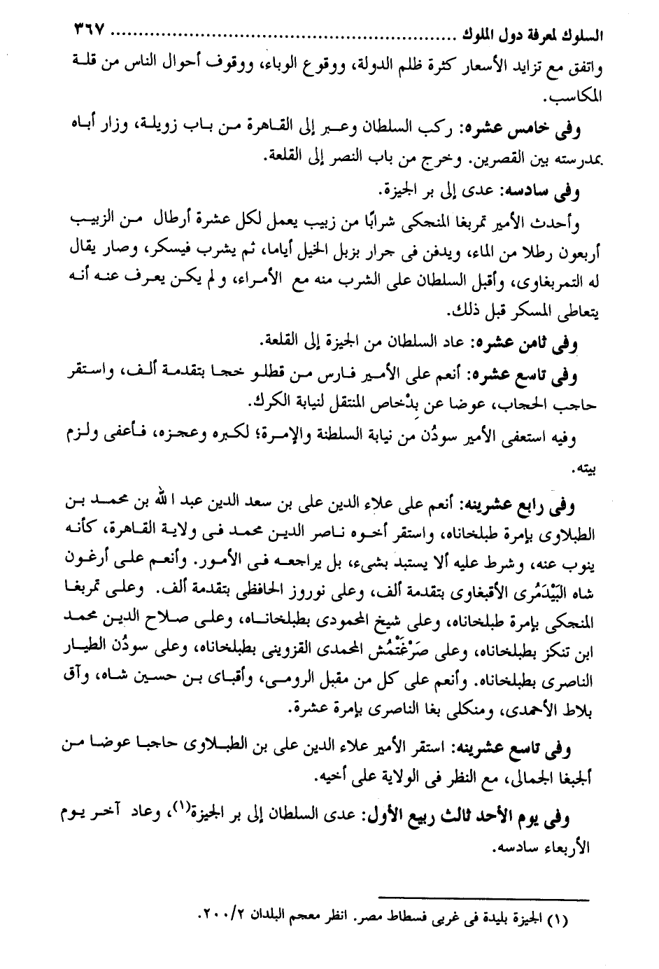 وَاتفقَ مَعَ تزايد الأسعار كَثْرَة ظلم الدولة وَوُقُوع الوباء ووقوف أَحْوَال النَّاس من قلَّة المكاسب. وَفِي خَامِس عشره: ركب السُّلْطَان وَعبر إِلَى الْقَاهِرَة من بَاب زويلة وزار أَبَاهُ بمدرسته بَين القصرين. وَخرج من بَاب النَّصْر إِلَى القلعة. وَفِي سادسه: عدى إِلَى بر الجيزة. وأحدث الْأَمِير تمربغا المنجكي شرابًا من زبيب يعْمل لكل عشرَة أَرْطَال من الزَّبِيب أَرْبَعُونَ رطلا من المَاء ويدفن فِي جرار بزبل الْخَيل أَيَّامًا ثمَّ يشرب فيسكر وَصَارَ يُقَال لَهُ التمربغاوي وَفِي ثامن عشره: عَاد السُّلْطَان من الجيزة إِلَى القلعة. وَفِي تَاسِع عشره: أنعم على الْأَمِير فَارس من قطلو خجا بتقدمة ألف وَاسْتقر حَاجِب الْحجاب عوضا عَن بِدخاص المتنقل لنيابة الكرك. وَفِيه استعفى الْأَمِير سودُن من نِيَابَة السلطة والإمرة لكبره وعجزه فأعفي وَلزِمَ بَيته. وَفِي رَابِع عشرينه: أنعم على عَلَاء الدّين عَليّ بن سعد الدّين عبد الله بن مُحَمَّد بن الطلاوي بإمرة طبلخاناه وَاسْتقر أَخُوهُ نَاصِر الدّين مُحَمَّد فِي ولَايَة الْقَاهِرَة كَأَنَّهُ يَنُوب عَنهُ وَشرط عَلَيْهِ أَلا يستبد بِشَيْء بل يُرَاجِعهُ فِي الْأُمُور. وأنعم على أرغون شاه البَيْدمري الأقبغاوي بتقدمة ألف وعَلى نوروز الحافظي بتقدمة ألف. وعَلى تمربغا المنجكي بإمرة طبلخاناه وعَلى شيخ المحمودي بطبلخاناه وعَلى صَلَاح الدّين مُحَمَّد ابْن تنكز بطبلخاناه وعَلى صَرْغَتْمُش المحمدي الْقزْوِينِي بطبلخاناه وعَلى سودُن الطيار الناصري بطبلخاناه. وأنعم على كل من مقيل الرُّومِي وأقباي بن حُسَيْن شاه وآق بلاط الأحمدي ومنكلي بغا الناصري بإمرة عشرَة. وَفِي تَاسِع عشرينه: اسْتَقر الْأَمِير عَلَاء الدّين عَليّ بن الطبلاوي حاجباً عوضا من ألجبغا الجمالي مَعَ النّظر فِي الْولَايَة على أَخِيه. وَفِي يَوْم الْأَحَد ثَالِث ربيع الأول: عدى السُّلْطَان إِلَى بر الجيزة وَعَاد آخر يَوْم الْأَرْبَعَاء سادسه.