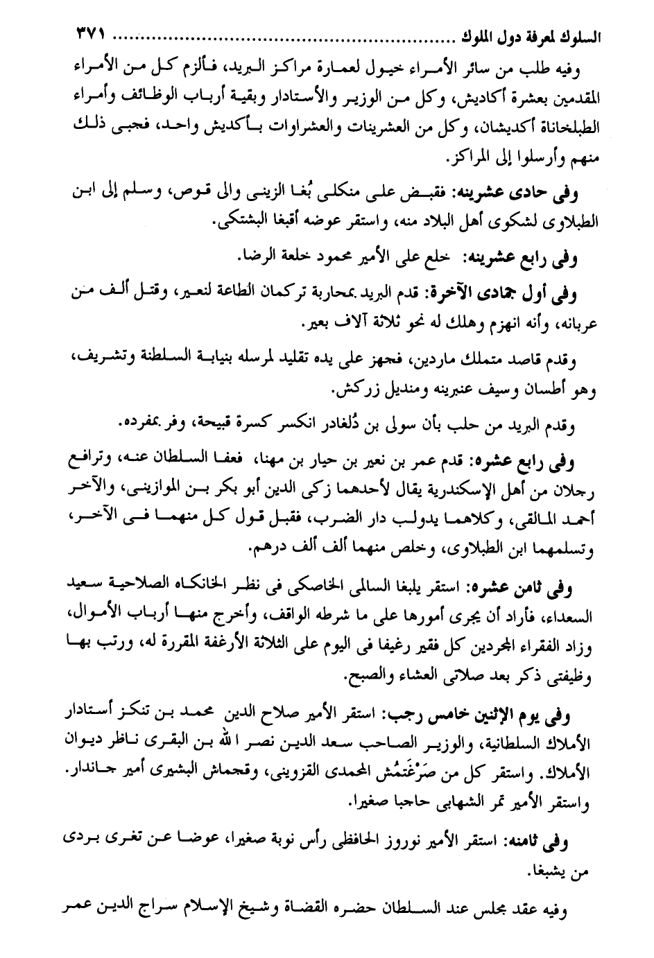وَفِيه طلب من سَائِر الْأُمَرَاء خُيُول لعمارة مراكز الْبَرِيد فألزم كل من الْأُمَرَاء المقدمين بِعشْرَة أكاديش وكل من الْوَزير والأستادار وَبَقِيَّة أَرْبَاب الْوَظَائِف وأمراء الطبلخاناة أكديشان وكل من وَفِي حادي عشرينه: فَقبض على منكلي بغا الزيني وَالِي قوص وَسلم إِلَى ابْن الطبلاوي لشكوى أهل الْبِلَاد مِنْهُ وَاسْتقر عوضه أقبغا البشتكي. وَفِي رَابِع عشرينه: خلع على الْأَمِير مَحْمُود خلعة الرِّضَا. وَفِي أول جُمَادَى الْآخِرَة: قدم الْبَرِيد بمحاربة تركمان الطَّاعَة لنعير وَقتل ألف من عربانه وَأَنه انهزم وَهلك لَهُ نَحْو ثَلَاثَة آلَاف بعير. وَقدم قَاصد متملك ماردين فَجهز على يَده تَقْلِيد لمرسله بنيابة السلطنة وتشريف وَهُوَ أطسان وَسيف عنبرية ومنديل زركش. وَقدم الْبَرِيد من حلب بِأَن سولي بن دُلغار انْكَسَرَ كسرة قبيحة وفر بمفرده. وَفِي رَابِع عشره: قدم عمر بن نعير بن حيار بن مهنا فَعَفَا السُّلْطَان عَنهُ وترافع رجلَانِ من أهل الْإسْكَنْدَريَّة يُقَال لأَحَدهمَا زكي الدّين أَبُو بكر بن الموازيني وَالْآخر أَحمد المالقي وَكِلَاهُمَا يدولب دَار الضَّرْب فَقبل قَول كل مِنْهُمَا فِي الآخر وتسلمهما ابْن الطبلاوي وخلص مِنْهُمَا ألف ألف دِرْهَم. وَفِي ثامن عشره: اسْتَقر يلبغا السالمي الخاصكي فِي نظر الخانكاه الصلاحية سعيد السُّعَدَاء فَأَرَادَ أَن يجرى أمورها على مَا شَرطه الْوَاقِف وَأخرج مِنْهَا أَرْبَاب الْأَمْوَال وَزَاد الْفُقَرَاء المجردين كل فَقير رغيفاً فِي الْيَوْم على الثَّلَاثَة الأرغفة المقررة لَهُ ورتب بهَا وظيفتي ذكر بعد صَلَاتي الْعشَاء وَالصُّبْح. وَفِي يَوْم الِاثْنَيْنِ خَامِس رَجَب: اسْتَقر الْأَمِير صَلَاح الدّين مُحَمَّد بن تنكز أستادار الْأَمْلَاك السُّلْطَانِيَّة والوزير الصاحب سعد الدّين نصر الله بن البقري نَاظر ديوَان الْأَمْلَاك. وَاسْتقر كل من صرغتمش المحمدي الْقزْوِينِي وقجماش البشيري أَمِير جاندار. وَاسْتقر الْأَمِير تمر الشهابي حاجباً صَغِيرا. وَفِي ثامنه: اسْتَقر الْأَمِير نوروز الحافظي رَأس نوبَة صَغِيرا عوضا عَن تغرى بردى من يشبغا. وَفِيه عقد مجْلِس عِنْد السُّلْطَان حَضَره الْقُضَاة وَشَيخ الْإِسْلَام سراج الدّين عمر