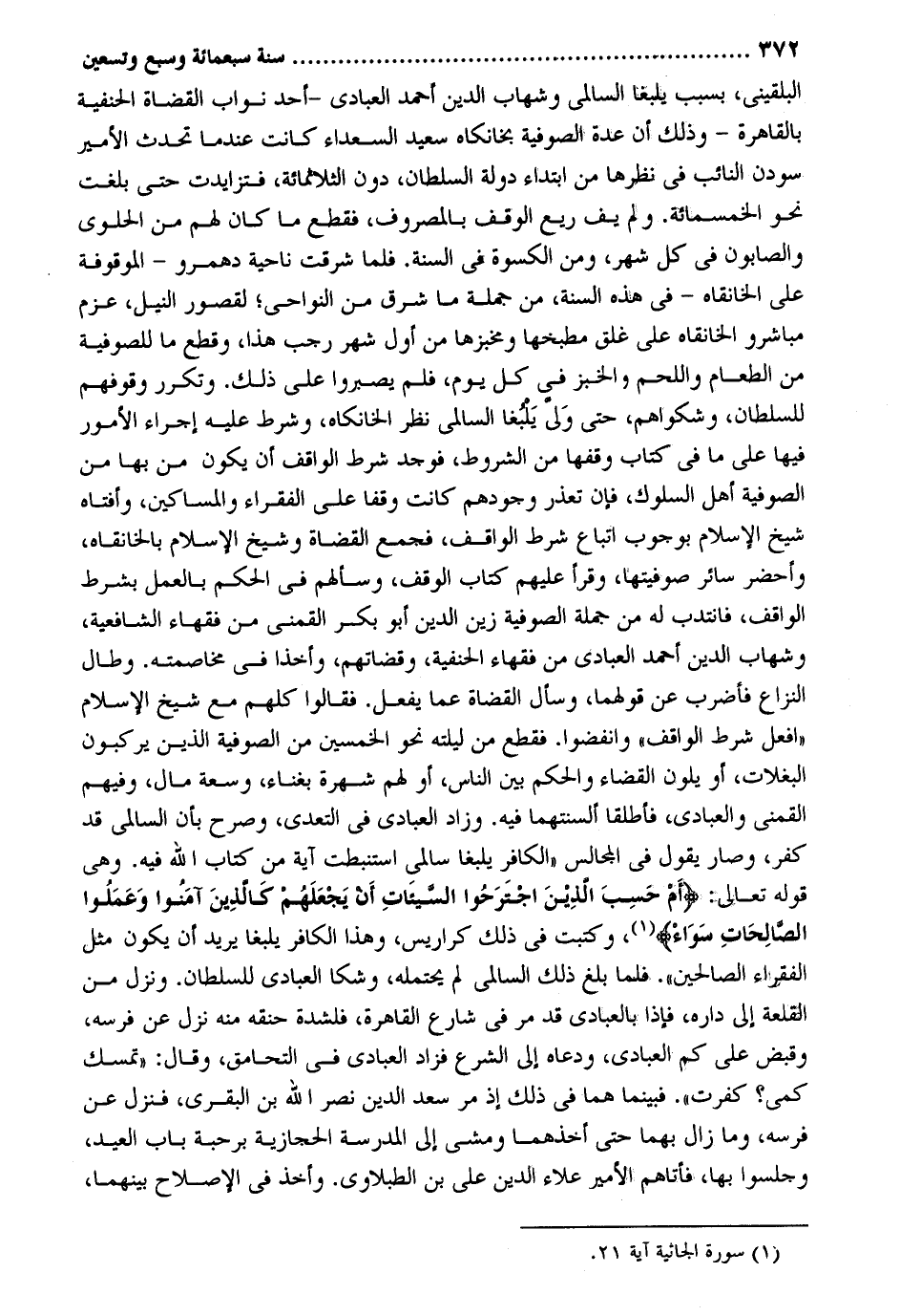 البُلْقِينِيّ بِسَبَب يلبغا السالمي وشهاب الدّين أَحْمد الْعَبَّادِيّ - أحد نواب الْقُضَاة الْحَنَفِيَّة بِالْقَاهِرَةِ - وَذَلِكَ أَن عدَّة الصُّوفِيَّة بخانكاه سعيد السُّعَدَاء كَانَت عِنْدَمَا تحدث الْأَمِير سودن النَّائِب فِي نظرها من ابْتِدَاء دولة السُّلْطَان دون الثلاثمائة فتزايدت حَتَّى بلغت نَحْو الْخَمْسمِائَةِ. وَلم يَفِ ريع الْوَقْف بالمصروف فَقطع مَا كَانَ لَهُم من الْحَلْوَى والصابون فِي كل شهر وَمن الْكسْوَة فِي السّنة. فَلَمَّا شَرقَتْ نَاحيَة دهمرو - الْمَوْقُوفَة على الخانقاه - فِي هَذِه السّنة من جملَة مَا شَرق من النواحي لقُصُور النّيل عزم مباشرو الخانقاه على غلق مطبخها ومخبزها من أول شهر رَجَب هَذَا وَقطع مَا للصوفية من الطَّعَام وَاللَّحم وَالْخبْز فِي كل يَوْم فَلم يصبروا على ذَلِك. وتكرر وقوفهم للسُّلْطَان وشكواهم حَتَّى ولي يلبغا السالمي نظر الخانكاه وَشرط عَلَيْهِ إِجْرَاء الْأُمُور فِيهَا على مَا فِي كتاب وَقفهَا من الشُّرُوط فَوجدَ شَرط الْوَاقِف أَن يكون من بهَا من الصُّوفِيَّة أهل السلوك فَإِن تعذر وجودهم كَانَت وَقفا على الْفُقَرَاء وَالْمَسَاكِين وَأَفْتَاهُ شيخ الْإِسْلَام بِوُجُوب اتِّبَاع شَرط الْوَاقِف فَجمع الْقُضَاة وَشَيخ الْإِسْلَام بالخانقاه وأحضر سَائِر صوفيتها وَقَرَأَ عَلَيْهِم كتاب الْوَقْف سَأَلَهُمْ فِي الحكم بِالْعَمَلِ بِشَرْط الْوَاقِف فَانْتدبَ لَهُ من جملَة الصُّوفِيَّة زين الدّين أَبُو بكر القمني من فُقَهَاء الشَّافِعِيَّة وشهاب الدّين أَحْمد الْعَبَّادِيّ من فُقَهَاء الْحَنَفِيَّة وقضاتهم وأخذا فِي مخاصمته. وَطَالَ النزاع فَأَضْرب عَن قَوْلهمَا وَسَأَلَ الْقُضَاة عَمَّا يفعل. فَقَالُوا كلهم مَعَ شيخ الْإِسْلَام افْعَل شَرط الْوَاقِف وانفضوا. فَقطع من ليلته نَحْو الْخمسين من الصُّوفِيَّة الَّذين يركبون البغلات أَو يلون الْقَضَاء وَالْحكم بَين النَّاس أَو لَهُم شهرة بغناء وسعة مَال وَفِيهِمْ القمني والعبادي فأطلقا ألسنتهما فِيهِ. وَزَاد الْعَبَّادِيّ فِي التَّعَدِّي وَصرح بِأَن السالمي قد كفر وَصَارَ يَقُول فِي الْمجَالِس الْكَافِر يلبغا سالمي استنبطت آيَة من كتاب الله فِيهِ. وَهِي قَوْله تَعَالَى: أم حَسِبَ الَّذين اجتَرَحُوا السيئاتِ أَن يَجعَلَهم كالِذينَ آمَنُوا وَعَمَلُوا الصَّالِحَات سَوَاء وكتبت فِي ذَلِك كراريس وَهَذَا الْكَافِر يلبغا يُرِيد أَن يكون مثل الْفُقَرَاء الصَّالِحين. فَلَمَّا بلغ ذَلِك السالمي لم يحْتَملهُ وشكا الْعَبَّادِيّ للسُّلْطَان. وَنزل من القلعة إِلَى دَاره فَإِذا بالعبادي قد مر فِي شَارِع الْقَاهِرَة فلشدة حنقه مِنْهُ نزل عَن فرسه وَقبض على كم الْعَبَّادِيّ وَدعَاهُ إِلَى الشَّرْع فَزَاد الْعَبَّادِيّ فِي التحامق وَقَالَ: تمسك كمي كفرت فَبَيْنَمَا هما فِي ذَلِك إِذْ مر سعد الدّين نصر الله بن البقري فَنزل عَن فرسه وَمَا زَالَ بهما حَتَّى أخذهما وَمَشى إِلَى الْمدرسَة الحجازية برحبة بَاب الْعِيد وجلسوا بهَا فَأَتَاهُم الْأَمِير عَلَاء الدّين عَليّ بن الطبلاوي. وَأخذ فِي الْإِصْلَاح بَينهمَا
