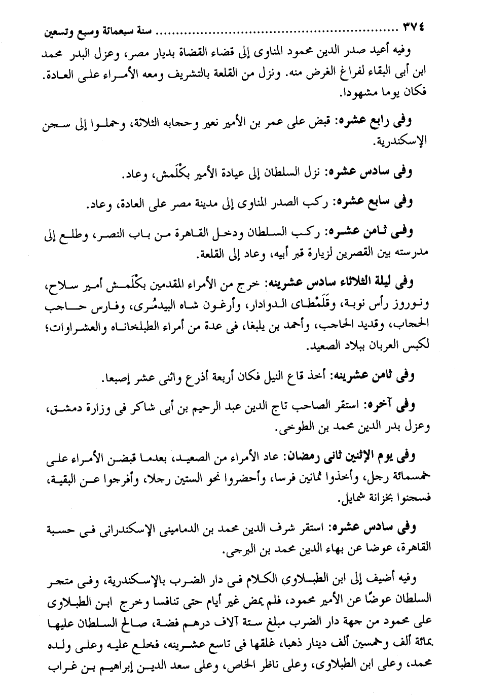 وَفِيه أُعِيد صدر الدّين مَحْمُود الْمَنَاوِيّ فِي قَضَاء الْقُضَاة بديار مصر وعزل الْبَدْر مُحَمَّد بن أبي الْبَقَاء لفراغ الْغَرَض مِنْهُ. وَنزل من القلعة بالتشريف وَمَعَهُ الْأُمَرَاء على الْعَادة. فَكَانَ يَوْمًا مشهوداً. وَفِي رَابِع عشره: قبض على عمر بن الْأَمِير نعير وحجابه الثَّلَاثَة وحملوا إِلَى سجن الْإسْكَنْدَريَّة. وَفِي سادس عشره: نزل السُّلْطَان فِي عِيَادَة الْأَمِير بكلمش وَعَاد. وَفِي سَابِع عشره: ركب الصَّدْر الْمَنَاوِيّ إِلَى مَدِينَة مصر على الْعَادة وَعَاد وَفِي ثامن عشره ركب السُّلْطَان وَدخل الْقَاهِرَة من بَاب النَّصْر وطلع إِلَى مدرسته بَين القصرين لزيارة قبر أَبِيه وَعَاد إِلَى القلعة. وَفِي لَيْلَة الثُّلَاثَاء سادس عشرينه: خرج من الْأُمَرَاء المقدمين بكلمش أَمِير سلَاح ونوروز رَأس نوبَة وقلمطاي الدوادار وأرغون شاه البيدمري وَفَارِس حَاجِب الْحجاب وقديد الْحَاجِب وَأحمد بن يلبغا فِي عدَّة من أُمَرَاء الطبلخاناه والعشراوات لكبس العربان بِبِلَاد الصَّعِيد. وَفِي ثامن عشرينه: أَخذ قاع النّيل فَكَانَ أَرْبَعَة أَذْرع واثني عشر إصبعاً. وَفِي آخِره: اسْتَقر الصاحب تَاج الدّين عبد الرَّحِيم بن أبي شَاكر فِي وزارة دمشق وعزل بدر الدّين مُحَمَّد بن الطوخي. وَفِي يَوْم الِاثْنَيْنِ ثَانِي رَمَضَان: عَاد الْأُمَرَاء من الصَّعِيد بَعْدَمَا قبضن الْأُمَرَاء على خَمْسمِائَة رجل وأخفوا ثَمَانِينَ فرسا وأحضروا نَحْو السِّتين رجلا وأفرجوا عَن الْبَقِيَّة فسجنوا بخزانة شمايل. وَفِي سادس عشره: اسْتَقر شرف الدّين مُحَمَّد بن الدماميني الإسْكَنْدراني فِي حسبَة الْقَاهِرَة عوضا عَن بهاء الدّين مُحَمَّد بن الْبُرْجِي. وَفِيه أضيف إِلَى ابْن الطبلاوي الْكَلَام فِي دَار الضَّرْب بالإسكندرية وَفِي متجر السُّلْطَان عوضا عَن الْأَمِير مَحْمُود فَلم يمض غير أَيَّام حَتَّى تنافسا وَخرج ابْن الطبلاوي على مَحْمُود من جِهَة دَار الضَّرْب مبلغ سِتَّة آلَاف دِرْهَم فضَّة صَالح السُّلْطَان عَلَيْهَا بِمِائَة ألف وَخمسين ألف دِينَار ذَهَبا غلقها فِي تَاسِع عشرينه فَخلع عَلَيْهِ وعَلى وَلَده مُحَمَّد وعَلى ابْن الطبلاوي وعَلى نَاظر الْخَاص وعَلى سعد الدّين إِبْرَاهِيم بن غراب