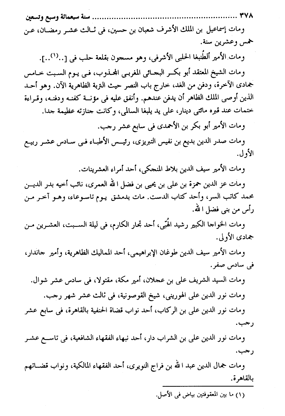 وَمَات إِسْمَاعِيل بن الْملك الْأَشْرَف شعْبَان بن حُسَيْن فِي ثَالِث عشر رَمَضَان عَن خمس وَمَات الْأَمِير ألطُنبغا الْحلَبِي الأشرفي وَهُوَ مسجون بقلعة حلب. وَمَات الشَّيْخ المعتقد أَبُو بكر البجائي المغربي المجذوب فِي يَوْم السبت خَامِس جُمَادَى الْآخِرَة وَدفن من الْغَد خَارج بَاب النَّصْر حَيْثُ التربة الظَّاهِرِيَّة الْآن. وَهُوَ أحد الَّذين أوصى الْملك الظَّاهِر أَن يدْفن عِنْدهم. وَأنْفق عَلَيْهِ فِي مُؤنَة كَفنه وَدَفنه وَقِرَاءَة ختمات عِنْد قَبره مِائَتي دِينَار على يَد يلبغا السالمي وَكَانَت جنَازَته عَظِيمَة جدا. وَمَات الْأَمِير أَبُو بكر بن الأسعدي فِي سَابِع عشر رَجَب. وَمَات صدر الدّين بديع بن نَفِيس التبريزي رَئِيس الْأَطِبَّاء فِي سادس عشر ربيع الأول. وَمَات الْأَمِير سيف الدّين بلاط المنجكي أحد أُمَرَاء العشرينات. وَمَات عز الدّين حَمْزَة بن عَليّ بن يحيى بن فضل الله الْعمريّ نَائِب أَخِيه بدر الدّين مُحَمَّد كَاتب السِّرّ وَأحد كتاب الدست. مَاتَ بِدِمَشْق يَوْم تاسوعاء وَهُوَ آخر من رَأس من بني فضل الله. وَمَات الخواجا الْكَبِير رشيد الهُبّي أحد تجار الكارم فِي لَيْلَة السبت الْعشْرين من جُمَادَى الأولى. وَمَات الْأَمِير سيف الدّين طوغان الإبراهيمي أحد المماليك الظَّاهِرِيَّة وأمير جاندار فِي وَمَات السَّيِّد الشريف عَليّ بن عجلَان أَمِير مَكَّة مقتولاً فِي سادس عشر شَوَّال. وَمَات نور الدّين عَليّ الهوريني شيخ القوصونية فِي ثَالِث عشر شهر رَجَب. وَمَات نور الدّين عَليّ بن الركاب أحد نواب قُضَاة الْحَنَفِيَّة بِالْقَاهِرَةِ فِي سَابِع عشر رَجَب. وَمَات نور الدّين عَليّ بن الشَّرَاب دَار أحد نبهاء الْفُقَهَاء الشَّافِعِيَّة فِي تَاسِع عشر رَجَب. وَمَات جمال الدّين عبد الله بن فراج النويري أحد الْفُقَهَاء الْمَالِكِيَّة ونواب قضاتهم بِالْقَاهِرَةِ.