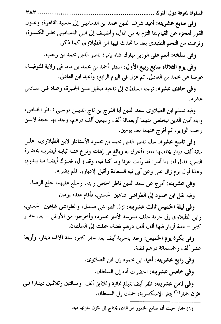 وَفِي سَابِع عشرينه: أُعِيد شرف الدّين مُحَمَّد بن الدماميني إِلَى حسبَة الْقَاهِرَة وعزل القور لعَجزه عَن الْقيام. مِمَّا الْتزم بِهِ من المَال وأضيف إِلَى ابْن الدماميني نظر الْكسْوَة ونزعت من النَّجْم الطنبدي بعد مَا تحدث فِيهَا ابْن الطبلاوي كَمَا ذكر. وَفِي سلخه: أنعم على الْوَزير مبارك شاه بإمرة نَاصِر الدّين مُحَمَّد بن رَجَب. وَفِي يَوْم الثُّلَاثَاء سَابِع ربيع الأول: اسْتَقر أَحْمد بن مُحَمَّد بن ماما فِي ولَايَة المنوفية عوضا عَن مُحَمَّد بن العادلي. ثمَّ عزل فِي الْيَوْم الرَّابِع وأعيد ابْن العادلي. وَفِي حادي عشره: توجه السُّلْطَان إِلَى نَاحيَة صقيل من الجيزة وَعَاد فِي سادس عشره. وَفِيه تسلم ابْن الطبلاوي سعد الدّين أَبَا الْفرج بن تَاج الدّين مُوسَى نَاظر الْخَاص وَابْنه أَمِين الدّين ليخلص مِنْهُمَا أَرْبَعمِائَة ألف وَسبعين ألف دِرْهَم وجد بهَا حجَّة لِابْنِ رَجَب الْوَزير ثمَّ أفرج عَنْهُمَا بعد يَوْمَيْنِ. وَفِي تَاسِع عشره: سلم نَاصِر الدّين مُحَمَّد بن مَحْمُود الأستادار لِابْنِ الطبلاوي على مائَة ألف دِينَار يخلصها مِنْهُ فأخرق بِهِ وَبَالغ فِي إهانته وَنزع عَنهُ ثِيَابه ليضربه بِحَضْرَة النَّاس فَقَالَ لَهُ: يَا أَمِير: قد رَأَيْت عزناً وَمَا كُنَّا فِيهِ وَقد زَالَ فعزك أَيْضا مَا يَدُوم وَهَذَا أول يَوْم زَالَ عني: عَن أبي فِيهِ السَّعَادَة وَأَقْبل الإدبار. فَلم يضْربهُ. وَفِي عشرينه: أفرج عَن سعد الدّين نَاظر الْخَاص وَابْنه وخلع عَلَيْهِمَا خلع الرِّضَا. وَفِيه نقل ابْن مَحْمُود إِلَى الطواشي شاهين الحسني فَأَقَامَ عِنْده يَوْمَيْنِ. وَفِي لَيْلَة الْخَمِيس ثَالِث عشرينه: نزل الطواشي صندل والطواشي شاهين الحسني وَابْن الطبلاوي إِلَى خربة خلف مدرسة الْأَمِير مَحْمُود وأخرجوا من الأَرْض - بعد حفر كثير - عدَّة أزيار فِيهَا ألف ألف دِرْهَم فضَّة حملت إِلَى السُّلْطَان. وَفِي بكرَة يَوْم الْخَمِيس: وجد بالخربة أَيْضا بعد حفر كثير سِتَّة آلَاف دِينَار وَأَرْبَعَة عشر ألف وَخَمْسمِائة دِرْهَم فضَّة. وَفِي رَابِع عشرينه: أُعِيد ابْن مَحْمُود إِلَى ابْن الطبلاوي. وَفِي خَامِس عشرينه: أحضرت أمه إِلَى السُّلْطَان. وَفِي ثامن عشرينه: ظفر أَيْضا بمبلغ ثَمَانِيَة وَثَلَاثِينَ ألف وَمِائَتَيْنِ وَثَلَاثِينَ دِينَارا فِي مخزن حمَار بثغر الْإسْكَنْدَريَّة حملت إِلَى السُّلْطَان.