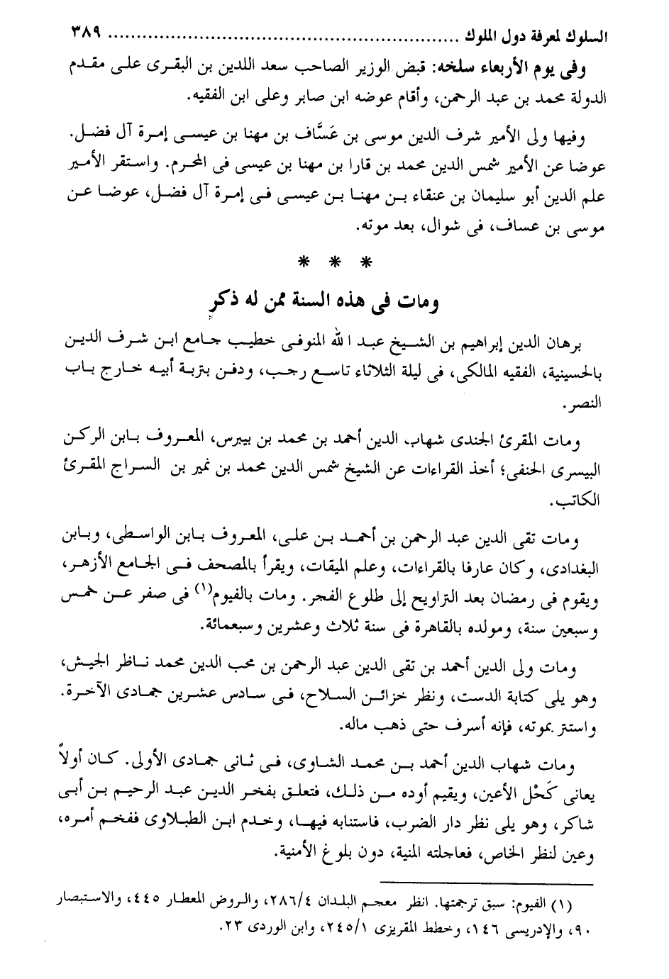 وَفِي يَوْم الْأَرْبَعَاء سلخه: قبض الْوَزير الصاحب سعد الدّين بن البقري على مقدم الدولة مُحَمَّد وفيهَا ولي الْأَمِير شرف الدّين مُوسَى بن عَسَّاف بن مهنا بن عِيسَى إمرة فضل. عوضا عَن الْأَمِير شمس الدّين مُحَمَّد بن قارا بن مهنا بن عِيسَى فِي الْمحرم. وَاسْتقر الْأَمِير علم الدّين أَبُو سُلَيْمَان بن عنقاء بن مهنا بن عِيسَى فِي إمرة آل فضل عوضا عَن مُوسَى بن عساف فِي شَوَّال بعد مَوته. وَمَات فِي هَذِه السّنة مِمَّن لَهُ ذكر برهَان الدّين إِبْرَاهِيم بن الشَّيْخ عبد الله المنوفي خطيب جَامع ابْن شرف الدّين بالحسينية الْفَقِيه الْمَالِكِي فِي لَيْلَة الثُّلَاثَاء تَاسِع رَجَب وَدفن بتربة أَبِيه خَارج بَاب النَّصْر. وَمَات الْمُقْرِئ الجندي شهَاب الدّين أَحْمد بن مُحَمَّد بن بيبرس الْمَعْرُوف بِابْن الرُّكْن البيسري الْحَنَفِيّ أَخذ الْقرَاءَات عَن الشَّيْخ شمس الدّين مُحَمَّد بن نمير بن السراج الْمُقْرِئ الْكَاتِب. وَمَات تَقِيّ الدّين عبد الرَّحْمَن بن أَحْمد بن عَليّ الْمَعْرُوف بِابْن الوَاسِطِيّ وبابن البغدادى وَكَانَ عَارِفًا بالقراءات وَعلم الْمِيقَات وَيقْرَأ بالمصحف فِي الْجَامِع الْأَزْهَر وَيقوم فِي رَمَضَان بعد التَّرَاوِيح إِلَى طُلُوع الْفجْر. وَمَات بالفيوم فِي صفر عَن خمس وَسبعين سنة ومولده بِالْقَاهِرَةِ فِي سنة ثَلَاث وَعشْرين وَسَبْعمائة. وَمَات ولي الدّين أَحْمد بن تَقِيّ الدّين عبد الرَّحْمَن بن محب الدّين مُحَمَّد نَاظر الْجَيْش وَهُوَ يَلِي كِتَابَة الدست وَنظر خَزَائِن السِّلَاح فِي سادس عشْرين جُمَادَى الْآخِرَة. واستتر بِمَوْتِهِ فَإِنَّهُ أسرف حَتَّى ذهب مَاله. وَمَات شهَاب الدّين أَحْمد بن مُحَمَّد الشاوي فِي ثَانِي جُمَادَى الأولى. كَانَ أَولا يعاني كَحْل الْأَعْين وَيُقِيم أوده من ذَلِك فَتعلق بفخر الدّين عبد الرَّحِيم بن أبي شَاكر وَهُوَ يَلِي نظر دَار الضَّرْب فاستنابه فِيهَا وخدم ابْن الطبلاوي ففخم أمره وَعين لنظر الْخَاص فعاجلته الْمنية دون بُلُوغ الأمنية.