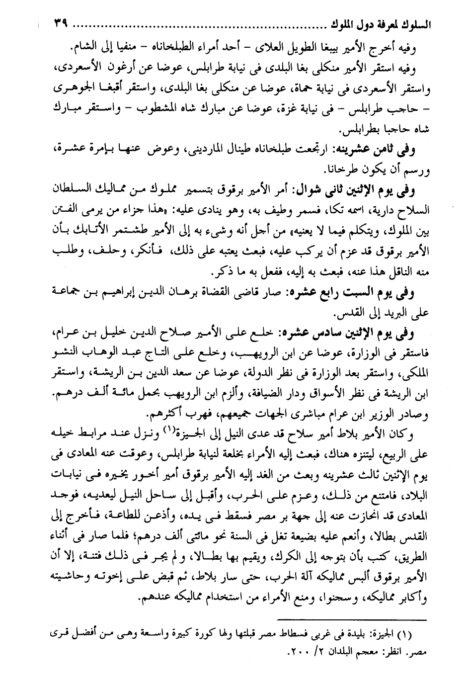 وَفِيه أخرج الْأَمِير بيبغا الطَّوِيل العلاي - أحد أُمَرَاء الطبلخاناه - منفيا إِلَى الشَّام. وَفِيه اسْتَقر الْأَمِير منكلي بغا الْبَلَدِي فِي نِيَابَة طرابلس عوضا عَن أرغون الأسعردي وَاسْتقر الأسعردي فِي نِيَابَة حماة عوضا عَن منكلي بغا الْبَلَدِي وَاسْتقر أقبغا الْجَوْهَرِي - حَاجِب طرابلس - فِي نِيَابَة غَزَّة عوضا عَن مبارك شاه المشطوب - وَاسْتقر مبارك شاه حاجبا بطرابلس. وَفِي ثامن عشرينه: ارتجعت طبلخاناه طينال المارديني وَعوض عَنْهَا بإمرة عشرَة ورسم أَن يكون طرخانا. وَفِي يَوْم الْإِثْنَيْنِ ثَانِي شَوَّال: أَمر الْأَمِير برقوق بتسمير مَمْلُوك من مماليك السُّلْطَان السِّلَاح دارية اسْمه تكا فسمر وطيف بِهِ وَهُوَ يُنَادي عَلَيْهِ. هَذَا جَزَاء من يَرْمِي الْفِتَن بَين الْمُلُوك وَيتَكَلَّم فِيمَا لَا يعنيه من أجل أَنه وشى بِهِ إِلَى الْأَمِير طشتمر الأتابك بِأَن الْأَمِير برقوق قد عزم أَن يركب عَلَيْهِ فَبعث يعتبه على ذَلِك فَأنْكر وَحلف وَطلب مِنْهُ النَّاقِل هَذَا عَنهُ فَبعث بِهِ إِلَيْهِ فَفعل بِهِ مَا ذكر. وَفِي يَوْم السبت رَابِع عشره: صَار قَاضِي الْقُضَاة برهَان الدّين إِبْرَاهِيم بن جمَاعَة على الْبَرِيد إِلَى الْقُدس. وَفِي يَوْم الْإِثْنَيْنِ سادس عشره: خلع على الْأَمِير صَلَاح الدّين خَلِيل بن عرام فاستقر فِي الوزارة عوضا عَن ابْن الرويهب وخلع على التَّاج عبد الْوَهَّاب النشو الملكي وَاسْتقر بعد الوزارة فِي نظر الدولة عوضا عَن سعد الدّين بن الريشة وَاسْتقر ابْن الريشة فِي نظر الْأَسْوَاق وَدَار الضِّيَافَة وألزم ابْن الرويهب بِحمْل مائَة ألف دِرْهَم. وصادر الْوَزير ابْن عرام مباشري الْجِهَات جَمِيعهم فهرب أَكْثَرهم. وَكَانَ الْأَمِير بلاط أَمِير سلَاح قد عدى النّيل إِلَى الجيزة وَنزل عِنْد مرابط خيله على الرّبيع ليتنزه هُنَاكَ فَبعث إِلَيْهِ الْأُمَرَاء بخلعة لنيابة طرابلس وعوقت عَنهُ المعادي فِي يَوْم الْإِثْنَيْنِ ثَالِث عشرينه وَبعث من الْغَد إِلَيْهِ الْأَمِير برقوق أَمِير أخور يخيره فِي نيابات الْبِلَاد فَامْتنعَ من ذَلِك وعزم على الْحَرْب وَأَقْبل إِلَى سَاحل النّيل ليعديه فَوجدَ المعادي قد انْحَازَتْ عَنهُ إِلَى جِهَة بر مصر فَسقط فِي يَده وأذعن للطاعة فَأخْرج إِلَى الْقُدس بطالا وأنعم عَلَيْهِ بضيعة تغل فِي السّنة نَحْو مِائَتي ألف دِرْهَم فَلَمَّا صَار فِي أثْنَاء الطَّرِيق كتب بِأَن يتَوَجَّه إِلَى الكرك وَيُقِيم بهَا بطالا وَلم يجر فِي ذَلِك فتْنَة إِلَّا أَن الْأَمِير برقوق ألبس مماليكه آلَة الْحَرْب حَتَّى سَار بلاط ثمَّ قبض على إخْوَته وحاشيته وأكابر مماليكه وسجنوا وَمنع الْأُمَرَاء من اسْتِخْدَام مماليكه عِنْدهم.