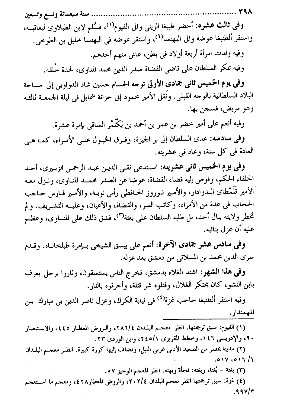 وَفِي ثَالِث عشره: أحضر طيبغا الزيني وَالِي الفيوم فَسلم لِابْنِ الطبلاوي ليعاقبه وَاسْتقر ألطنبغا عوضه وَالِي البهنسا وَاسْتقر عوضه فِي البهنسا خَلِيل بن الطوخي. وَفِيه ولدت امْرَأَة أَرْبَعَة أَوْلَاد فِي بطن عَاشَ مِنْهُم أحدهم. وَفِيه تنكر السُّلْطَان على قَاضِي الْقُضَاة صدر الدّين مُحَمَّد الْمَنَاوِيّ لحدهَ خُلقه. وَفِي يَوْم الْخَمِيس ثَانِي جُمَادَى الأولى توجه الحسام حُسَيْن شاد الدواويِن إِلَى مساحة الْبِلَاد السُّلْطَانِيَّة بِالْوَجْهِ القبلي. ونُقل الْأَمِير مَحْمُود إِلَى خزانَة شمايل فِي لَيْلَة الْجُمُعَة ثالثه وَهُوَ مَرِيض فسجن بهَا. وَفِيه أنعم على أَمِير خضر بن عمر بن أَحْمد بن بَكتنُر الساقي بإمرة عشرَة. وَفِي سادسه: عدى السُّلْطَان إِلَى بر الجيزة وَفرق الْخُيُول على الْأُمَرَاء كَمَا هِيَ الْعَادة فِي كل سنة وَعَاد فِي عشرينه. وَفِي يَوْم الْخَمِيس ثَانِي عشرينه: استدعى تَقِيّ الدّين عبد الرَّحْمَن الزبيرِي أحد الْخُلَفَاء الحكم وَفرض إِلَيْهِ قَضَاء الْقُضَاة عوضا عَن الصَّدْر مُحَمَّد الْمَنَاوِيّ وَنزل مَعَه الْأَمِير قَلَمْطاي الدوادار والأمير نوروز الحافظي رَأس نوبَة والأمير فَارس حَاجِب الْحجاب فِي عدَّة من الْأُمَرَاء وَكَاتب السِّرّ والقضاة والأعيان وَعَلِيهِ التشريف. وَلم تخطر ولَايَته ببال أحد بل طلبه السُّلْطَان على وَفِي سادس عشر جُمَادَى الْآخِرَة: أنعم على بيسق الشيخي بإمرة طبلخاناه. وَقدم سري الدّين مُحَمَّد بن المسلاتي من دمشق بعد عَزله. وَفِي هَذَا الشَّهْر: اشْتَدَّ الغلاء بِدِمَشْق فَخرج النَّاس يستسقون وثاروا بِرَجُل يعرف بِابْن النشو كَانَ يحتكر الغلال وقتلوه شَرّ قتلة وأحرقوه بالنَّار. وَفِيه اسْتَقر ألطنبغا حَاجِب غَزَّة فِي نِيَابَة الكرك وعزل نَاصِر الدّين بن مبارك بن المهمندار.