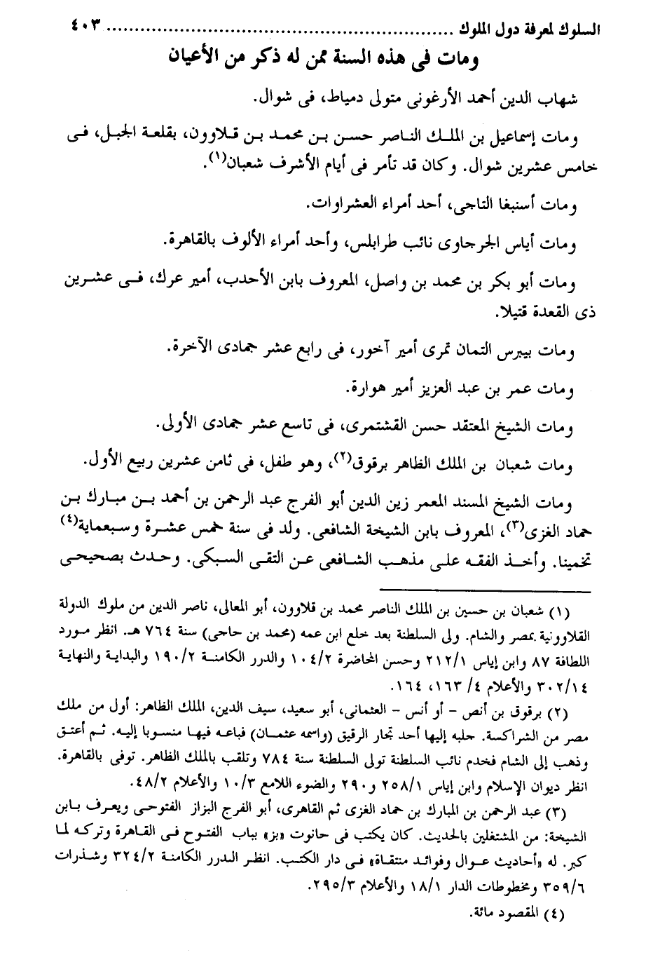 وَمَات فِي هَذِه السّنة مِمَّن لَهُ ذكر من الْأَعْيَان شهَاب الدّين أَحْمد الأرغوني مُتَوَلِّي دمياط فِي شَوَّال. وَمَات إِسْمَاعِيل بن الْملك النَّاصِر حسن بن مُحَمَّد بن قلاوون بقلعة الْجَبَل فِي خَامِس عشْرين شَوَّال. وَكَانَ قد تَأمر فِي أَيَّام الْأَشْرَف شعْبَان. وَمَات أسنبغا التاجي أحد أُمَرَاء العشراوات. وَمَات إِيَاس الجرجاوي نَائِب طرابلس وَأحد أُمَرَاء الألوف بِالْقَاهِرَةِ. وَمَات أَبُو بكر بن مُحَمَّد بن وَاصل الْمَعْرُوف بِابْن الأحدب أَمِير عَرك فِي عشْرين ذِي الْقعدَة قَتِيلا. وَمَات بيبرس التمان تمري أَمِير آخور فِي رَابِع عشر جُمَادَى الْآخِرَة. وَمَات عمر بن عبد الْعَزِيز أَمِير هوارة. وَمَات الشَّيْخ المعتقد حسن القشتمري فِي تَاسِع عشر جُمَادَى الأولى. وَمَات شعْبَان بن الْملك الظَّاهِر برقوق وَهُوَ طِفْل فِي ثامن عشْرين ربيع الأول. وَمَات الشَّيْخ الْمسند المعمر زين الدّين أَبُو الْفرج عبد الرَّحْمَن بن أَحْمد بن مبارك بن حَمَّاد الْغَزِّي الْمَعْرُوف بِابْن الشيخة الشَّافِعِي. ولد فِي سنة خمس عشرَة وسبعماية تخميناً. وَأخذ الْفِقْه على مَذْهَب الشَّافِعِي عَن التقي السُّبْكِيّ. وَحدث بصحيحي