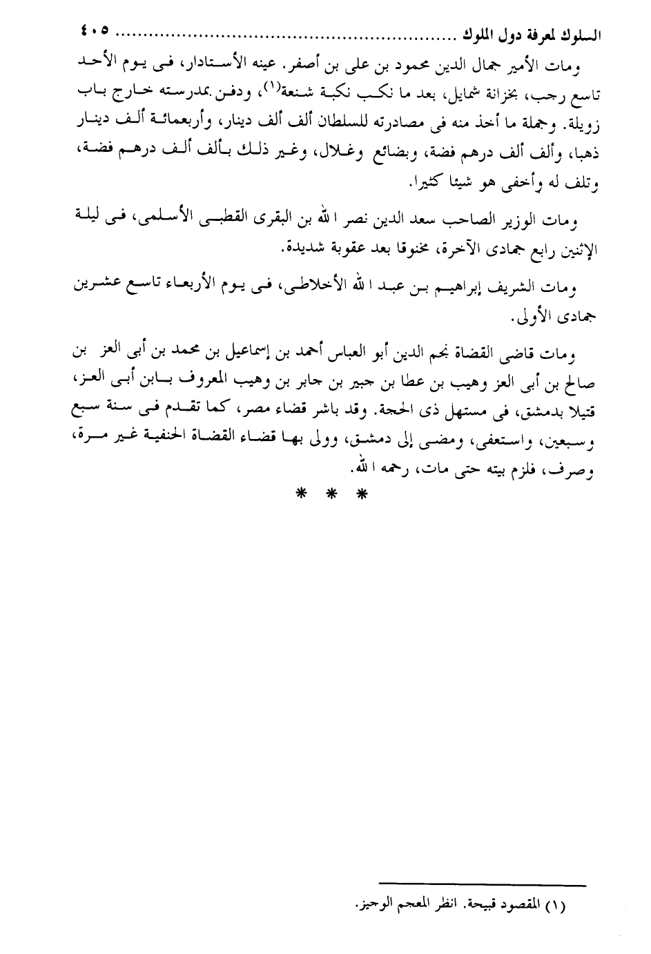 وَمَات الْأَمِير جمال الدّين مَحْمُود بن عَليّ بن أصفر. عينه الأستادار فِي يَوْم الْأَحَد تَاسِع رَجَب بخزانة شمايل بعد مَا نكب نكبة شنعة وَدفن بمدرسته خَارج بَاب زويلة وَجُمْلَة مَا أَخذ مِنْهُ فِي مصادرته للسُّلْطَان ألف ألف دِينَار أَرْبَعمِائَة ألف دِينَار ذَهَبا وَألف ألف دِرْهَم فضَّة وبضائع وغلال وَغير ذَلِك بِأَلف ألف دِرْهَم فضَّة وَتلف لَهُ وأخفي هُوَ شَيْئا كثيرا. وَمَات الْوَزير الصاحب سعد الدّين نصر الله بن البقري القطبي الْأَسْلَمِيّ فِي لَيْلَة الِاثْنَيْنِ رَابِع جُمَادَى الْآخِرَة مخنوقاً بعد عُقُوبَة شَدِيدَة. وَمَات الشريف إِبْرَاهِيم بن عبد الله الأخلاطي فِي يَوْم الْأَرْبَعَاء تَاسِع عشْرين جُمَادَى الأولى. وَمَات قَاضِي الْقُضَاة نجم الدّين أَبُو الْعَبَّاس أَحْمد بن إِسْمَاعِيل بن مُحَمَّد بن أبي الْعِزّ بن صَالح بن أبي الْعِزّ وهيب بن عطا بن جُبَير بن جَابر بن وهيب الْمَعْرُوف بِابْن أبي الْعِزّ قَتِيلا بِدِمَشْق فِي مستهل ذِي الْحجَّة. وَقد بَاشر قَضَاء مصر كَمَا تقدم فِي سنة سبع وَسبعين واستعفى وَمضى إِلَى دمشق، وَولى بهَا قاء الْقُضَاة الْحَنَفِيَّة غير مرّة، وَصرف، فَلَزِمَ بَيته حَتَّى مَاتَ، رَحمَه الله.