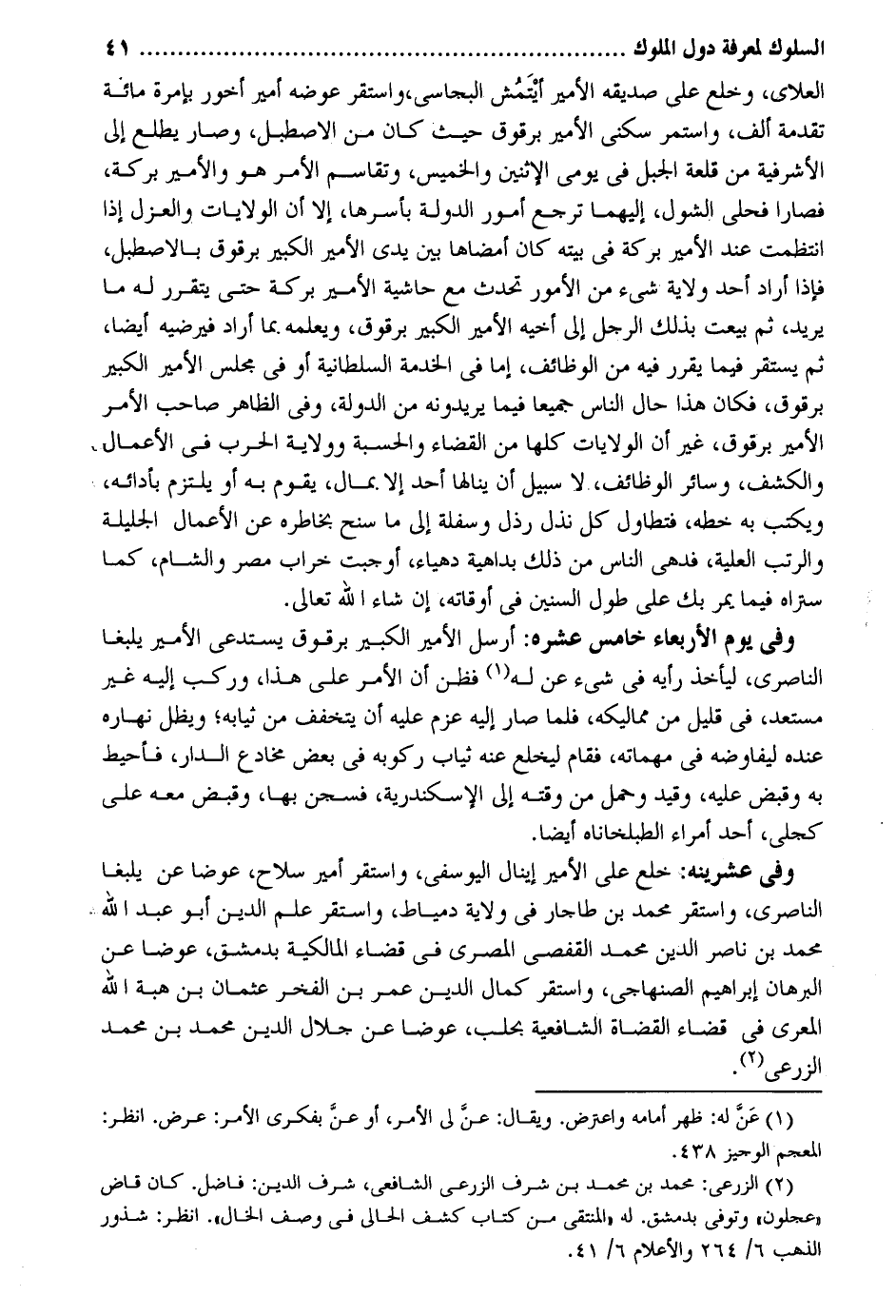 العلاي وخلع على صديقه الْأَمِير أيتمش البجاسي وَاسْتقر عوضه أَمِير آخور بإمرة مائَة تقدمة ألف وَاسْتمرّ سُكْنى الْأَمِير برقوق حَيْثُ كَانَ من الإصطبل وَصَارَ يطلع إِلَى الأشرفية من قلعة الْجَبَل فِي يومي الْإِثْنَيْنِ وَالْخَمِيس وتقاسم الْأَمر هُوَ والأمير بركَة فصارا فحلي الشول إِلَيْهِمَا ترجع أُمُور الدولة بأسرها إِلَّا أَن الولايات والعزل إِذا انتظمت عِنْد الْأَمِير بركَة فِي بَيته كَانَ أمضاها بَين يَدي الْأَمِير الْكَبِير برقوق بالإصطبل فَإِذا أَرَادَ أحد ولَايَة شَيْء من الْأُمُور تحدث مَعَ حَاشِيَة الْأَمِير بركَة حَتَّى يَتَقَرَّر لَهُ مَا يُرِيد ثمَّ بِيعَتْ بذلك الرجل إِلَى أَخِيه الْأَمِير الْكَبِير برقوق ويعلمه. مِمَّا أَرَادَ فيرضيه أَيْضا ثمَّ يسْتَقرّ فِيمَا يُقرر فِيهِ من الْوَظَائِف إِمَّا فِي الْخدمَة السُّلْطَانِيَّة أَو فِي مجْلِس الْأَمِير الْكَبِير برقوق فَكَانَ هَذَا حَال النَّاس جَمِيعًا فِيمَا يريدونه من الدولة وَفِي الظَّاهِر صَاحب الْأَمر الْأَمِير برقوق غير أَن الولايات كلهَا من الْقَضَاء والحسبة وَولَايَة الْحَرْب فِي الْأَعْمَال والكشف وَسَائِر الْوَظَائِف لَا سَبِيل أَن ينالها أحد إلابمال يقوم بِهِ أَو بِأَدَائِهِ وَيكْتب بِهِ خطه فتطاول كل نذل رذل وسفلة إِلَى مَا سنح بخاطره عَن الْأَعْمَال الجليلة والرتب الْعلية فدهى النَّاس من ذَلِك بداهية دهياء أوجبت خراب مصر وَالشَّام كَمَا ستراه فِيمَا يمر بك على طول السنين فِي أوقاته إِن شَاءَ الله تَعَالَى. وَفِي يَوْم الْأَرْبَعَاء خَامِس عشره: أرسل الْأَمِير الْكَبِير برقوق يَسْتَدْعِي الْأَمِير يلبغا الناصري ليَأْخُذ رَأْيه فِي شَيْء عَن لَهُ فَظن أَن الْأَمر على هَذَا وَركب إِلَيْهِ غير مستعد فِي قَلِيل من مماليكه فَلَمَّا صَار إِلَيْهِ عزم عَلَيْهِ أَن يتخفف من ثِيَابه ويظل نَهَاره عِنْده ليفاوضه فِي مهماته فَقَامَ ليخلع عَنهُ ثِيَاب ركُوبه فِي بعض مخادع الدَّار فأحيط بِهِ وَقبض عَلَيْهِ وَقيد وَحمل من وقته إِلَى الْإسْكَنْدَريَّة فسجن بهَا وَقبض مَعَه على كجلي أحد أُمَرَاء الطبلخاناه أَيْضا. وَفِي عشرينه: خلع على الْأَمِير إينال اليوسفي وَاسْتقر أَمِير سلَاح عوضا عَن يلبغا الناصري وَاسْتقر مُحَمَّد بن طاجار فِي ولَايَة دمياط وَاسْتقر علم الدّين أَبُو عبد الله مُحَمَّد بن نَاصِر الدّين مُحَمَّد القفصي الْمصْرِيّ فِي قَضَاء الْمَالِكِيَّة بِدِمَشْق عوضا عَن الْبُرْهَان إِبْرَاهِيم الصنهاجي وَاسْتقر كَمَال الدّين عمر بن الْفَخر عُثْمَان بن هبة الله المعري فِي قَضَاء الْقُضَاة الشَّافِعِيَّة بحلب عوضا عَن جلال الدّين مُحَمَّد بن مُحَمَّد الزرعي.