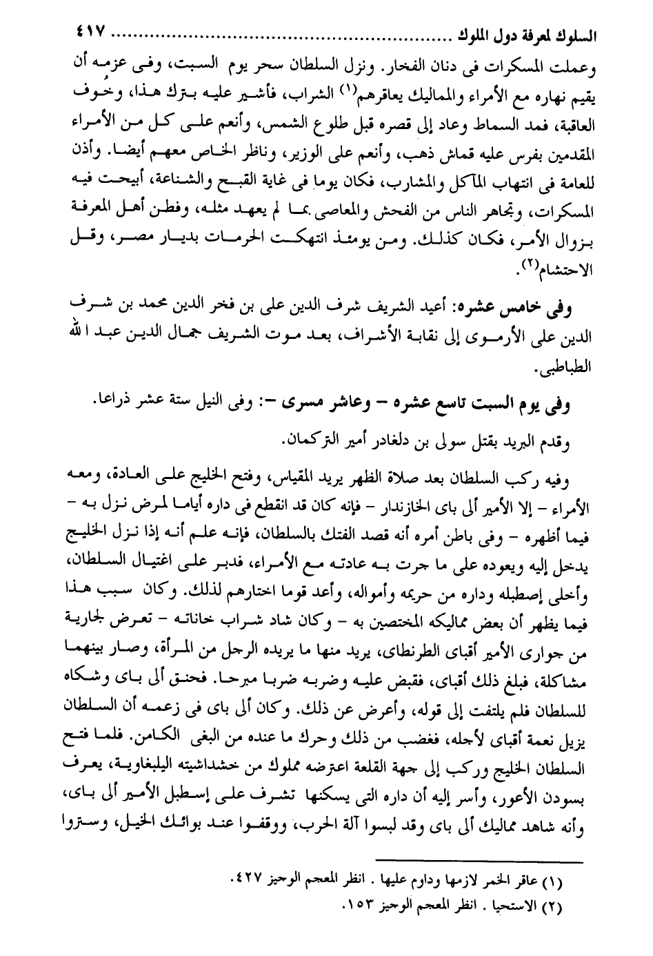 وعملت المسكرات فِي دنان الفخار. ولزل السُّلْطَان سحر يَوْم السبت وَفِي عزمه أَن يُقيم نَهَاره مَعَ الْأُمَرَاء والمماليك يعاقرهم الشَّرَاب فأشير عَلَيْهِ بترك هَذَا وَخَوف الْعَاقِبَة فَمد السماط وَعَاد إِلَى قصره قبل طُلُوع الشَّمْس وأنعم على كل من الْأُمَرَاء المقدمين بفرس عَلَيْهِ قماش ذهب وأنعم على الْوَزير وناظر الْخَاص مَعَهم أَيْضا. وَأذن للعامة فِي انتهاب المآكل والمشارب فَكَانَ يَوْمًا فِي غَايَة الْقبْح والشناعة أبيحت فِيهِ المسكرات وتجاهر النَّاس من الْفُحْش والمعاصي بِمَا لم يعْهَد مثله وفطن أهل الْمعرفَة بِزَوَال الْأَمر فَكَانَ كَذَلِك وَمن وَفِي خَامِس عشره: أُعِيد الشريف شرف الدّين عَليّ بن فَخر الدّين مُحَمَّد بن شرف الدّين عَليّ الأرموي إِلَى نقابة الْأَشْرَاف بعد موت الشريف جمال الدّين عبد الله الطباطبي. وَفِي يَوْم السبت تَاسِع عشره - وعاشر مسرى -: وَفِي النّيل سِتَّة عشر ذِرَاعا. وَقدم الْبَرِيد بقتل سولي بن دلغادر أَمِير التركمان. وَفِيه ركب السُّلْطَان بعد صَلَاة الظّهْر يُرِيد المقياس وَفتح الخليج على الْعَادة وَمَعَهُ الْأُمَرَاء - إِلَّا الْأَمِير أَلِي باي الخازندار - فَإِنَّهُ كَانَ قد انْقَطع فِي دَاره أَيَّامًا لمَرض نزل بِهِ - فِيمَا أظهره - وَفِي بَاطِن أمره أَنه قصد الفتك بالسلطان فَإِنَّهُ علم أَنه إِذا نزل الخليج يدْخل إِلَيْهِ ويعوده على مَا جرت بِهِ عَادَته مَعَ الْأُمَرَاء فدبر على اغتَيال السُّلْطَان وأخلى إصطبله وداره من حريمه وأمواله وَأعد قوما اخْتَارَهُمْ لذَلِك. وَكَانَ سَبَب هَذَا فِيمَا يظْهر أَن بعض مماليكه المختصين بِهِ - وَكَانَ شاد شراب خاناتَه - تعرض لجارية من جواري الْأَمِير أقباي الطرنطاي يُرِيد مِنْهَا مَا يُريدهُ الرجل من الْمَرْأَة وَصَارَ بَينهمَا مشاكلة فَبلغ ذَلِك أقباي فَقبض عَلَيْهِ وضربه ضربا مبرحاً. فحنق آلي باي وشكاه للسُّلْطَان فَلم يلْتَفت إِلَى قَوْله وَأعْرض عَن ذَلِك. وَكَانَ أَلِي باي فِي زَعمه أَن السُّلْطَان يزِيل نعْمَة أقباي لأَجله فَغَضب من ذَلِك وحرك مَا عِنْده من الْبَغي الكامن. فَلَمَّا فتح السُّلْطَان الخليج وَركب إِلَى جِهَة القلعة اعْتَرَضَهُ مَمْلُوك من خشداشيته اليلبغاوية يعرف بسودن الْأَعْوَر وَأسر إِلَيْهِ أَن دَاره الَّتِي يسكنهَا تشرف على إسطبل الْأَمِير أَلِي باي وَأَنه شَاهد مماليك أَلِي باي وَقد لبسوا بدلة الْحَرْب وقفُوا عِنْد بوائك الْخَيل وستروا