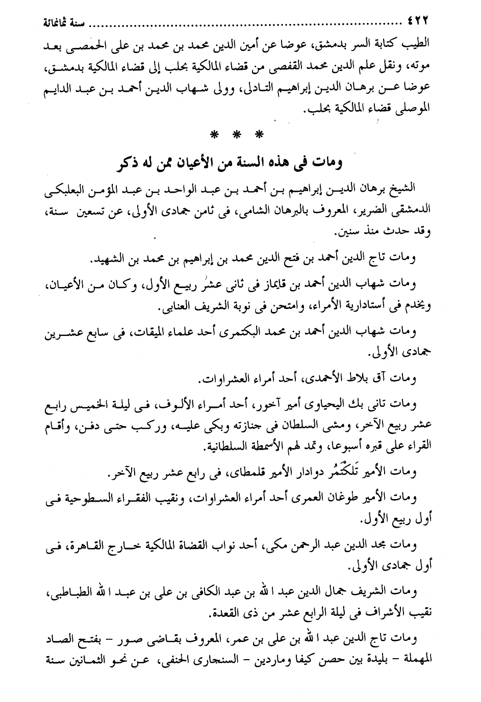 الطّيب كِتَابَة السِّرّ بِدِمَشْق عوضا عَن أَمِين الدّين مُحَمَّد بن مُحَمَّد بن عَليّ الْحِمصِي بعد مَوته وَنقل علم الدّين مُحَمَّد القفصي من قَضَاء الْمَالِكِيَّة بحلب إِلَى قَضَاء الْمَالِكِيَّة بِدِمَشْق عوضا عَن برهَان الدّين إِبْرَاهِيم التادلي وَولى شهَاب الدّين أَحْمد بن عبد الدايم الْموصِلِي قَضَاء الْمَالِكِيَّة بحلب. وَمَات فِي هَذِه السّنة من الْأَعْيَان مِمَّن لَهُ ذكر الشَّيْخ برهَان الدّين إِبْرَاهِيم بن أَحْمد بن عبد الْوَاحِد بن عبد الْمُؤمن البعلبكي الدِّمَشْقِي الضَّرِير الْمَعْرُوف بالبرهان الشَّامي فِي ثامن جُمَادَى الأولى عَن تسعين سنة وَقد حدث مُنْذُ سِنِين. وَمَات تَاج الدّين أَحْمد بن فتح الدّين مُحَمَّد بن إِبْرَاهِيم بن مُحَمَّد بن الشَّهِيد وَمَات شهَاب الدّين أَحْمد بن قايماز فِي ثَانِي عشر ربيع الأول وَكَانَ من الْأَعْيَان ويخدم فِي أستادارية الْأُمَرَاء وامتحن فِي نوبَة الشريف العنابي. وَمَات شهَاب الدّين أَحْمد بن مُحَمَّد البكتمري أحد عُلَمَاء الْمِيقَات فِي سَابِع عشْرين جُمَادَى الأولى. وَمَات آق بلاط الأسعدي أحد أُمَرَاء العشراوات. وَمَات تاني بك اليحياوي أَمِير آخور أحد أُمَرَاء الألوف فِي لَيْلَة الْخَمِيس رَابِع عشر ربيع الآخر وَمَشى السُّلْطَان فِي جنَازَته وَبكى عَلَيْهِ وَركب حَتَّى دفن وَأقَام الْقُرَّاء على قَبره أسبوعاً وتمد لَهُم الأسمطة السُّلْطَانِيَّة. وَمَات الْأَمِير تَلكتمُر دوادار الْأَمِير قلمطاي فِي رَابِع عشر ربيع الآخر. وَمَات الْأَمِير طوغان الْعمريّ أحد أُمَرَاء العشراوات ونقيب الْفُقَرَاء السطوحية فِي أول ربيع الأول. وَمَات مجد الدّين عبد الرَّحْمَن مكي أحد نواب الْقُضَاة الْمَالِكِيَّة خَارج الْقَاهِرَة فِي أول جُمَادَى الأولى. وَمَات الشريف جمال الدّين عبد الله بن عبد الْكَافِي بن عَليّ بن عبد الله الطباطبي نقيب الْأَشْرَاف فِي لَيْلَة الرَّابِع عشر من ذِي الْقعدَة. وَمَات تَاج الدّين عبد الله بن عَليّ بن عمر الْمَعْرُوف بقاضي صور - بِفَتْح الصَّاد الْمُهْملَة - بليدَة بَين حصن كيفا وماردين - السنجاري الْحَنَفِيّ عَن نَحْو الثَّمَانِينَ سنة