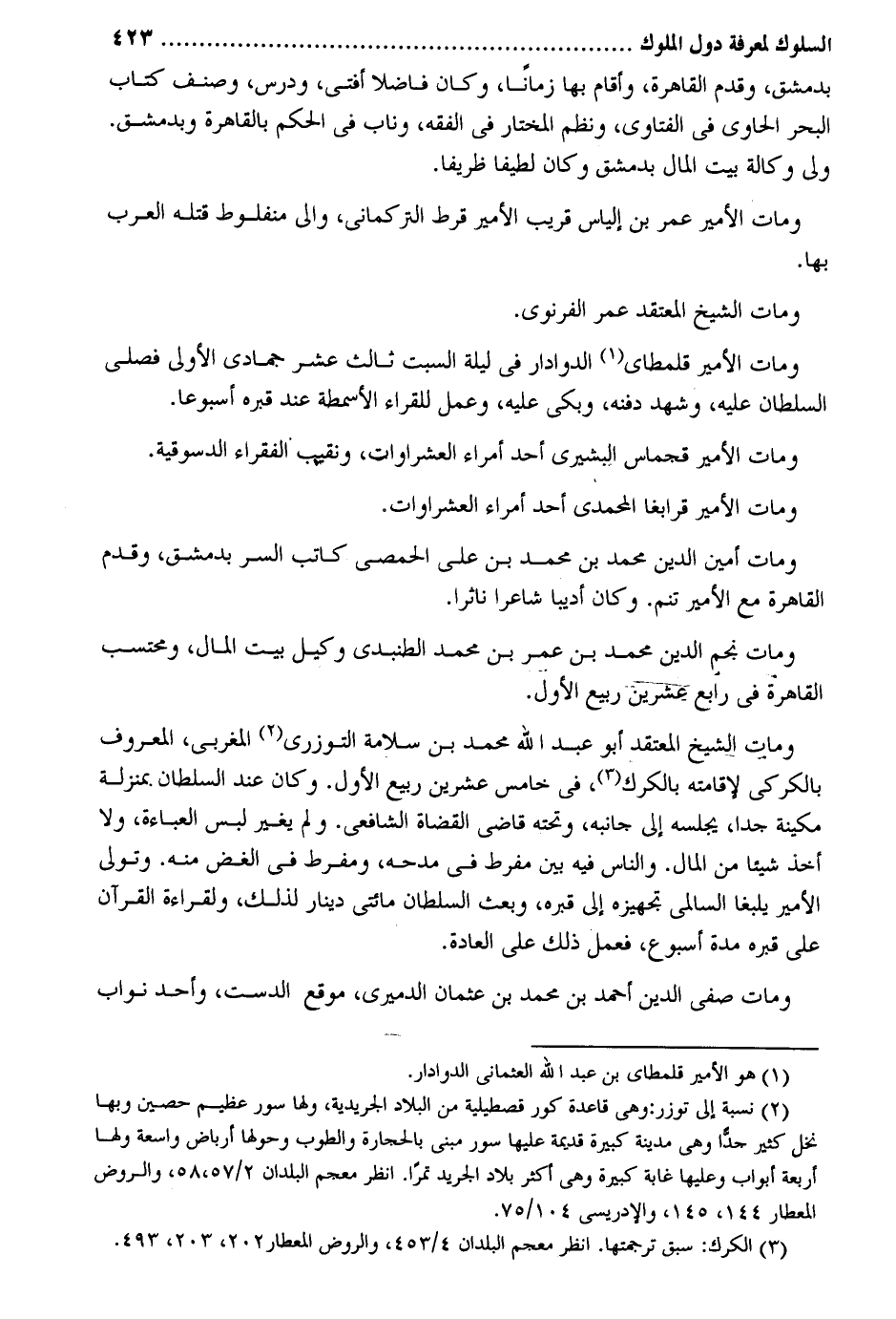بِدِمَشْق وَقدم الْقَاهِرَة وَأقَام بهَا زَمَانا وَكَانَ فَاضلا أفتى ودرس وصنف كتاب الْبَحْر الْحَاوِي فِي الْفَتَاوَى ونظم الْمُخْتَار فِي الْفِقْه وناب فِي الحكم بالقاهرةْ وبدمشق. ولي وكَالَة بَيت المَال بِدِمَشْق وَكَانَ لطيفاً ظريفاً. وَمَات الْأَمِير عمر بن إلْيَاس قريب الْأَمِير قرط التركماني وَالِي منفلوط قَتله الْعَرَب بهَا. وَمَات الشَّيْخ المعتقد عمر الفرنوي. وَمَات الْأَمِير قلمطاي الدوادار فِي لَيْلَة السبت ثَالِث عشر جُمَادَى الأولى فصلى السُّلْطَان عَلَيْهِ وَشهد دَفنه وَبكى عَلَيْهِ وَعمل للقراء الأسمطة عِنْد قَبره أسبوعاً. وَمَات الْأَمِير قجماس البشيري أحد أُمَرَاء العشراوات ونقيب الْفُقَرَاء الدسوقية. وَمَات الْأَمِير قرابغا المحمدي أحد أُمَرَاء العشراوات. وَمَات أَمِين الدّين مُحَمَّد بن مُحَمَّد بن عَليّ الْحِمصِي كَاتب السِّرّ بِدِمَشْق وَقدم الْقَاهِرَة مَعَ الْأَمِير تنم. وَكَانَ أديباً شَاعِرًا ناثراً. وَمَات نجم الدّين مُحَمَّد بن عمر بن مُحَمَّد الطنبدي وَكيل بَيت المَال ومحتسب الْقَاهِرَة فِي رَابِع عشْرين ربيع الأول. وَمَات الشَّيْخ المعتقد أَبُو عبد الله مُحَمَّد بن سَلامَة التوزري المغربي الْمَعْرُوف بالكركي لإقامته بالكرك فِي خَامِس عشْرين ربيع الأول. وَكَانَ عِنْد السُّلْطَان بِمَنْزِلَة مكينة جدا يجلسه إِلَى جَانِبه وَتَحْته قَاضِي الْقُضَاة الشَّافِعِي وَلم يُغير لبس العباءة وَلَا أَخذ شَيْئا من المَال. وَالنَّاس فِيهِ بَين مفرط فِي مدحه ومفرط فِي الغض مِنْهُ. وَتَوَلَّى الْأَمِير يلبغا السالمي تَجْهِيزه إِلَى قَبره وَبعث السُّلْطَان مِائَتي دِينَار لذَلِك ولقراءة الْقُرْآن على قَبره مُدَّة أُسْبُوع فَعمل ذَلِك على الْعَادة. وَمَات صفي الدّين أَحْمد بن مُحَمَّد بن عُثْمَان الْحِمْيَرِي موقع الدست وَأحد نواب