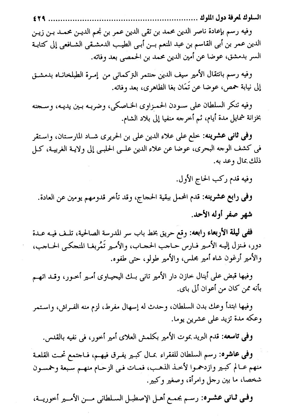 وَفِيه رسم بِإِعَادَة نَاصِر الدّين مُحَمَّد بن تَقِيّ الدّين عمر بن نجم الدّين مُحَمَّد بن زين الدّين عمر بن أبي الْقَاسِم بن عبد الْمُنعم بن أبي الطّيب الدِّمَشْقِي الشَّافِعِي إِلَى كِتَابَة السِّرّ بِدِمَشْق عوضا عَن أَمِين الدّين مُحَمَّد بن الْحِمصِي بعد وَفَاته. وَفِيه رسم بانتقال الْأَمِير سيف الدّين جنتمر التركماني من إمرة الطبلخاناه بِدِمَشْق فِي نِيَابَة حمص عوضا عَن تَمَان بغا الظَّاهِرِيّ بعد وَفَاته. وَفِيه تنكر السُّلْطَان على سودن الحمزاوي الخاصكي وضربه بَين يَدَيْهِ وسجنه بخزانة شمايل عدَّة أَيَّام ثمَّ أخرجه منفياً إِلَى بِلَاد الشَّام. وَفِي ثَانِي عشرينه: خلع على عَلَاء الدّين على بن الحريري شاد المارستان وَاسْتقر كشف الْوَجْه البحري عوضا عَن عَلَاء الدّين عَليّ الْحلَبِي إِلَى ولَايَة الغربية كل ذَلِك بِمَال وعد بِهِ. وَفِيه قدم ركب الْحَاج الأول. وَفِي رَابِع عشرينه: قدم الْمحمل بِبَقِيَّة الْحجَّاج وَقد تَأَخّر قدومهم يَوْمَيْنِ عَن الْعَادة. شهر صفر أَوله الْأَحَد. فَفِي لَيْلَة الْأَرْبَعَاء رابعه: وَقع حريق بِخَط بَاب سر الْمدرسَة الصالحية تلف فِيهِ عدَّة دور فَنزل إِلَيْهِ الْأَمِير فَارس حَاجِب الْحجاب والأمير تَمُربغا المنجكي الْحَاجِب الْأَمِير أرغون شاه وفيهَا قبض على أينال خَازِن دَار الْأَمِير تاني بك اليحياوي أَمِير أخور وَقد اتهمَ أَنه مِمَّن كَانَ من أعوان أَلِي باي. وفيهَا ابْتَدَأَ وعك بدن السُّلْطَان وَحدث لَهُ إسهال مفرط لزم مِنْهُ الْفراش وَاسْتمرّ وعكه مُدَّة تزيد على عشْرين يَوْمًا. وَفِي تاسعه: قدم الْبَرِيد بِمَوْت الْأَمِير بكلمش العلاي أَمِير أخور فِي نَفْيه بالقدس. وَفِي عاشره: رسم السُّلْطَان للْفُقَرَاء بِمَال كَبِير يفرق فيهم فَاجْتمع تَحت القلعة مِنْهُم عَالم كَبِير وازدحموا لأخذ الذَّهَب فَمَاتَ فِي الزحام مِنْهُم سَبْعَة وَخَمْسُونَ شخصا مَا بَين رجل وَامْرَأَة وصغير وكبير. وَفِي ثَانِي عشره: رسم بِجمع أهل الإصطبل السلطاني من الْأَمِير أخورية