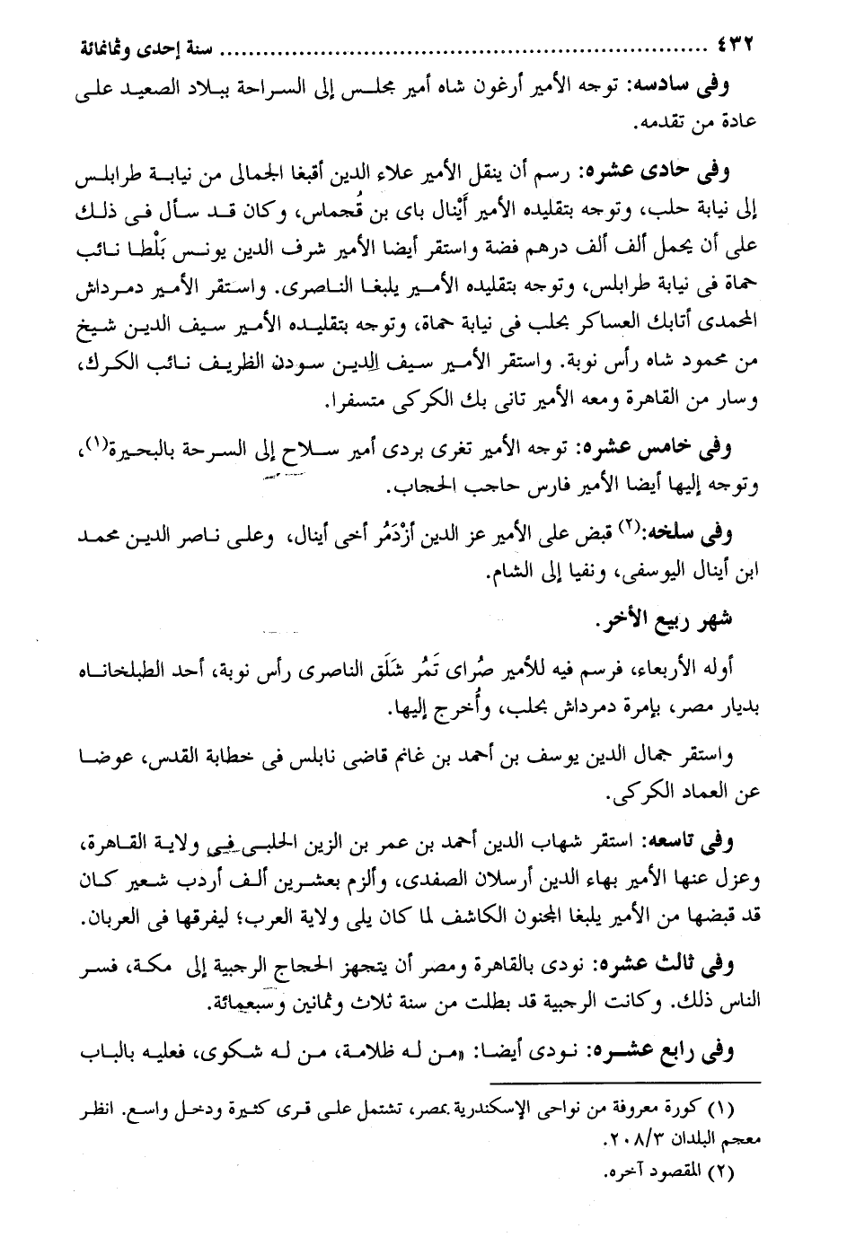 وَفِي سادسه: توجه الْأَمِير أرغون شاه أَمِير مجْلِس إِلَى السراحة بِبِلَاد الصَّعِيد على عَادَة من تقدمه. وَفِي حادي عشره: رسم أَن ينْقل الْأَمِير عَلَاء الدّين أقبغا الجمالي من نِيَابَة طرابلس إِلَى نِيَابَة حلب وَتوجه بتقليده الْأَمِير أينال باي بن قُجماس وَكَانَ قد سَأَلَ فِي ذَلِك على أَن يحمل ألف ألف دِرْهَم فضَّة وَاسْتقر أَيْضا الْأَمِير شرف الدّين يُونُس بَلْطا نَائِب حماة فِي نِيَابَة طرابلس وَتوجه بتقليده الْأَمِير يلبغا الناصري. واستر الْأَمِير دمرداش المحمدي أتابك العساكر بحلب فِي نِيَابَة حماة وَتوجه بتقليده الْأَمِير سيف الدّين شيخ من مَحْمُود شاه رَأس نوبَة. وَاسْتقر الْأَمِير سيف اِلدين سودن الظريف نَائِب الكرك وَسَار من الْقَاهِرَة وَمَعَهُ الْأَمِير تاني بك الكركي متسفراً. وَفِي خَامِس عشره. توجه الْأَمِير تغري بردي أَمِير سلَاح إِلَى السرحة بالبحيرة وَتوجه إِلَيْهَا أَيْضا الْأَمِير فَارس حَاجِب الْحجاب. وَفِي سلخه: قبض على الْأَمِير عز الدّين أزْدَمُر أخي أينال وعَلى نَاصِر الدّين مُحَمَّد بن أينال اليوسفي ونفيا إِلَى الشَّام. شهر ربيع الآخر. أَوله الْأَرْبَعَاء فرسم فِيهِ للأمير صُراي تَمُر شَلَق الناصري رَأس نوبَة أحد الطبلخاناه بديار مصر بإمرة دمرداش بحلب وأُخرج إِلَيْهَا. وَاسْتقر جمال الدّين يوسفي بن أَحْمد بن غَانِم قَاضِي نابلس فِي خطابة الْقُدس عوضا عَن الْعِمَاد الكركي. وَفِي تاسعه: اسْتَقر شهَاب الدّين أَحْمد بن عمر بن الزين الْحلَبِي - فِي ولَايَة الْقَاهِرَة وعزل عَنْهَا الْأَمِير بهاء الدّين أرسلان الصَّفَدِي وألزم بِعشْرين ألف أردب شعير كَانَ قد قبضهَا من الْأَمِير يلبغا الْمَجْنُون الكاشف لما كَانَ يَلِي ولَايَة الْعَرَب ليفرقها فِي العربان. وَفِي ثَالِث عشره: نُودي بِالْقَاهِرَةِ ومصر أَن يتجهز الْحجَّاج الرجبية إِلَى مَكَّة فسر النَّاس ذَلِك. وَكَانَت الرجبية قد بطلت من سنة ثَلَاث وَثَمَانِينَ وَسَبْعمائة. وَفِي رَابِع عشره: نُودي أَيْضا: من لَهُ ظلامة من لَهُ شكوى فَعَلَيهِ بِالْبَابِ