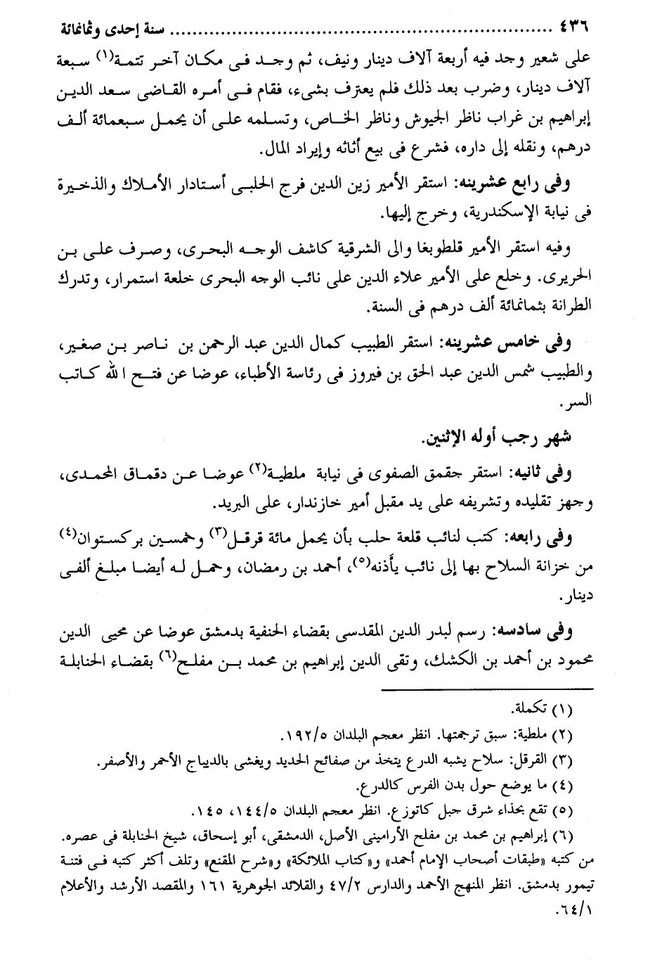 على شعير وجد فِيهِ أَرْبَعَة آلَاف دِينَار ونيف ثمَّ وجد فِي مَكَان آخر تَتِمَّة سَبْعَة آلَاف دِينَار وَضرب بعد ذَلِك فَلم يعْتَرف بِشَيْء فَقَامَ فِي أمره القَاضِي سعد الدّين إِبْرَاهِيم بن غراب نَاظر الجيوش وناظر الْخَاص وتسلمه على أَن يحمل سَبْعمِائة ألف دِرْهَم وَنَقله إِلَى دَاره فشرع فِي بيع أثاثه وايراد المَال. وَفِي رَابِع عشرينه: اسْتَقر الْأَمِير زين الدّين فرج الْحلَبِي أستادار الْأَمْلَاك والذخيرة فِي نِيَابَة الْإسْكَنْدَريَّة وَخرج إِلَيْهَا. وَفِيه اسْتَقر الْأَمِير قلطوبغا وَالِي الشرقية كاشف الْوَجْه البحري وَصرف عَليّ بن الحريري. وخلع على الْأَمِير عَلَاء الدّين على نَائِب الْوَجْه البحري خلعة اسْتِمْرَار وتدرك الطرانة بثمانمائة ألف دِرْهَم فِي السّنة. وَفِي خَامِس عشرينه: اسْتَقر الطَّبِيب كَمَال الدّين عبد الرَّحْمَن بن نَاصِر بن صَغِير والطبيب شمس الدّين عبد الْحق بن فَيْرُوز فِي رئاسة الْأَطِبَّاء عوضا عَن فتح الله كاتَب السِّرّ. شهر رَجَب أَوله الِاثْنَيْنِ. وَفِي ثَانِيه: اسْتَقر جقمق الصفوي فِي نِيَابَة ملطية عوضا عَن دقماق المحمدي وجهز تَقْلِيده وتشريفه على يَد مقبل أَمِير خازندار على الْبَرِيد. وَفِي رابعه: كتب لنائب قلعة حلب بِأَن يحمل مائَة قرقل وَخمسين بركستوان من خزانَة السِّلَاح بهَا إِلَى نَائِب يأذنه أَحْمد بن رَمَضَان وَحمل لَهُ أَيْضا مبلغ ألفي دِينَار. وَفِي سادسه: رسم لبدر الدّين الْمَقْدِسِي بِقَضَاء الْحَنَفِيَّة بِدِمَشْق عوضا عَن محيي الدّين مَحْمُود بن أَحْمد بن الكشك وتقي الدّين إِبْرَاهِيم بن مُحَمَّد بن مُفْلِح بِقَضَاء الْحَنَابِلَة