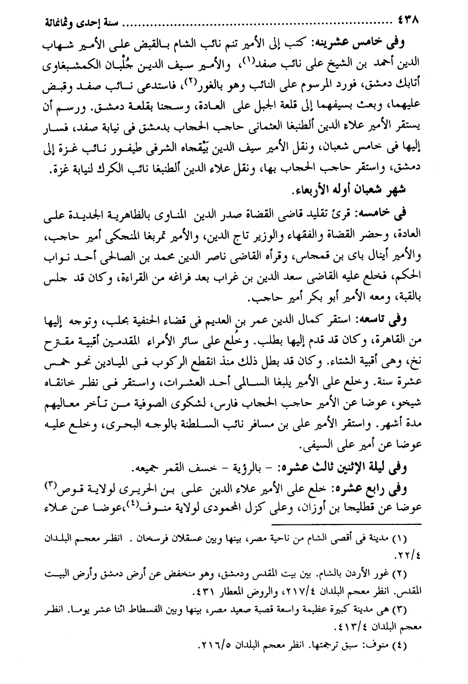 وَفِي خَامِس عشرينه: كتب إِلَى الْأَمِير تنم نَائِب الشَّام بِالْقَبْضِ على الْأَمِير شهَاب الدّين أَحْمد بن الشَّيْخ على نَائِب صفد والأمير سيف الدّين جُلْبان الكمشبغاوي أتابك دمشق فورد المرسوم على النَّائِب وَهُوَ بالغور فاستدعى نَائِب صفد وَقبض عَلَيْهِمَا وَبعث بسيفهما إِلَى قلعة الْجَبَل على الْعَادة وسجنا بقلعة دمشق. ورسم أَن يسْتَقرّ الْأَمِير عَلَاء الدّين ألطبغا العثماني حَاجِب الْحَاجِب بِدِمَشْق فِي نِيَابَة صفد فَسَار إِلَيْهَا فِي خَامِس شعْبَان وَنفل الْأَمِير سيف الدّين بَيقجاه الشرفي طيفور نَائِب غَزَّة إِلَى دمشق وَاسْتقر حَاجِب الْحجاب بهَا وَنفل عَلَاء الدّين ألطبغا نَائِب الكرك لنيابة غَزَّة. شهر شعْبَان أَوله الْأَرْبَعَاء. فِي خامسه: قرئَ تَقْلِيد قَاضِي الْقُضَاة صدر الدّين الْمَنَاوِيّ بالظاهرية الجديدة على الْعَادة وَحضر الْقُضَاة وَالْفُقَهَاء والوزير تَاج الدّين والأمير تمربغا المنجكي أَمِير حَاجِب والأمير أينال باي بن قمجاس وقرأه القَاضِي نَاصِر الدّين مُحَمَّد بن الصَّالِحِي أحد نواب الحكم فَخلع عَلَيْهِ القَاضِي سعد الدّين بن غراب بعد فَرَاغه من الْقِرَاءَة وَكَانَ قد جلس بالقبة وَمَعَهُ الْأَمِير أَبُو بكر أَمِير حَاجِب. وَفِي تاسعه: اسْتَقر كَمَال الدّين عمر بن العديم فِي قَضَاء الْحَنَفِيَّة بحلب وَتوجه إِلَيْهَا من الْقَاهِرَة وَكَانَ قد قدم إِلَيْهَا بِطَلَب. وخلع على سَائِر الْأُمَرَاء المقدمين أقبية مقترح نخ وَهِي أقبية الشتَاء. وَكَانَ قد بَطل ذَلِك مُنْذُ انْقَطع الرّكُوب فِي الميادين نَحْو خمس عشرَة سنة. وخلع على الْأَمِير يلبغا السالمي أحد العشرات وَاسْتقر فِي نظر خانقاه شيخو عوضا عَن الْأَمِير حَاجِب الْحجاب فَارس لشكوى الصُّوفِيَّة من تَأَخّر معاليهم مُدَّة أشهر. وَاسْتقر الْأَمِير عَليّ بن مُسَافر نَائِب السلطنة بِالْوَجْهِ البحري وخلع عَلَيْهِ عوضا عَن أَمِير عَليّ السيفي. وَفِي لَيْلَة الِاثْنَيْنِ ثَالِث عشره: - بِالرُّؤْيَةِ - خسف الْقَمَر جميِعه. وَفِي رَابِع عشره: خلع على الْأَمِير عَلَاء الدّين عَليّ بن الحريري لولاية قوص عوضا عَن قطليجا بن أوزان وعَلى كزل المحمودي لولاية منوف عوضا عَن عَلَاء